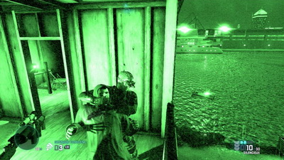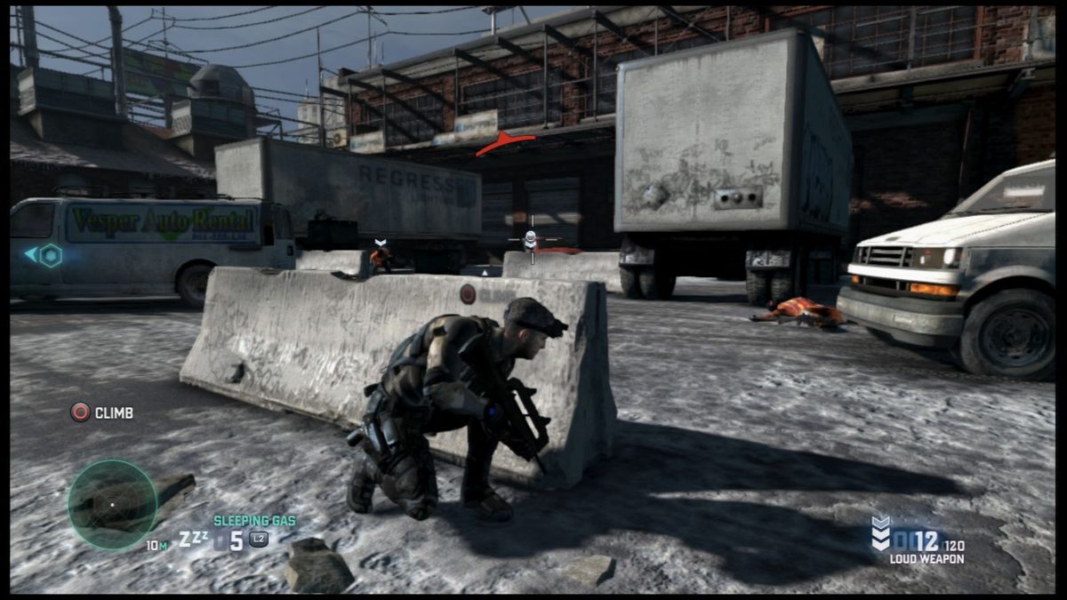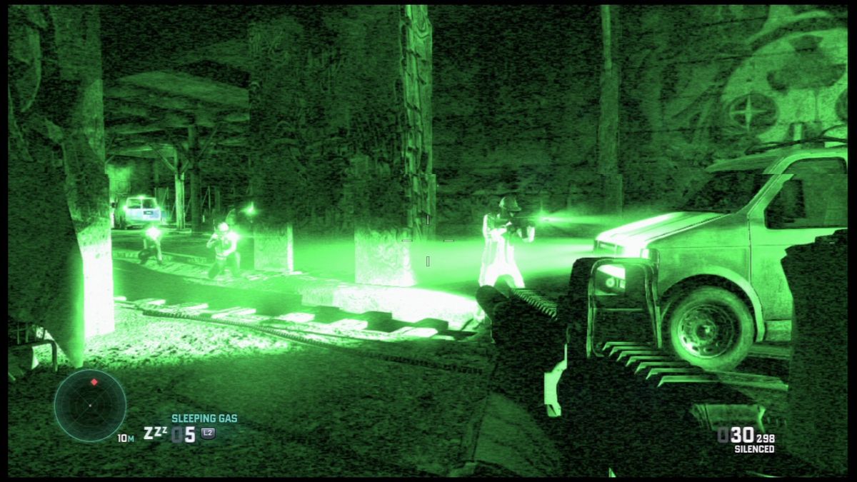 D'ailleurs dans l'auto-plagiat, il faut savoir que Fisher est plus alerte que jamais : un vrai petit singe ! Il est capable de tout escalader, à croire que Prince of Persia lui a donné quelques leçons. Question armement, l'équipement de base est assez moisi mais très vite, suite à quelques achats/améliorations, on obtiendra un matériel de bien meilleure qualité. Sam dispose d'une arme de poing (généralement avec silencieux), d'une arme lourde et d'une arme non létale (taser ou arbalète) en vue d'extrader un ennemi à interroger (ce qui rapporte bien entendu, de l'argent supplémentaire, à l'image de ces PCs portables à pirater). On peut également échanger son matos pour les armes laissées par les ennemis, on retrouve les exécutions automatisées (celles apparues dans Conviction), on peut déplacer les cadavres, on retrouve la mise à couvert, les actions contextuelles et même le "ghost" (fantôme) de notre dernière position connue par l'adversité.