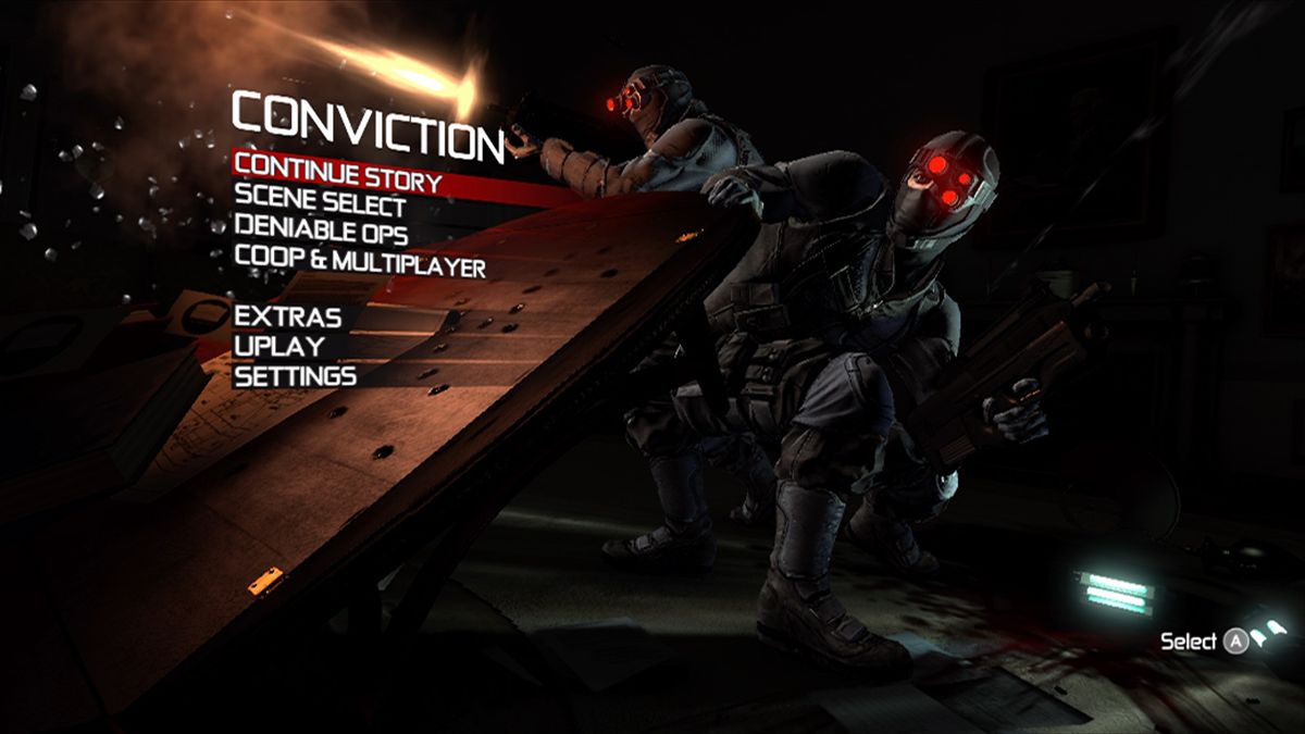 A côté de ça, les combats ont une pêche jamais vue pour la série et Sam a désormais le bon goût de pouvoir échanger ses pétoires avec les armes ennemies et de prendre les munitions compatibles. Enfin (j'ai enfin de dire), il était grand temps car je ne compte plus les fois où je me suis retrouvé à sec dans les 4 précédentes aventures. C'est bon pour le fun mais c'est aussi d'une logique et d'un bon sens, qui semble avoir mis beaucoup de temps à atteindre le cerveau des employés d'Ubisoft. Autre point bien agréable, il arrive qu'on puisse tendre des pièges aux ennemis. Par exemple faire tomber un moteur d'avion ou un énorme lustre, c'est un moyen simple et rapide de s'en débarrasser. Encore un changement, Conviction nous impose des "défis SPEC" (genre faire 5 headshots) qui donnent à leur tour des points d'améliorations.