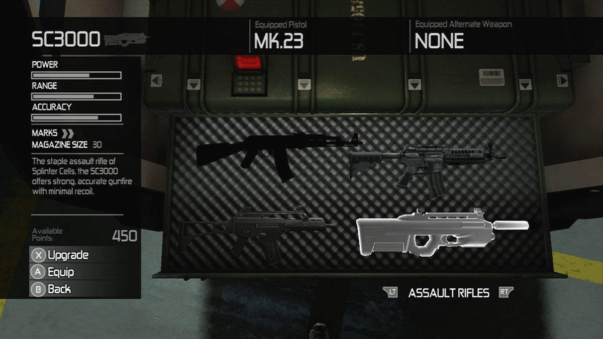 Ces points sont ensuite utilisable pour booster ses armes : précision, puissance, stabilité... ça rappelle Resident Evil 4, les critères sont variés et dépendent de l'arme choisie. D'ailleurs, les "dépôts d'armes" sont une belle nouveauté. Si Sam est limité à 2 armes, le flingue a des munitions infinies mais l'arme d'assaut non. Revenir au dépôt sert donc à faire le plein mais aussi avoir la possibilité de changer son arsenal. Et pour la première fois, on ne nous imposera plus nos pétoires : au fil du jeu on aura de plus en plus de choix entre armes réellement puissantes (fusil à pompe, M4, Desert Eagle, USP45, AK-47) et d'autres plus silencieuses (MP5, MK.23 ou encore l'excellent SC3000, une sorte de FN F2000 Tactical modifié).