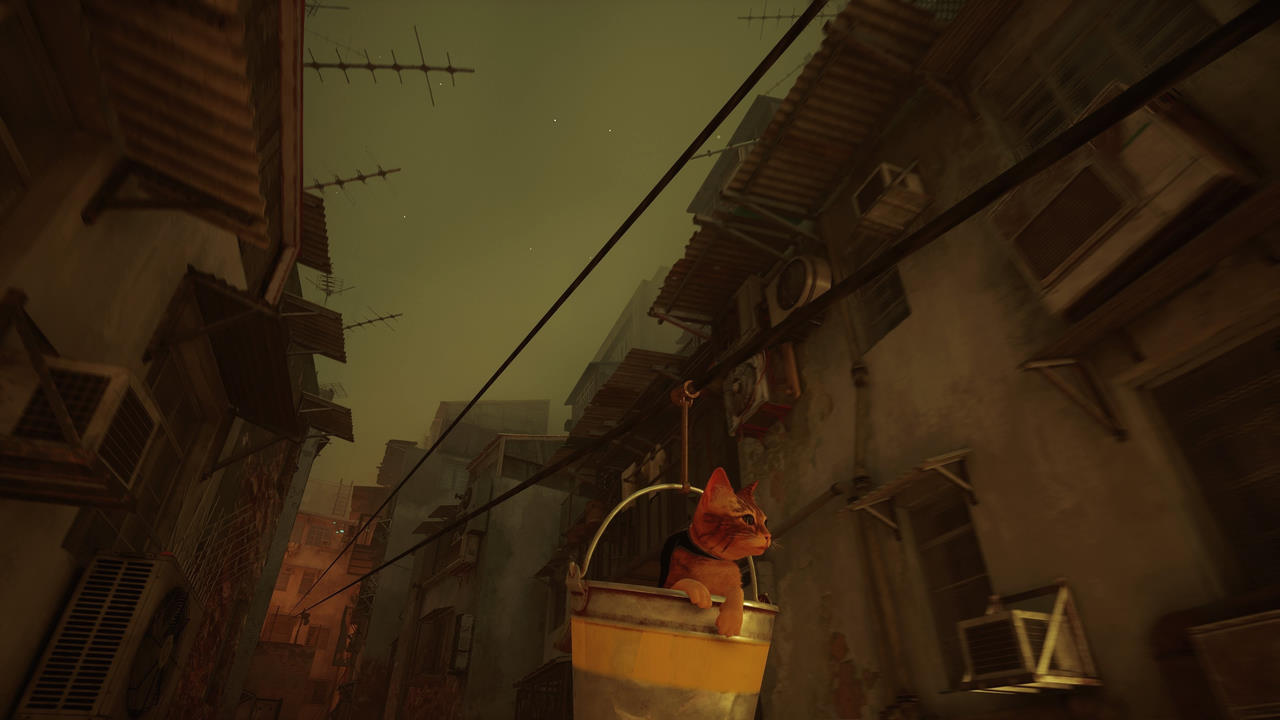 Techniquement, le jeu est vraiment joli, dépaysant, parfois même poétique et ennivrant :) est très difficile à trouver, d'ailleurs je n'ai pas eu de confirmation, mais visiblement Stray utilise le moteur physique inclus à l'Unreal Engine 4, à savoir le très bon PhysX, qui appartient désormais à nVidia. Le moteur physique est savamment utilisé dans ce jeu puisque notre chacha poussera les herbes en marchant dans la nature, il bousculera les bouteilles vides, fera tomber divers objets, et passera même délicatement entre les fils à boules d'un rideau anti-mouches. A part ça, Stray est un jeu envoûtant, fascinant, dépaysant... hormis les courses poursuites avec les Zurks, c'est la belle vie pour notre boule de poils, qui grimpe un peu partout, dans des décors qui ont toujours beaucoup de cachet et de charme. Bien entendu, on reste sur une production indépendante, il ne faut trop s'attacher sur certains détails comme des textures qui s'enchevêtrent de temps en temps, ou un certain manque de finesse par ci par là. En attendant, difficile de ne pas être séduit par la proposition de cette balade cyberpunk aux atours parfois poétiques.
