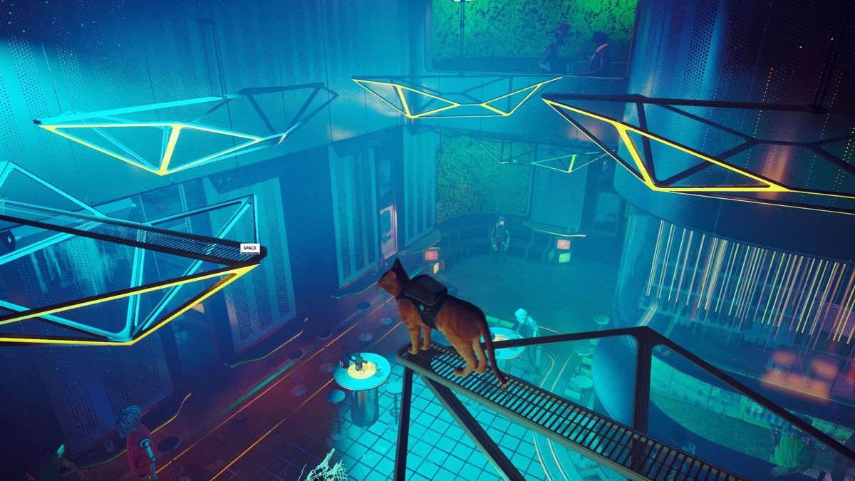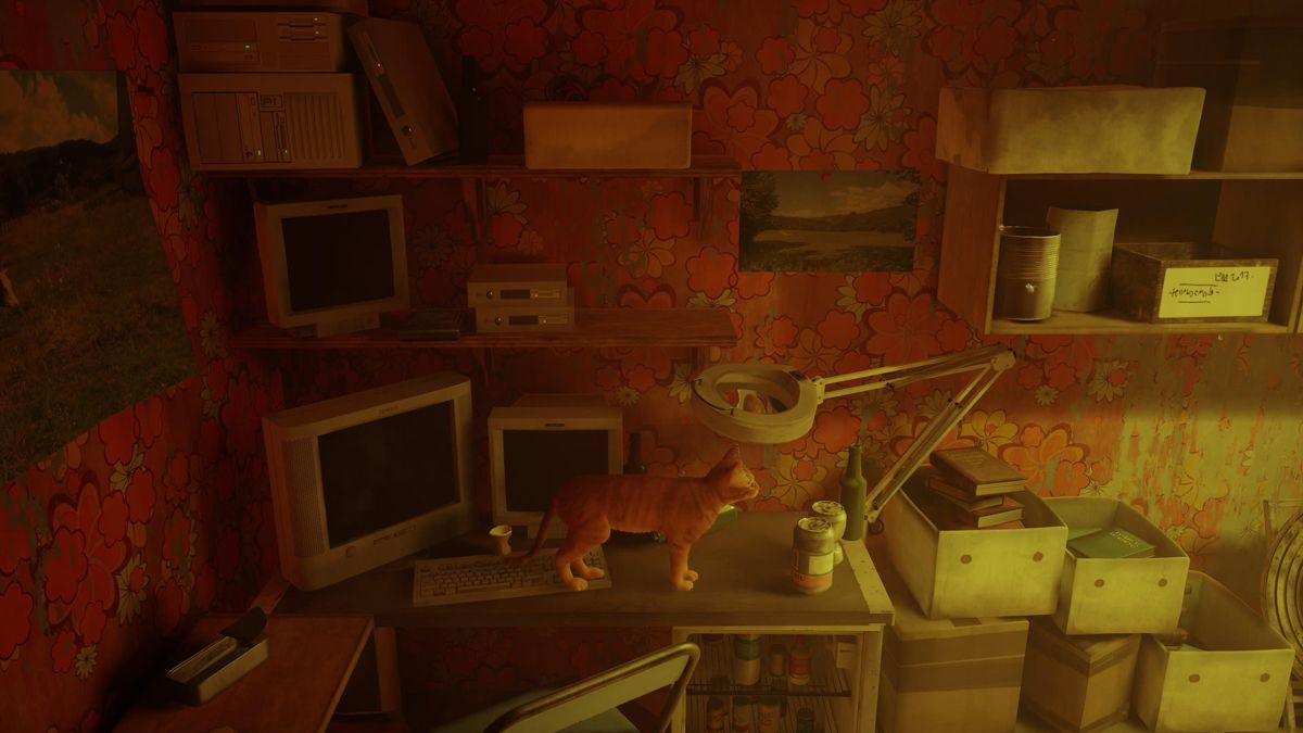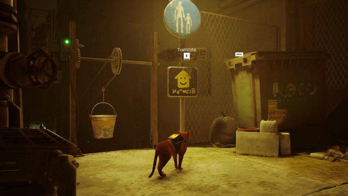 Premier point, vous aurez sûrement remarqué que le nom B-12 est relié à celui du studio (BlueTwelve). 2e point, la narration est très "environnementale" (un mot à la mode), dans le sens où c'est souvent le décor qui, passivement, raconte une partie de l'histoire. Heureusement B-12 pourra aussi traduire le charabia des robots qui, au fil du temps, ont développé leur propre langage. Notez par ailleurs que les Smartphones actuels et les PC portables adoreraient avoir les batteries de ces humanoïdes qui se prétendent immortels, sans jamais se recharger. Autre consensus, il est acquis que le chat comprenne (et sait lire) le langage humain dans le sens où B-12 lui traduit les textes. Le chat étant contrôlé par nous, nous sommes donc le chat, évitons de trop nous prendre la tête avec des notions de réalisme qui n'ont pas toujours lieu d'être dans un jeu vidéo. Au fond, l'histoire de Stray est sympathique mais sincèrement, elle ne vous arrachera pas une larme, ni ne vous impressionnera par sa profondeur. L'écriture est sympa, l'histoire est agréable à suivre, mais il n'y a rien de réellement remarquable. Peut-être est-ce voulu, dans le sens où le jeu veut également séduire un public assez jeune.
