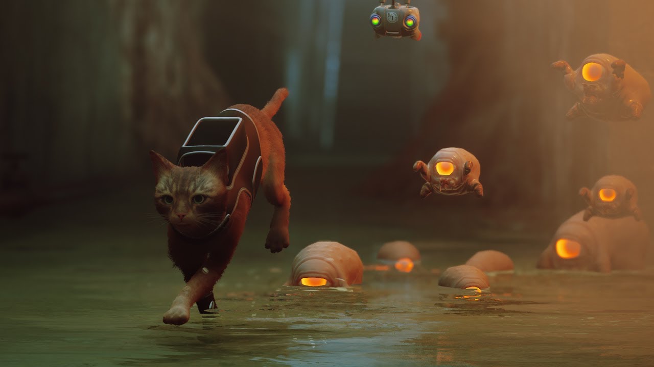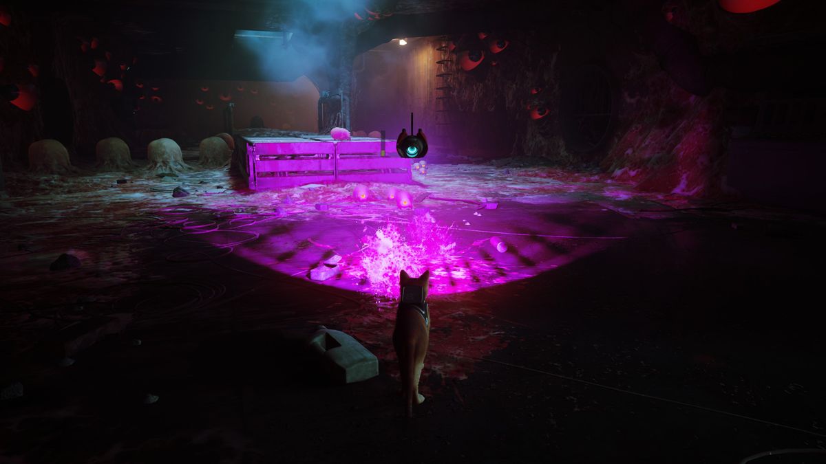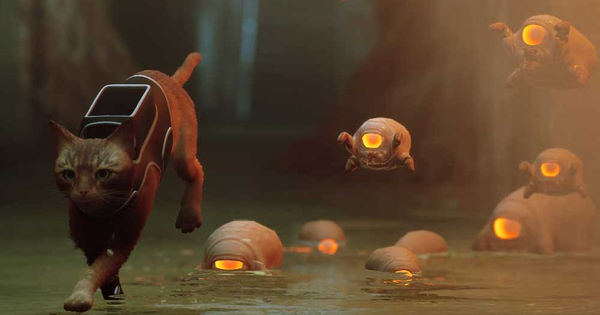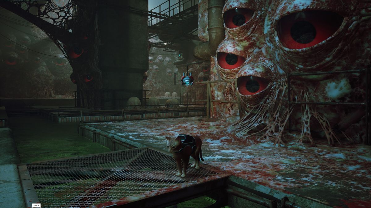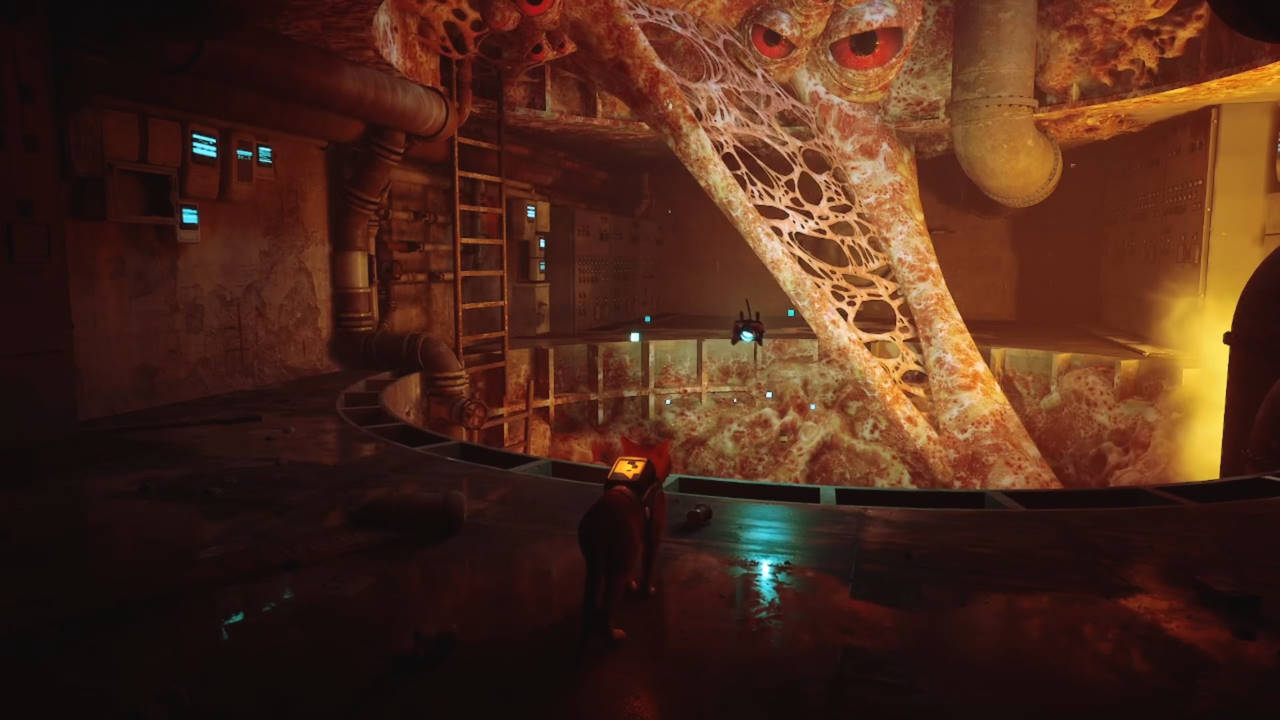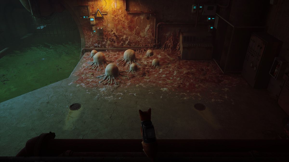 Les rencontres avec les Zurks sont les seuls points un peu difficiles du jeu. Mais il n'y a rien d'insurmontable, je vous rassure... son côté B-12 a son utilité : en plus de tout nous traduire, il peut allumer la lumière, numériser les objets trouvés et pirater certains terminaux. Il peut également nous protéger des Zurks (je vais y revenir) grâce au Defluxor, une arme anti-Zurk qui les fait exploser (mais l'action reste de courte durée afin de ne pas en abuser). En effet, Stray est un jeu d'exploration, tel un chat qui (en silence) se promène partout où son agilité lui permet de se faufiler. Se balader est un vrai plaisir, on aime découvrir de nouveaux lieux, déjouer des petits pièges intelligemment mis en place car les énigmes ne sont jamais tordues, elles tombent sous le sens, elles sont logiques et plus agréables à déjouer que de véritables épreuves super pénibles où il faut une soluce sous la main car on y comprend strictement rien (il faut se rappeler que le jeu reste adapté à un public jeune). Au final, les seuls points difficiles du titre, ce sont les Zurks... qu'il faut les fuir comme la peste ! Ces bestioles ont un design qui mélange le morpion géant et le crabe de tête tout droit sorti d'Half-Life (d'ailleurs leur attitude nous rappelle ces derniers).
