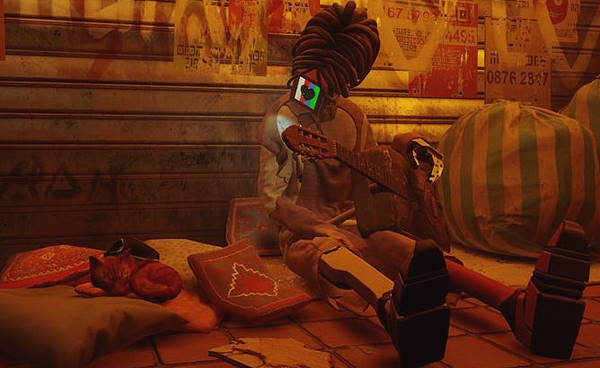 Et ils sont voraces ! Sans le Defluxor il n'y a qu'une solution : fuir ! Des courses poursuites finalement assez simples, un peu stressantes, mais rarement frustrantes. Enfin, Stray nous propose des petites missions secondaires. En effet, la ville principale est un petit monde ouvert (il y en a d'autres, plus modestes) et on peut y passer des heures à chercher le moindre objet utile. Ramener les 8 partitions de musiques au musicos du coin, ramener 3 fleurs à la botaniste, trouver tous les souvenirs de B-12... s'il est toujours sympa de voir que certains actes peuvent avoir des conséquences, au fond ce sont ces petites missions secondaires qui allongent la durée de vie et apportent quelques éléments narratifs supplémentaires. Malheureusement, hormis le plaisir de la complétion, ça ne sert strictement à rien.