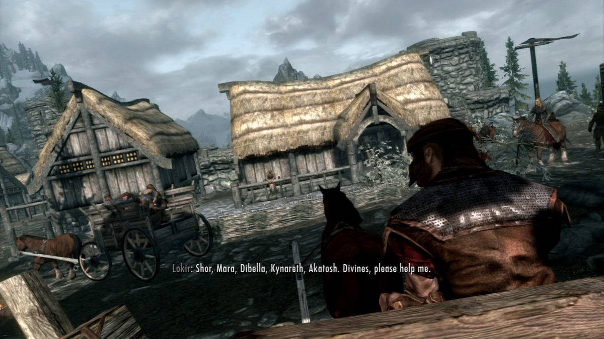 Tout commence sur une charrette qui tangue, prisonnier de l'empire. Quelques répliques échangées avec un autre prisonnier plus bavard que les autres, chemin faisant il nous renseigne un peu sur la situation politique de la contrée froide qui déjà s'offre à notre regard : Bordeciel (Skyrim en VO). Suite à une scène de mise à mort immersive, notre libération sera violente et sanglante, voir même impressionnante. Skyrim pose une sacrée ambiance dès le départ, mettant son atout majeur en avant : le retour des dragons. Le statuquo du prologue rappelle inexorablement les autres Elder Scrolls, dont le départ est grosso modo le même : prisonnier, nous serons libéré d'une façon ou d'une autre avant d'être lâché dans la nature avec un bout d'objectif comme fil directeur et des centaines de lieux à découvrir. La quête principale de Skyrim n'est pas des plus originale.