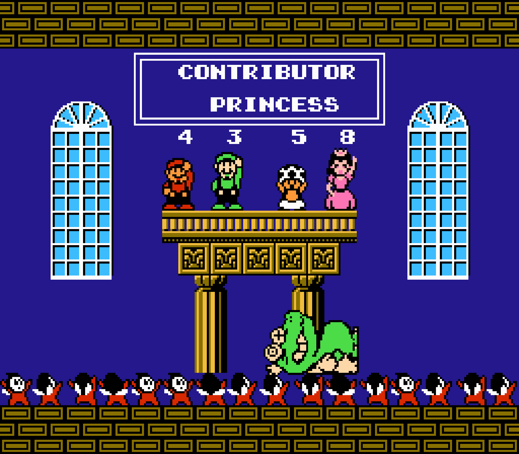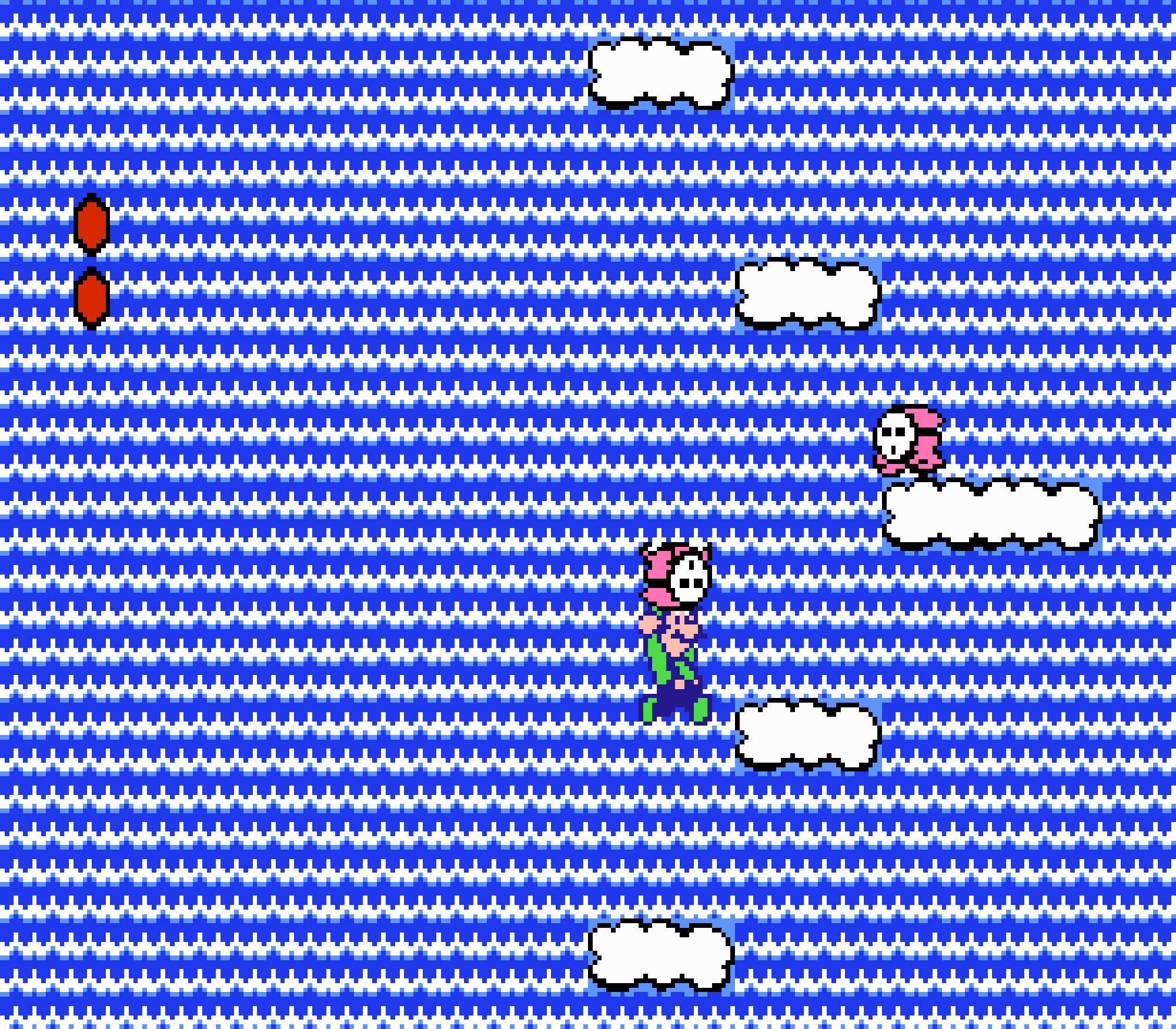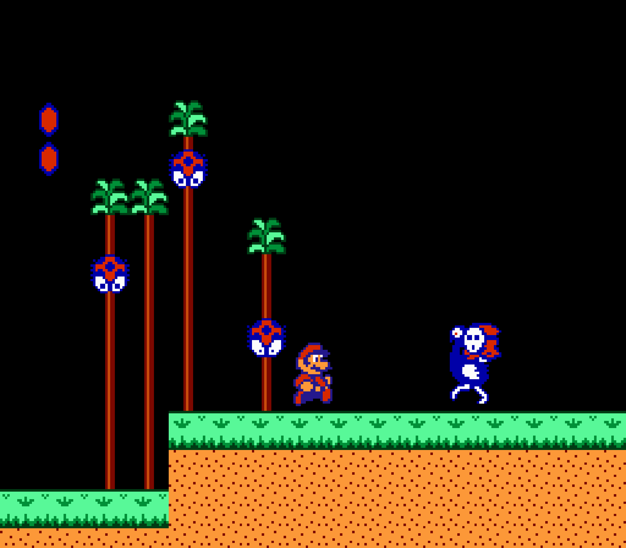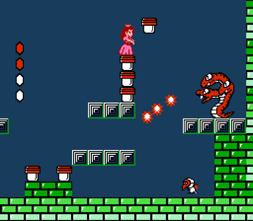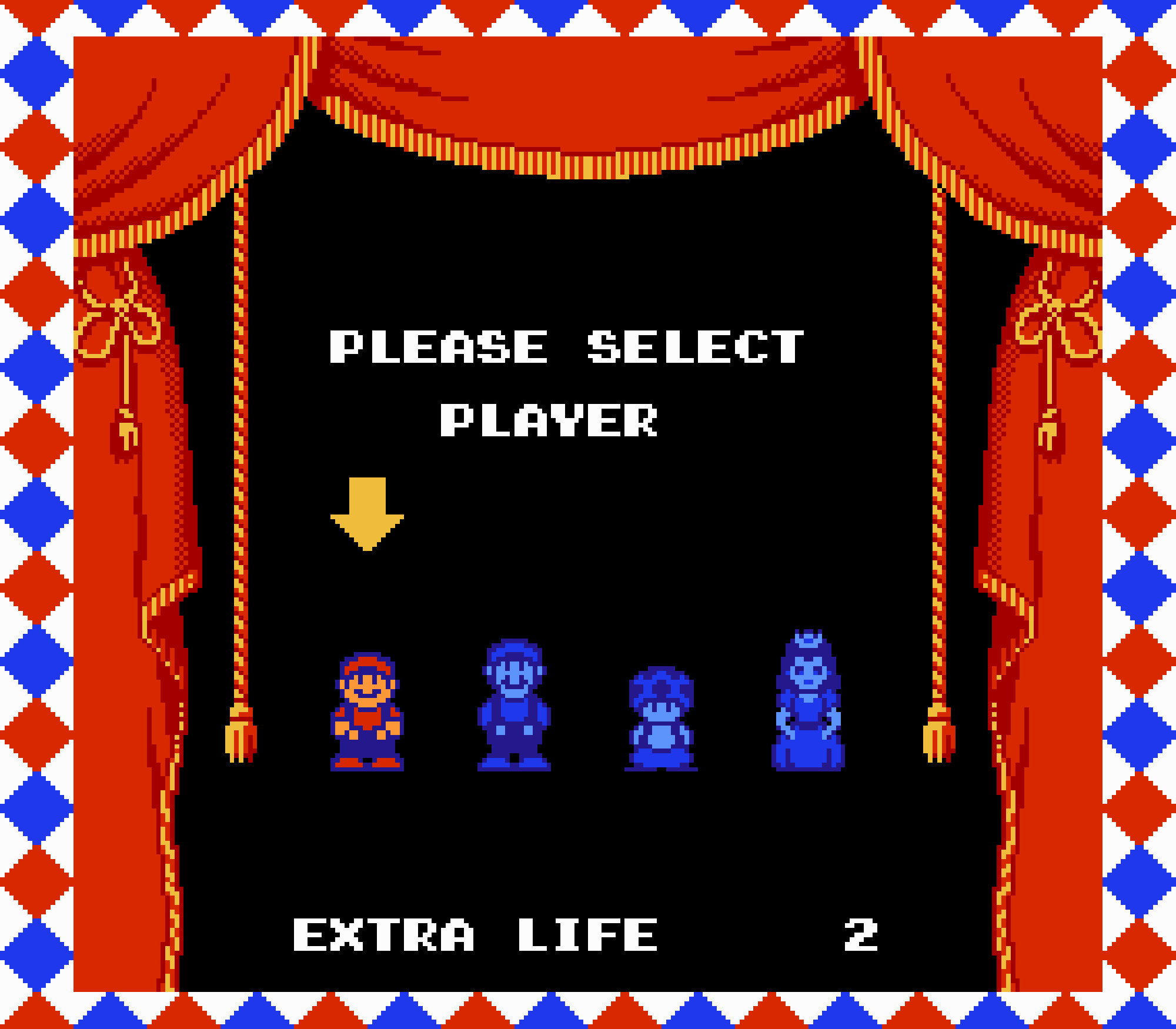 Tout d'abord il faudra à chaque tableau choisir son personnage parmi les 4 et les ennemis ne sont plus des Koopa troopas mais divers animaux, certes mignons mais qui n'ont plus rien à voir avec les fantômes, champignons et tortues d'autrefois. Le boss final est d'ailleurs un crapaud géant nommé Warp. Les autres boss passent d'une souris géante à un serpent à 3 têtes, mais le plus récurent n'est autre que Birdo, cette étrange bestiole qui nous balance des oeufs avec sa propre bouche (?). Heureusement qu'il y a Mario parce qu'on se demande bien où est passé son univers... Pour en revenir à nos 4 personnages jouables, on aura donc le choix entre Mario, Luigi, Toad et la Princesse Peach. Loin d'un simple changement de sprite, chaque perso à ses petites facultés bien à lui. La préférée de tous, la Princesse, pourra voler un court instant, Toad est le seul à courir à la même vitesse lorsqu'il porte quelque chose, Luigi saute plus haut que tous les autres mais est complètement injouable à cause de son inertie, et enfin Mario reste le personnage le plus équilibré de la bande.