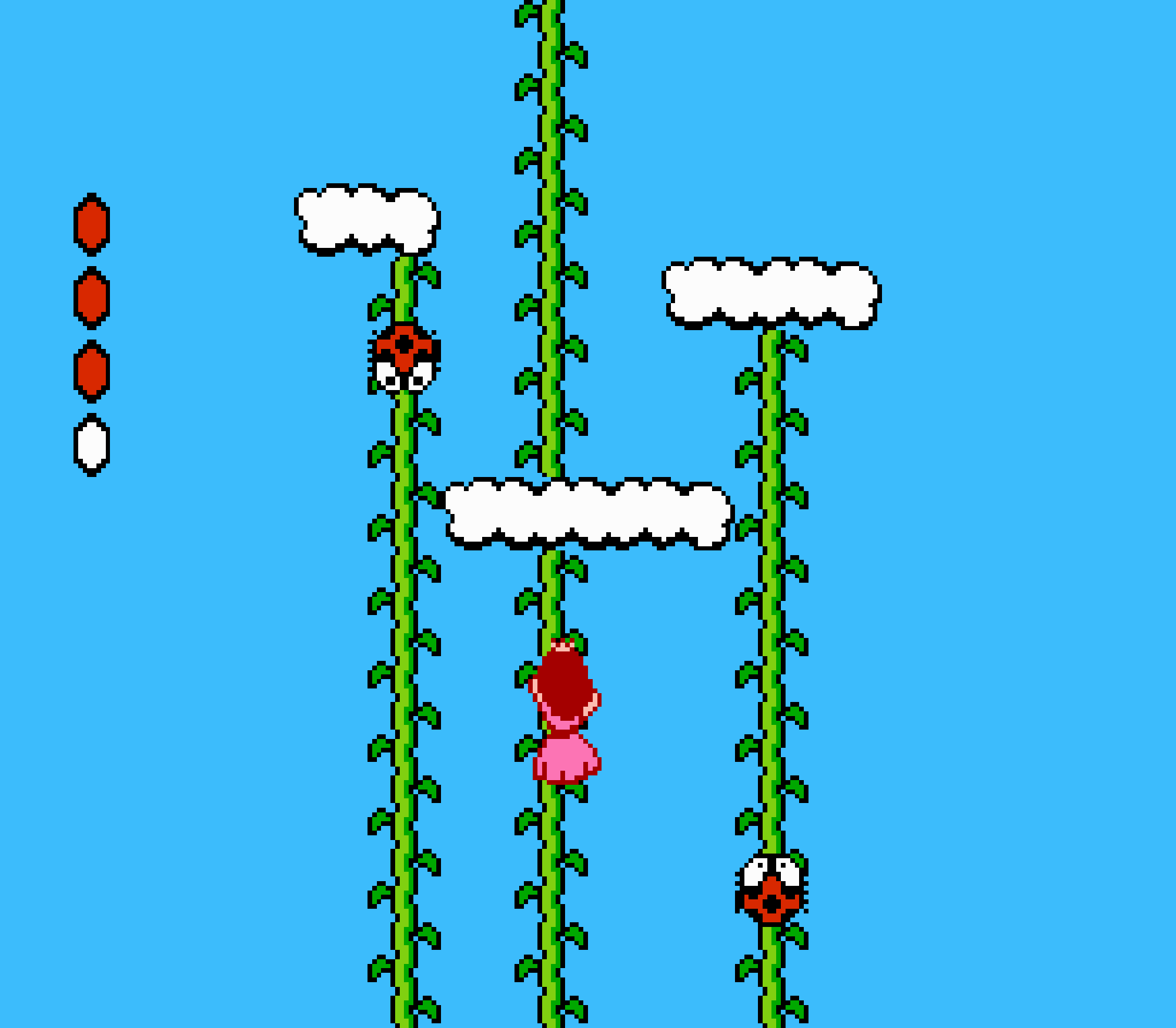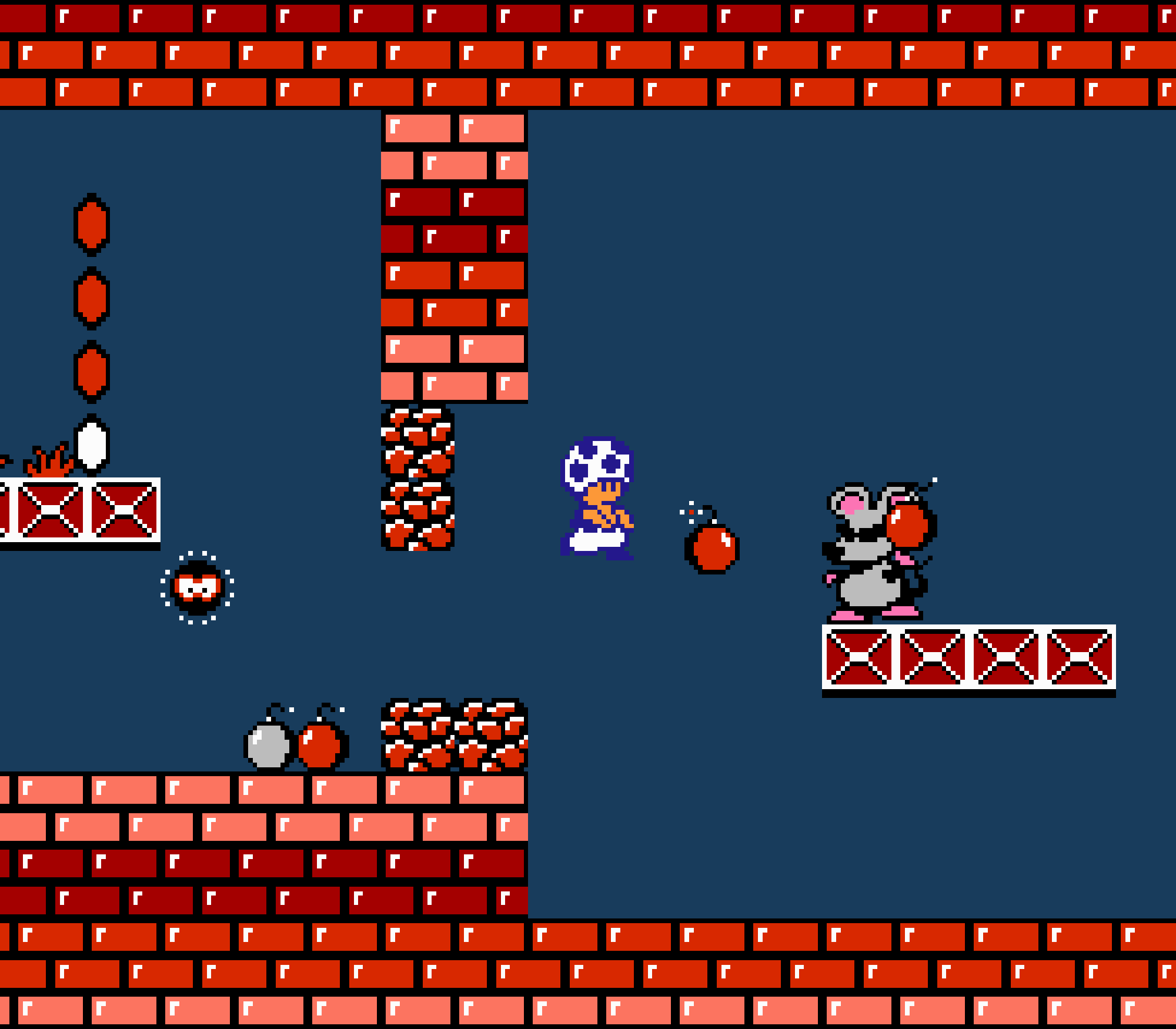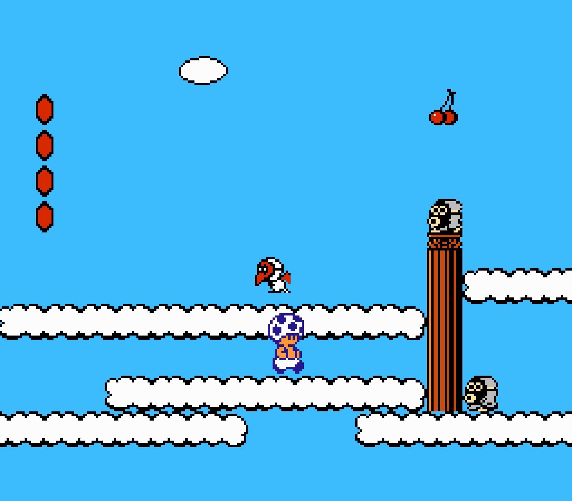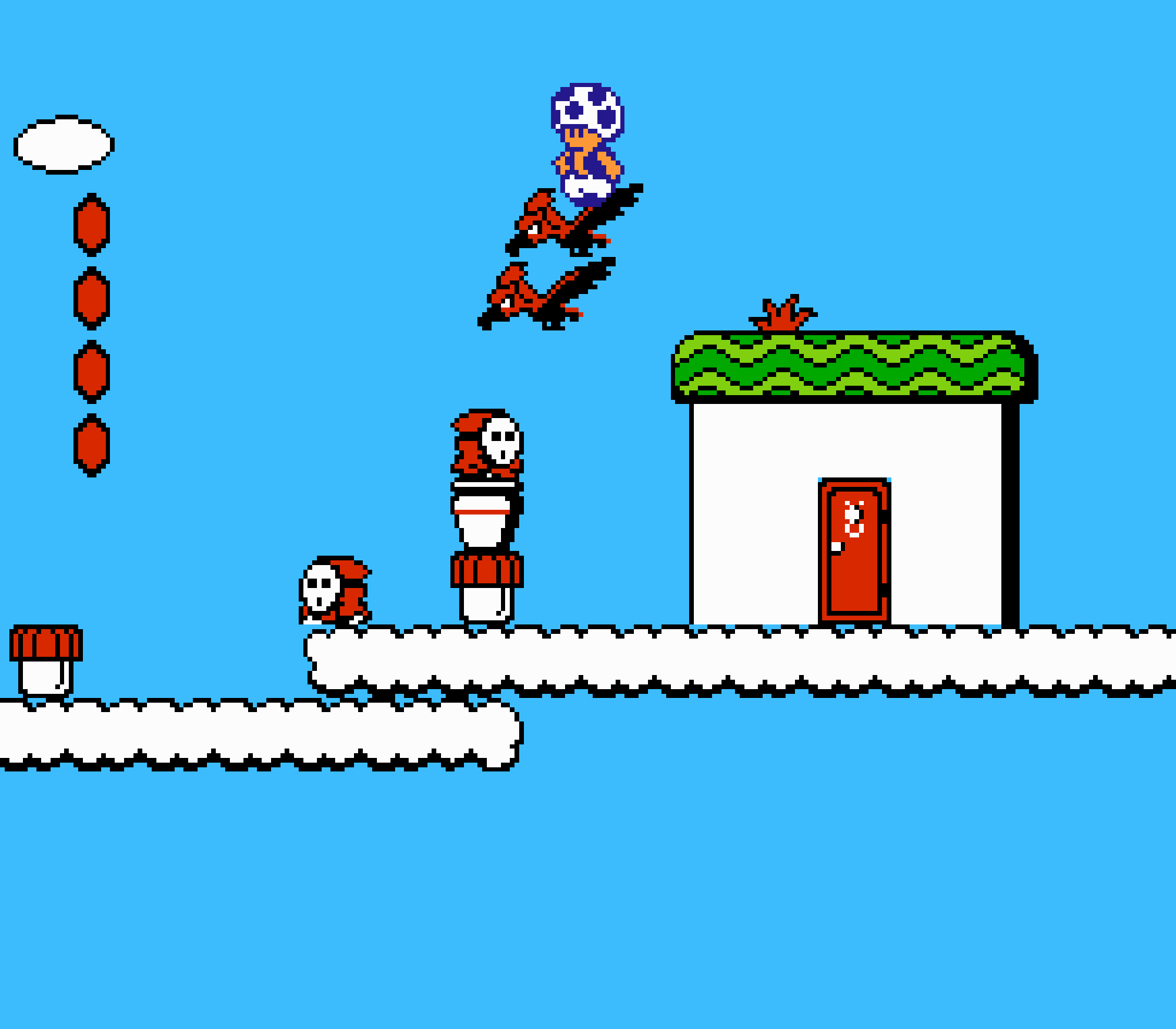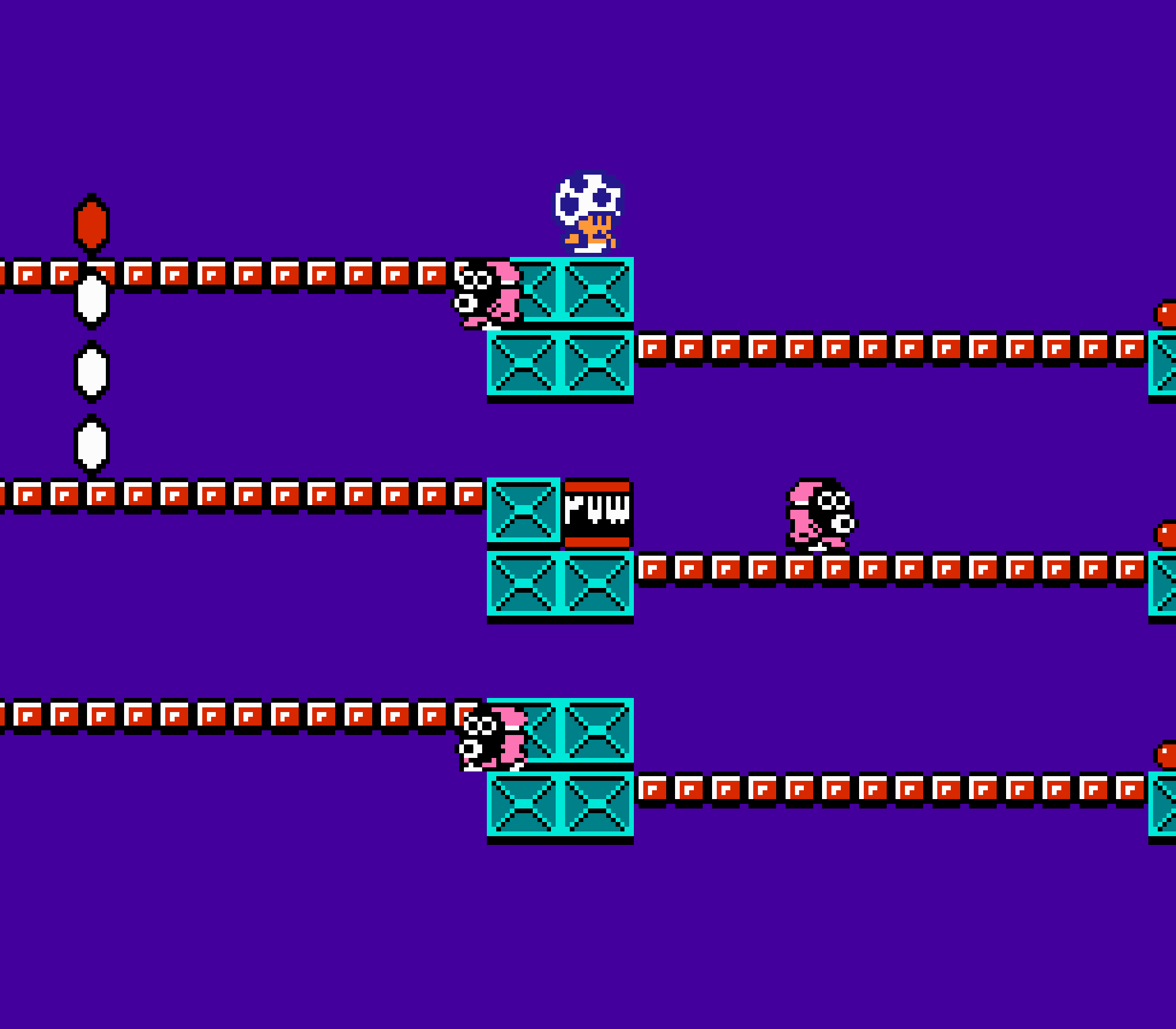Tout d'abord il faudra à chaque tableau choisir son personnage parmi les 4 et les ennemis ne sont plus des Koopa troopas mais divers animaux, certes mignons mais qui n'ont plus rien à voir avec les fantômes, champignons et tortues d'autrefois. Le boss final est d'ailleurs un crapaud géant nommé Warp. Les autres boss passent d'une souris géante à un serpent à 3 têtes, mais le plus récurent n'est autre que Birdo, cette étrange bestiole qui nous balance des oeufs avec sa propre bouche (?). Heureusement qu'il y a Mario parce qu'on se demande bien où est passé son univers... Pour en revenir à nos 4 personnages jouables, on aura donc le choix entre Mario, Luigi, Toad et la Princesse Peach. Loin d'un simple changement de sprite, chaque perso à ses petites facultés bien à lui. La préférée de tous, la Princesse, pourra voler un court instant, Toad est le seul à courir à la même vitesse lorsqu'il porte quelque chose, Luigi saute plus haut que tous les autres mais est complètement injouable à cause de son inertie, et enfin Mario reste le personnage le plus équilibré de la bande.