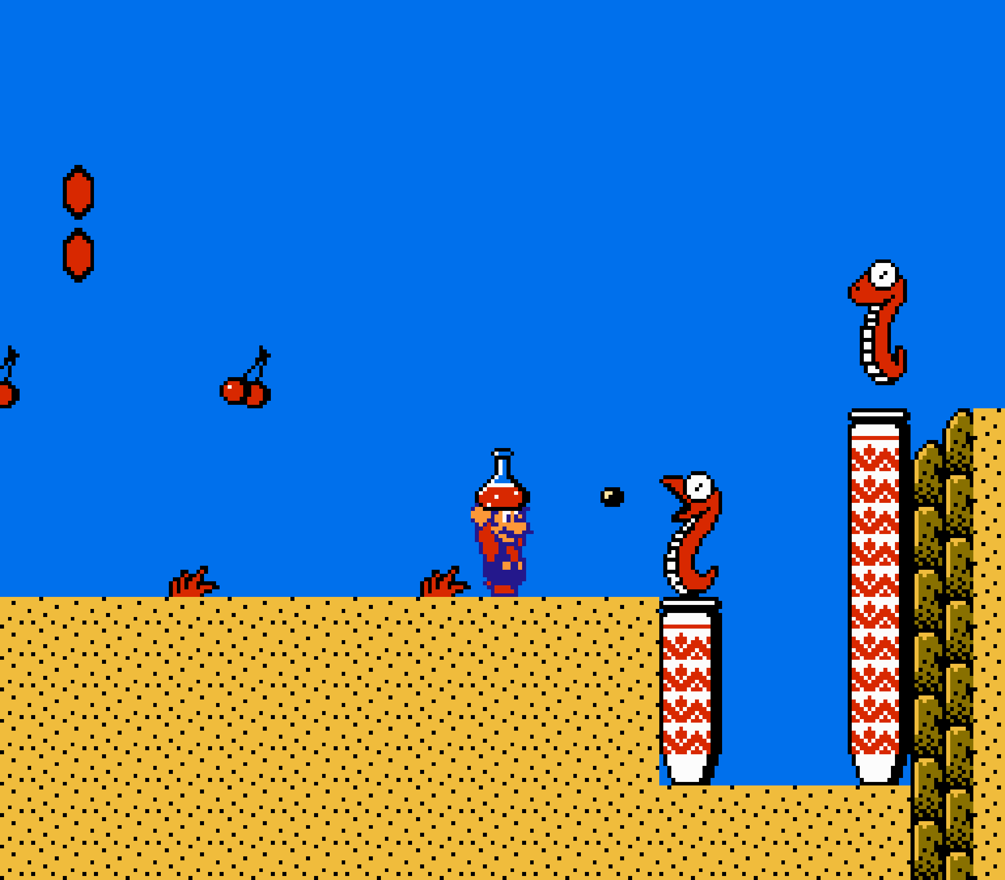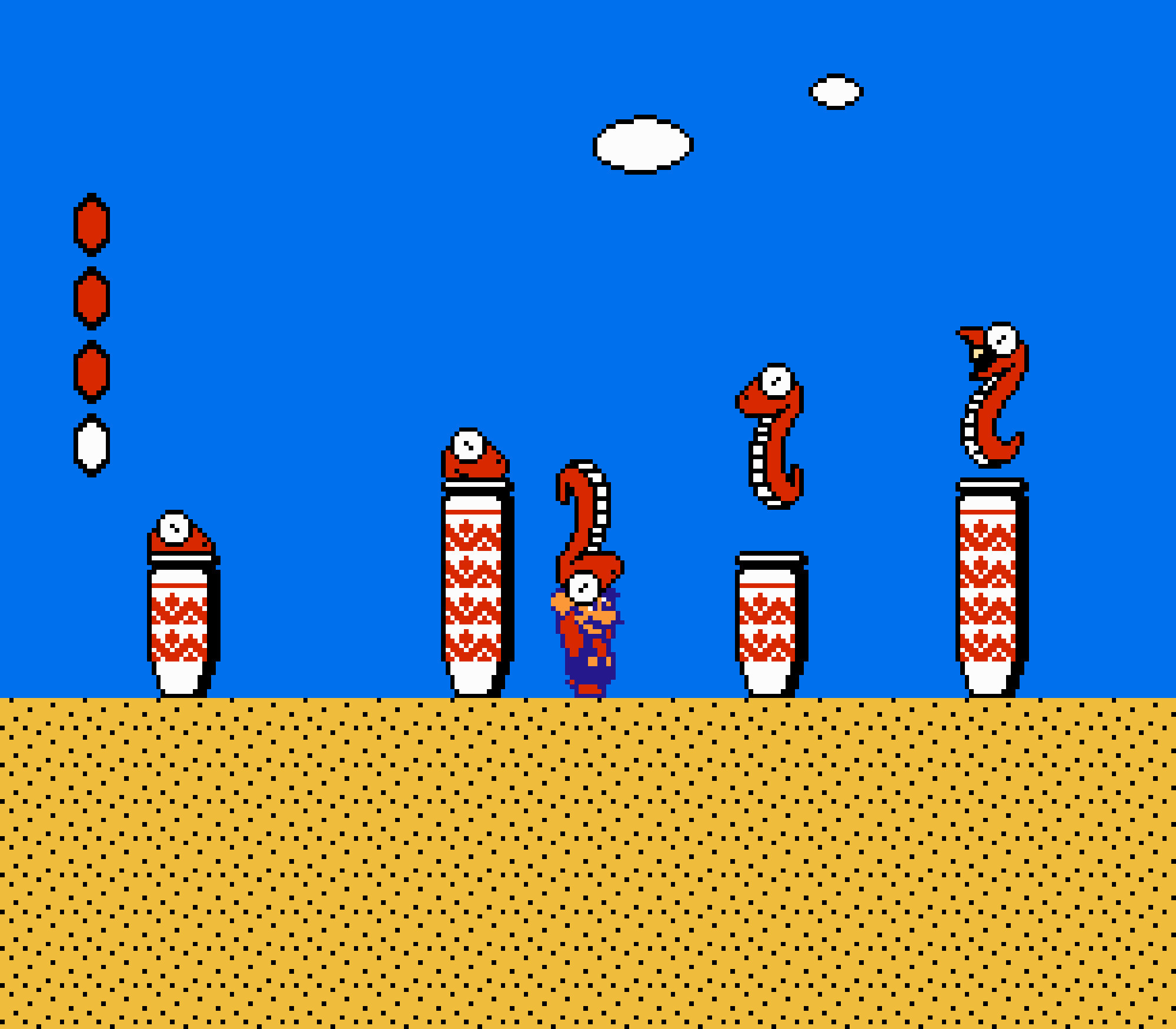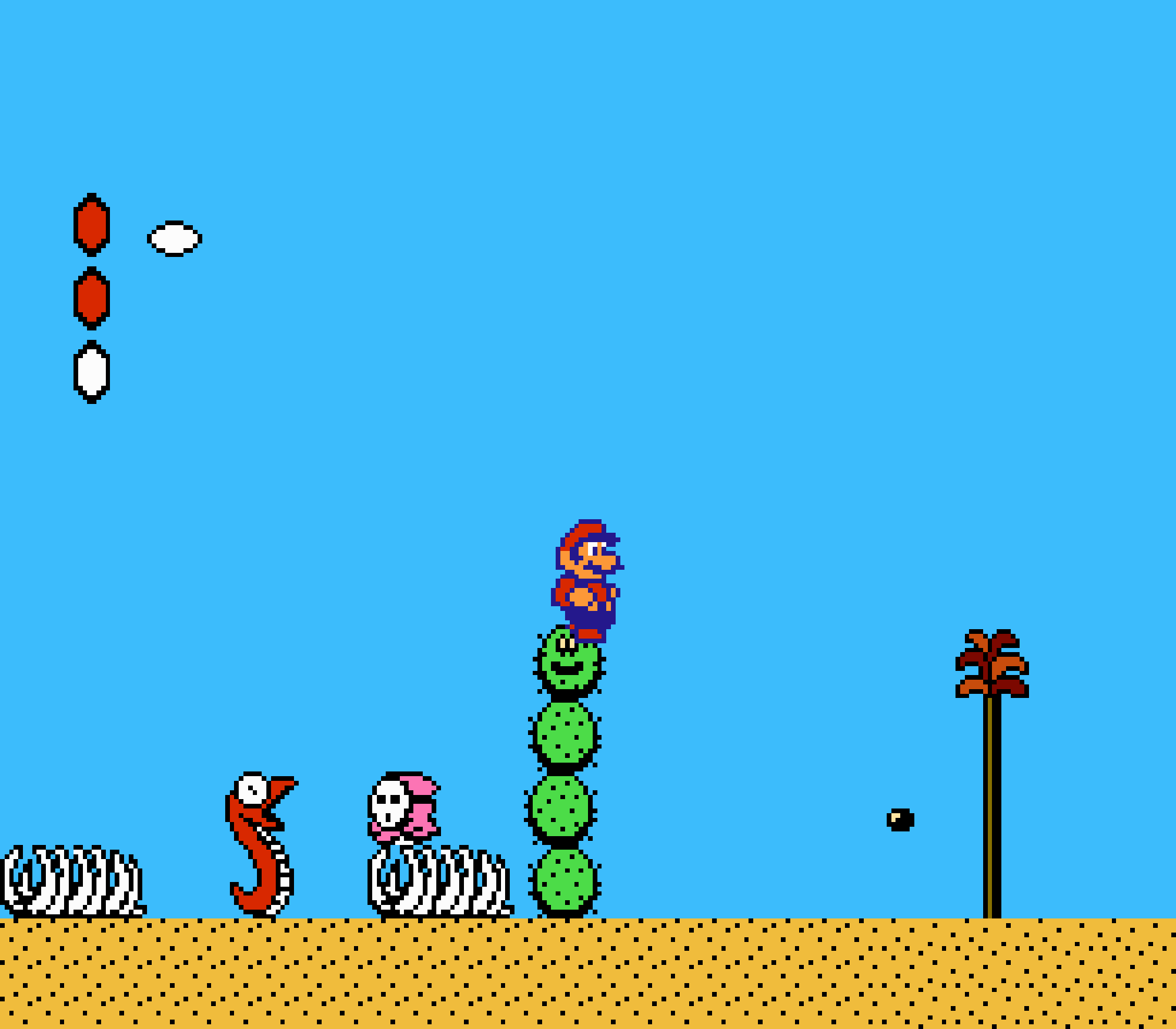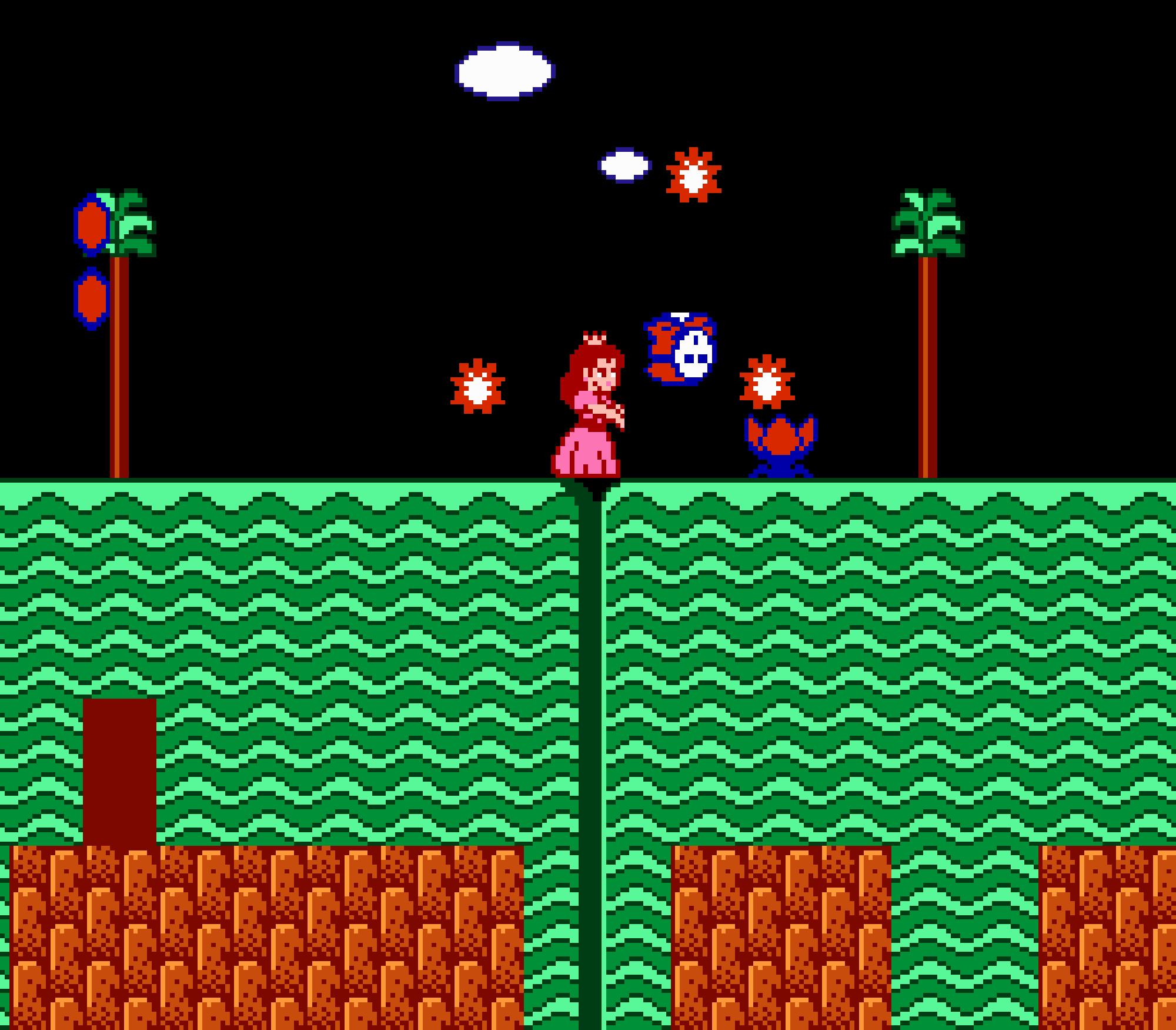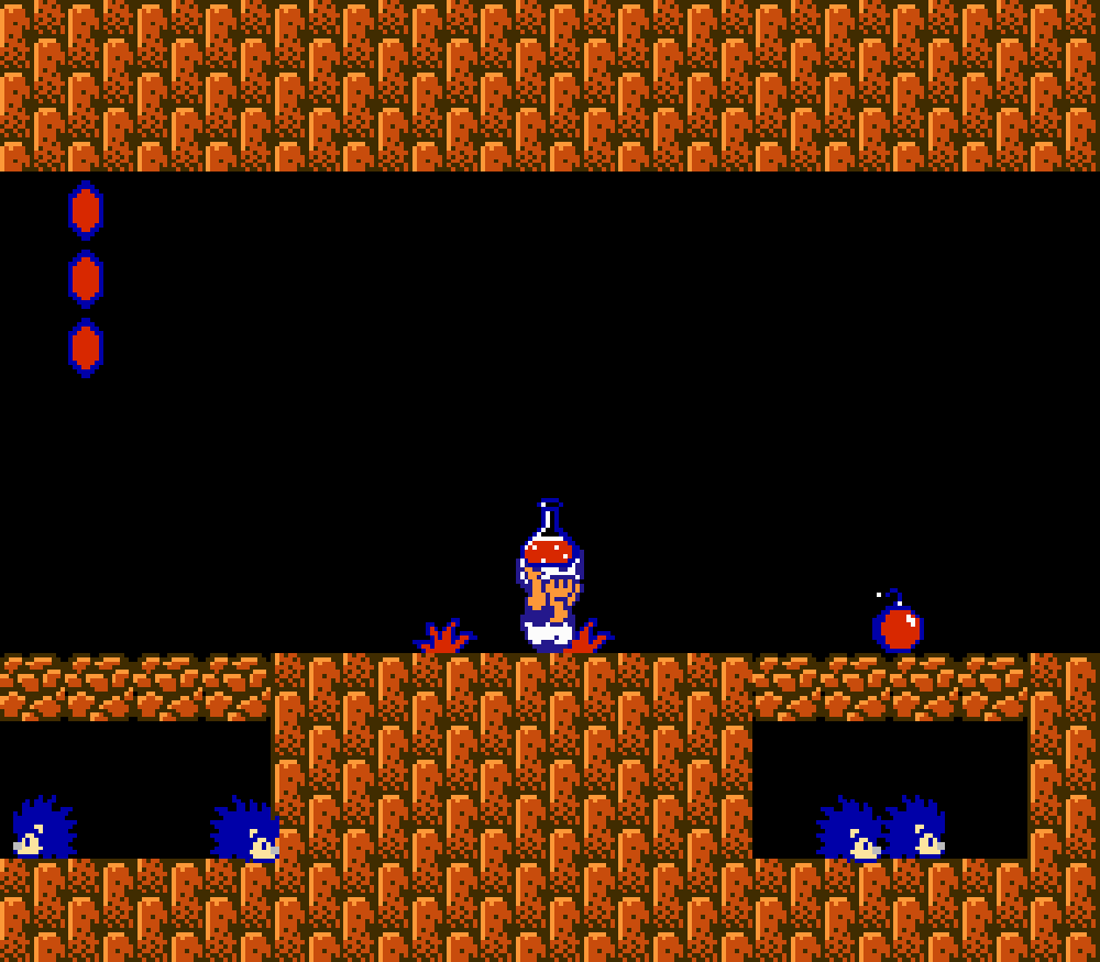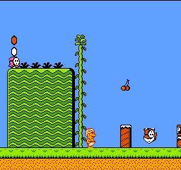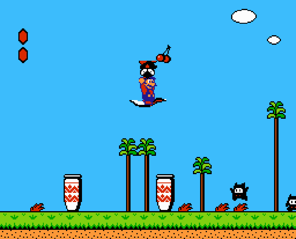 Enfin il y a les warp-zones, fidèles à l'opus précédent et des pseudo-tuyaux (des jarres en fait) où votre perso découvrira en général une nouvelle aire. Voilà pour le gameplay (complètement original) de ce Super Mario Bros 2, mais quand est-il de la partie technique ? Et bien si les jeux réellement "propres" sont rares sur NES, j'avoue que celui-ci est particulièrement réussi. Les sprites sont mignons tout plein, c'est très coloré et hormis en de rares cas, l'animation est toujours fluide. Evidemment le design général, issu de la culture hindou, peut paraitre légèrement dissonant pour un Super Mario, mais on s'y fait très vite. Enfin la bande-son est sympa, avec des thèmes particulièrement raccords avec les graphismes, des musiques alternant de belles mélodies à des ambiances plus sombres. Une belle réussite, signée du maitre en la matière, j'ai nommé Koji Kondo. What else...
