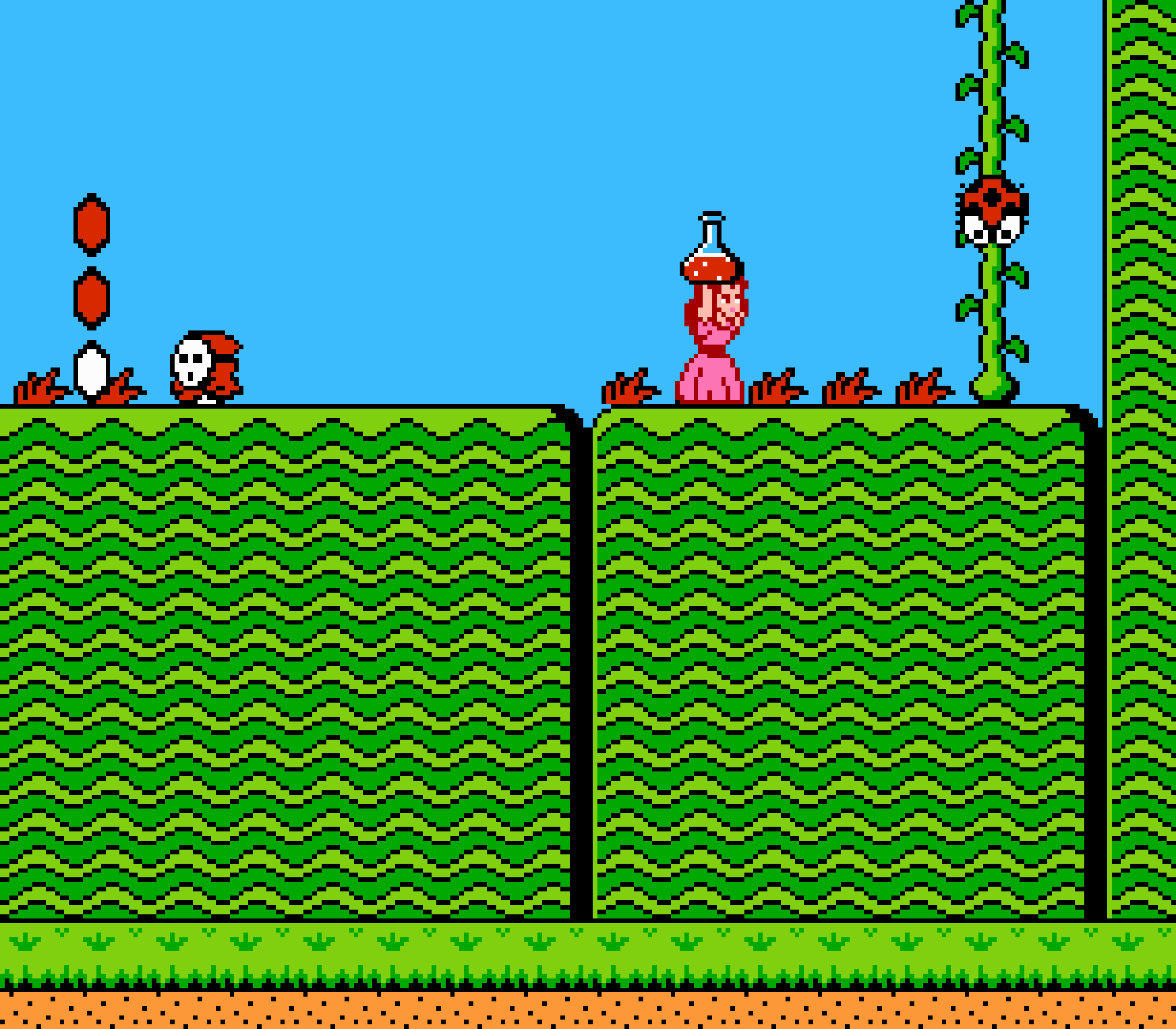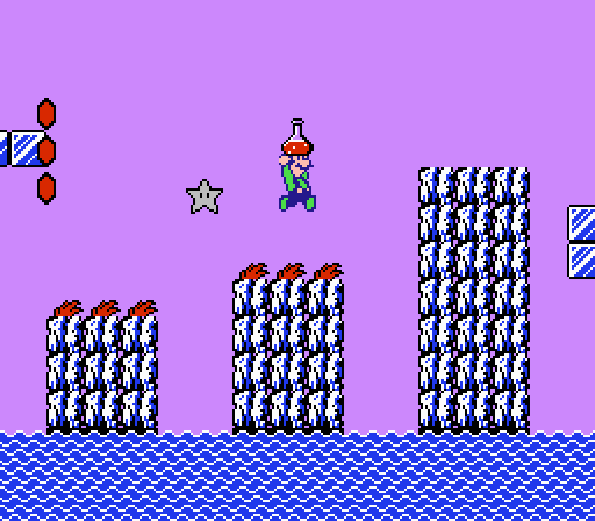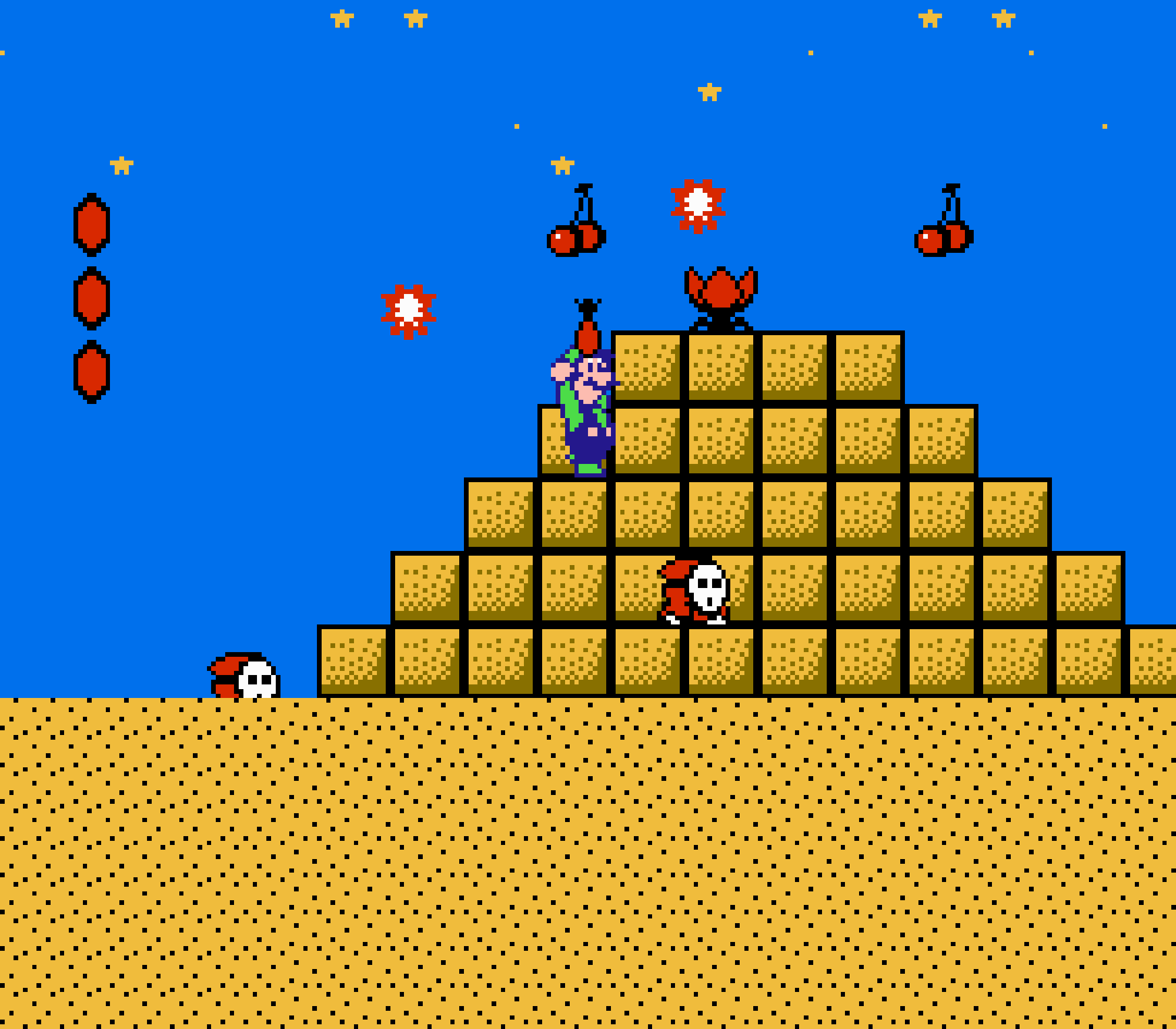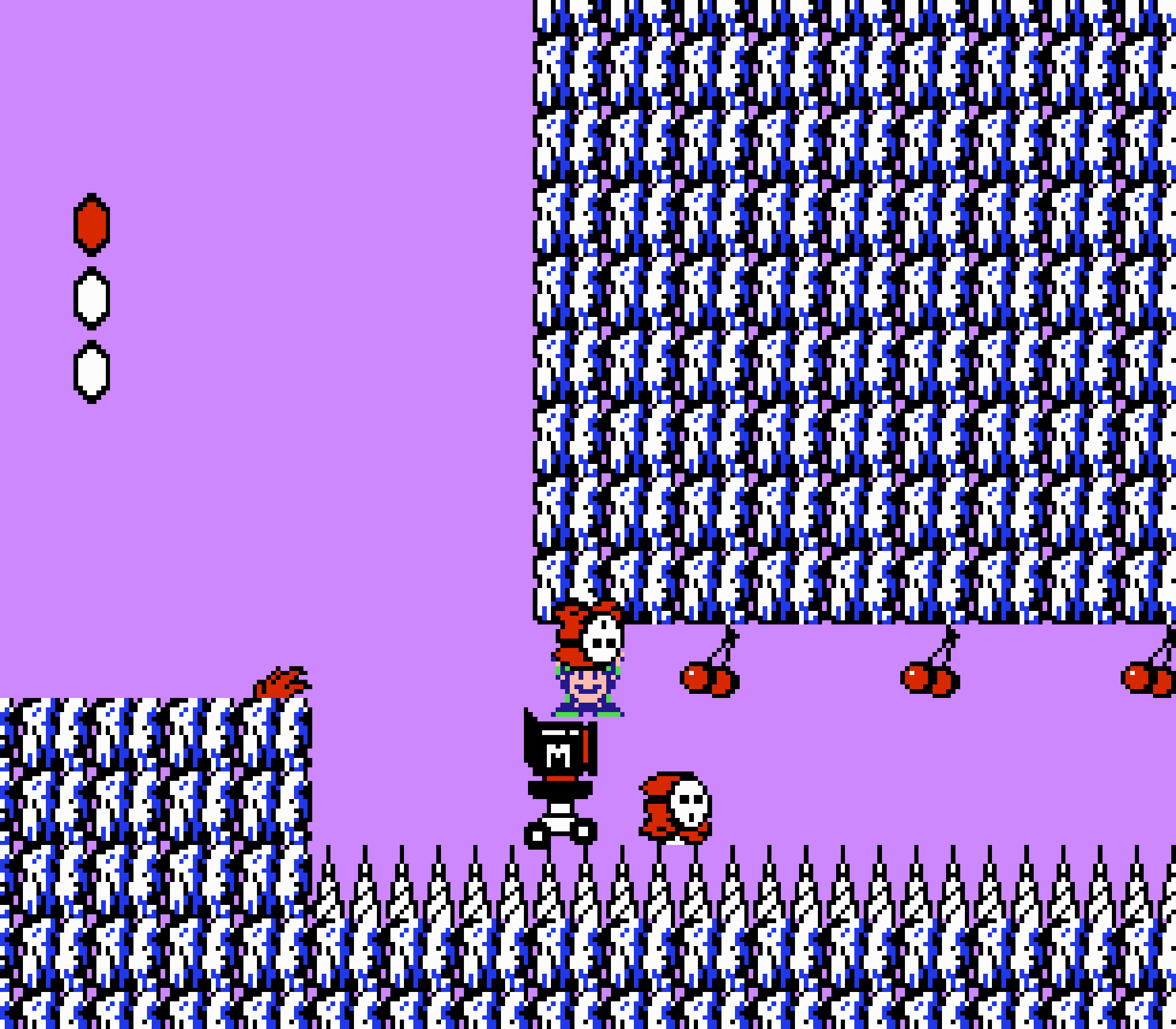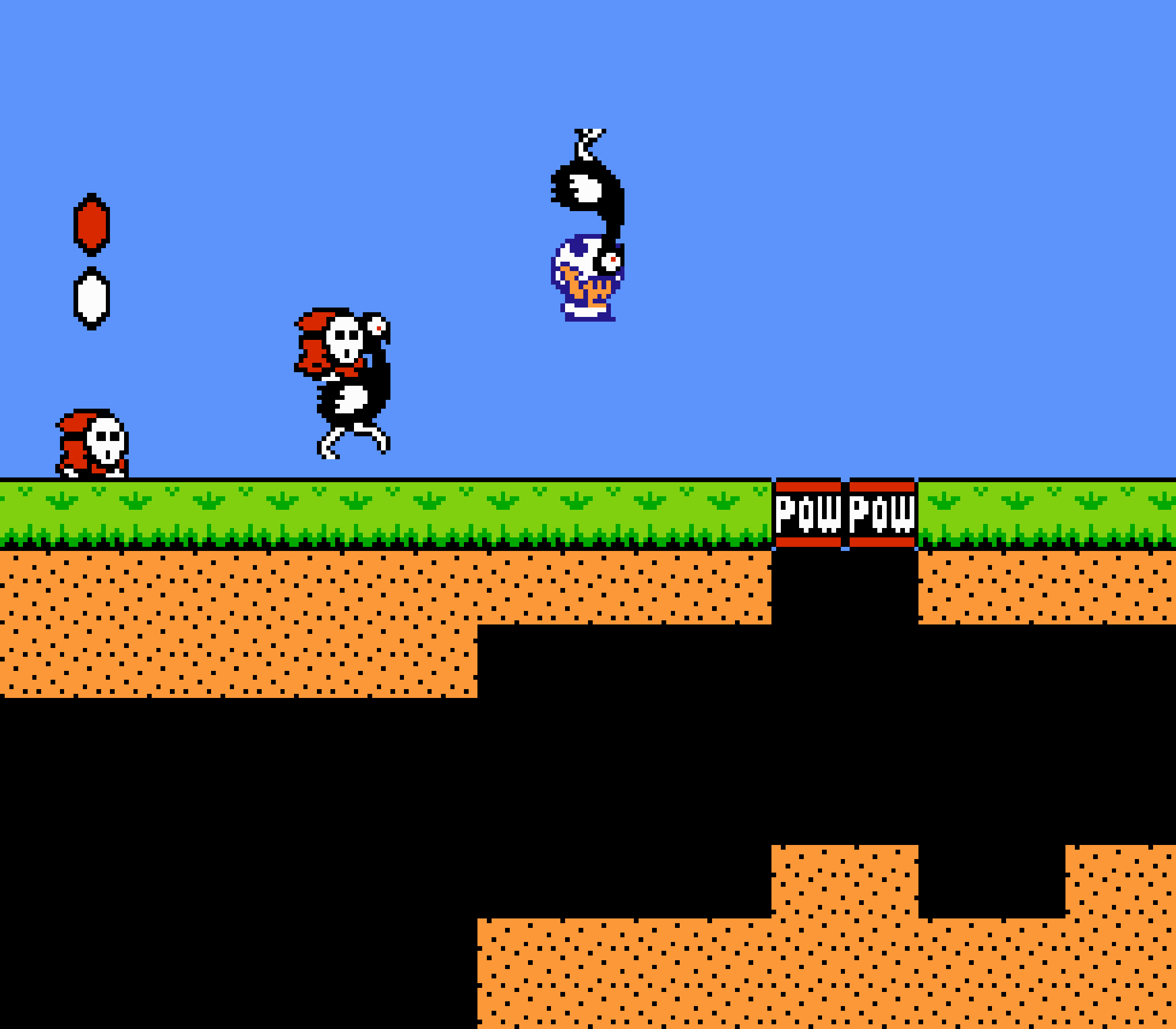Enfin il y a les warp-zones, fidèles à l'opus précédent et des pseudo-tuyaux (des jarres en fait) où votre perso découvrira en général une nouvelle aire. Voilà pour le gameplay (complètement original) de ce Super Mario Bros 2, mais quand est-il de la partie technique ? Et bien si les jeux réellement "propres" sont rares sur NES, j'avoue que celui-ci est particulièrement réussi. Les sprites sont mignons tout plein, c'est très coloré et hormis en de rares cas, l'animation est toujours fluide. Evidemment le design général, issu de la culture hindou, peut paraitre légèrement dissonant pour un Super Mario, mais on s'y fait très vite. Enfin la bande-son est sympa, avec des thèmes particulièrement raccords avec les graphismes, des musiques alternant de belles mélodies à des ambiances plus sombres. Une belle réussite, signée du maitre en la matière, j'ai nommé Koji Kondo. What else...