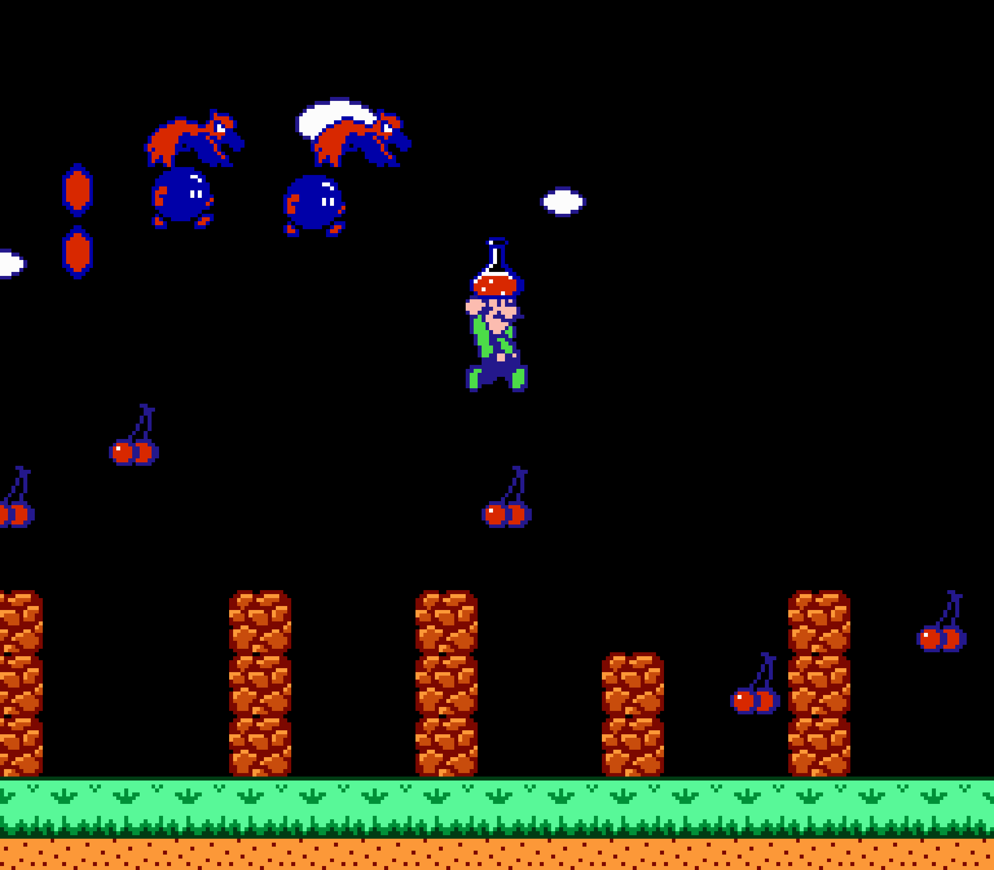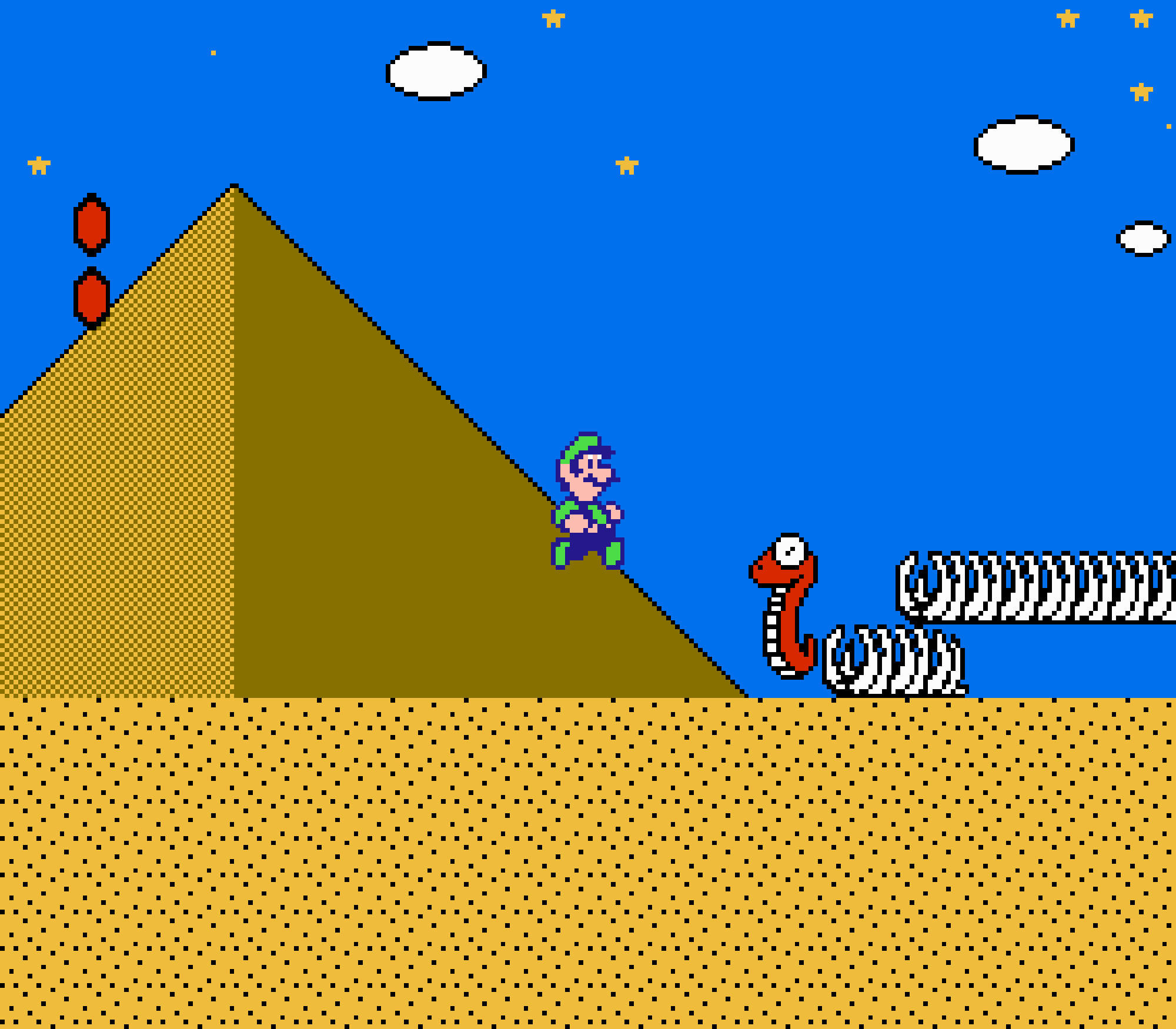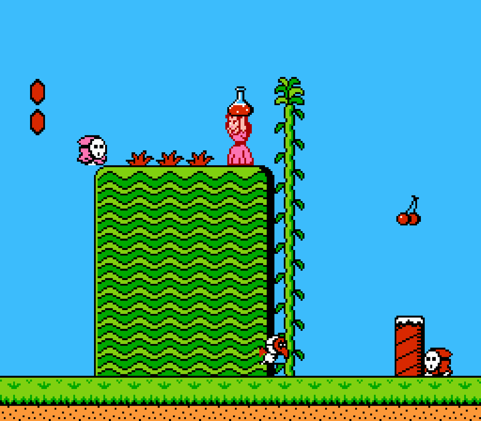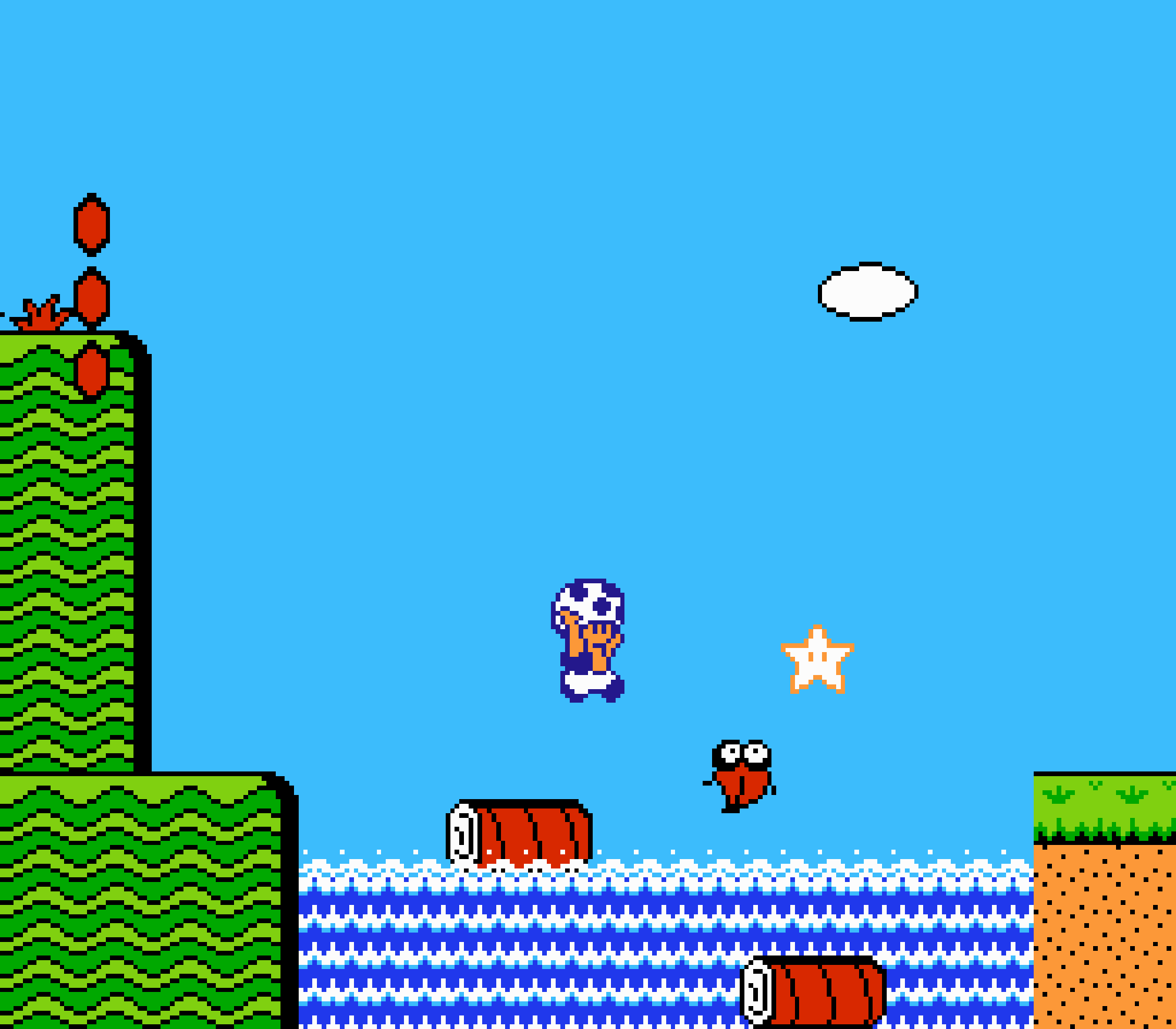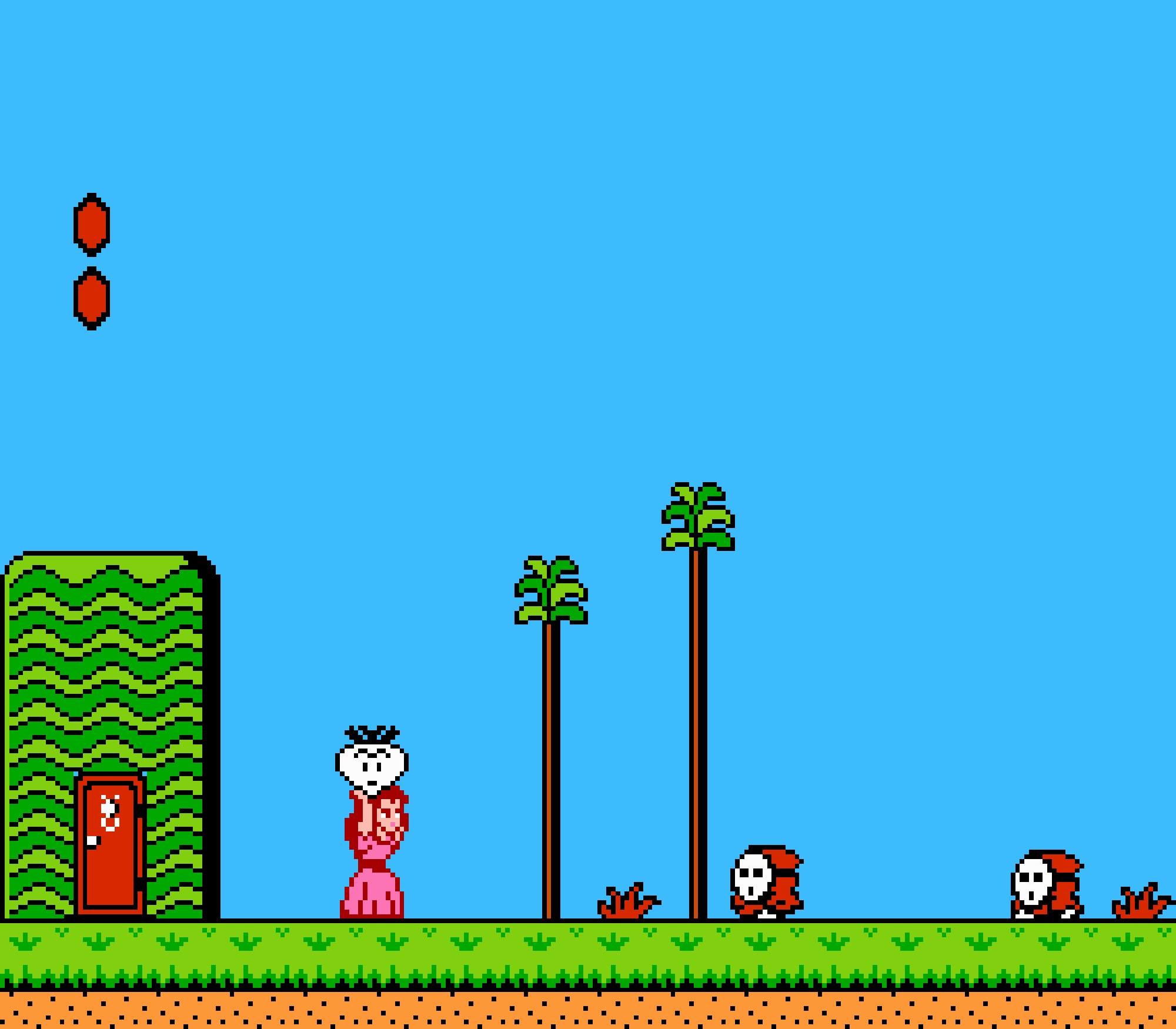 Enfin il y a les warp-zones, fidèles à l'opus précédent et des pseudo-tuyaux (des jarres en fait) où votre perso découvrira en général une nouvelle aire. Voilà pour le gameplay (complètement original) de ce Super Mario Bros 2, mais quand est-il de la partie technique ? Et bien si les jeux réellement "propres" sont rares sur NES, j'avoue que celui-ci est particulièrement réussi. Les sprites sont mignons tout plein, c'est très coloré et hormis en de rares cas, l'animation est toujours fluide. Evidemment le design général, issu de la culture hindou, peut paraitre légèrement dissonant pour un Super Mario, mais on s'y fait très vite. Enfin la bande-son est sympa, avec des thèmes particulièrement raccords avec les graphismes, des musiques alternant de belles mélodies à des ambiances plus sombres. Une belle réussite, signée du maitre en la matière, j'ai nommé Koji Kondo. What else...