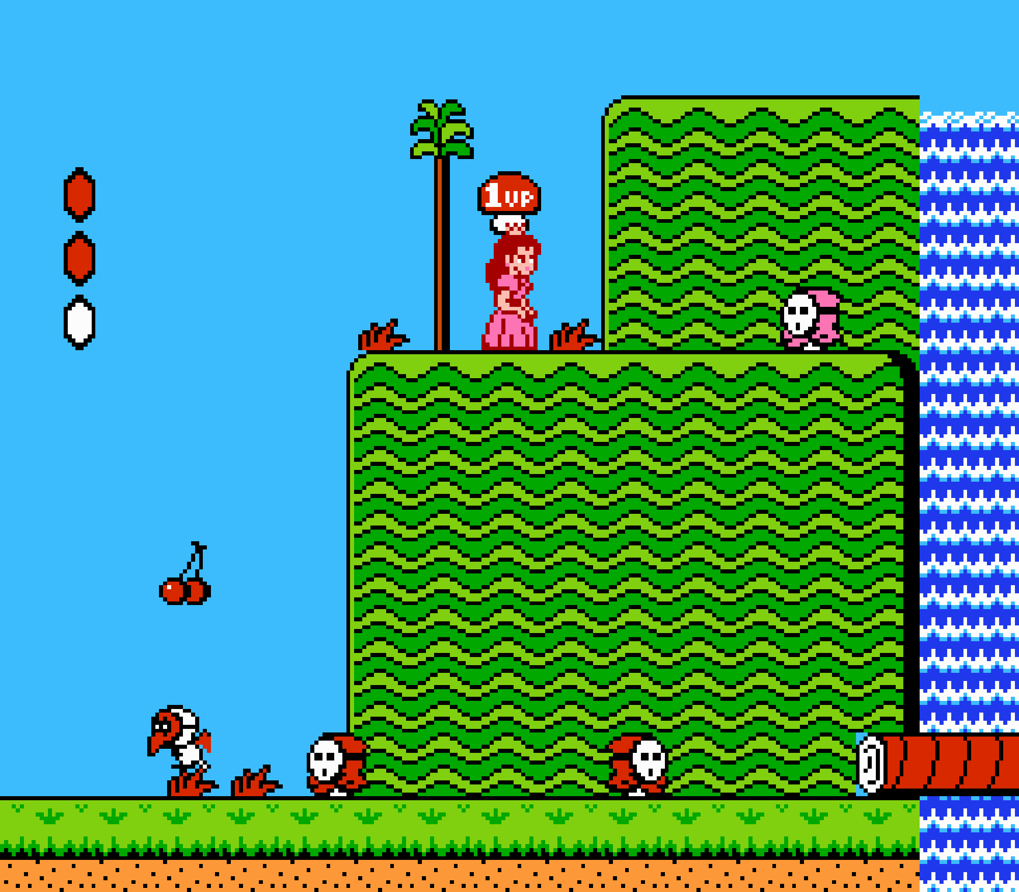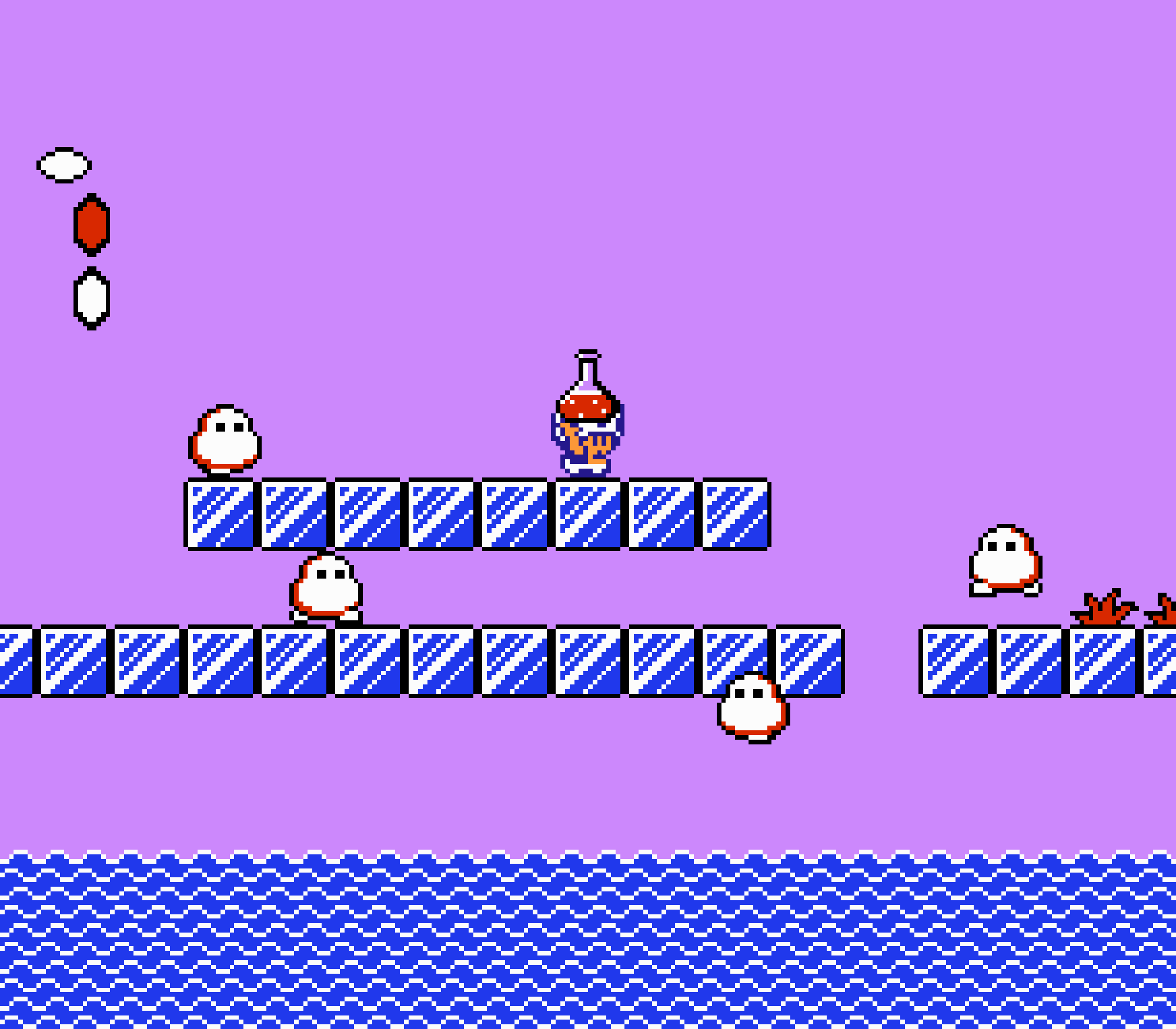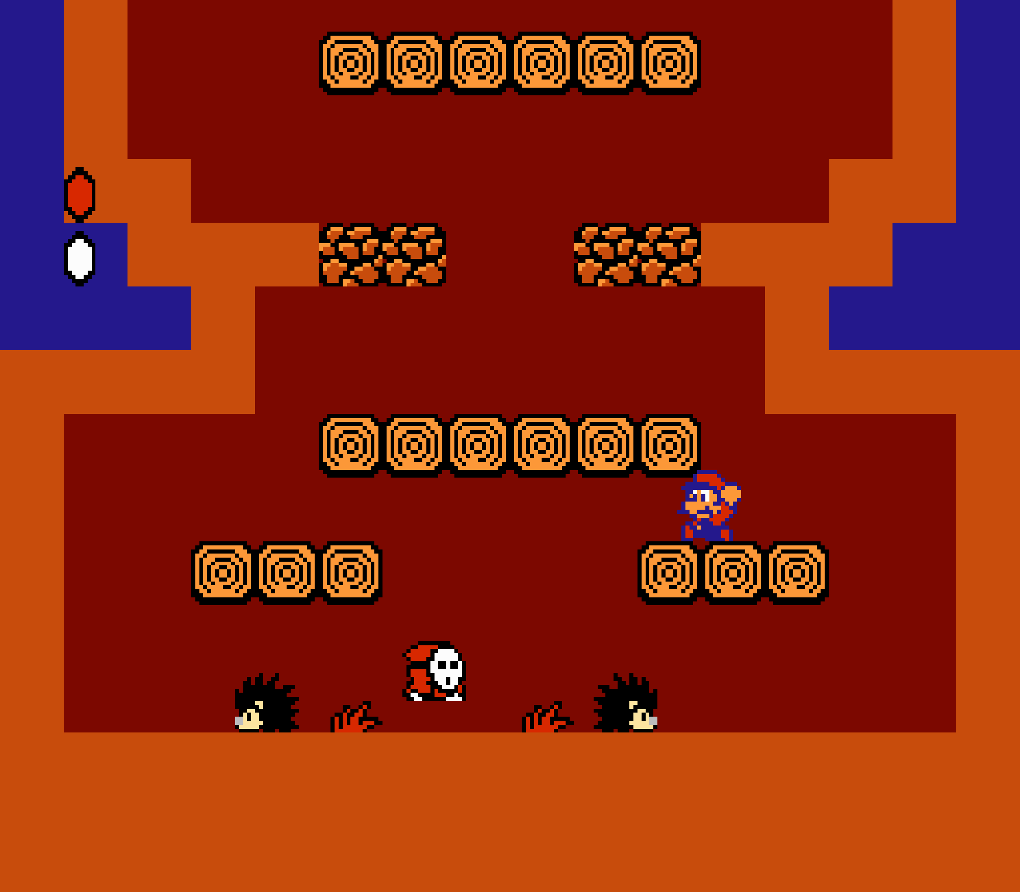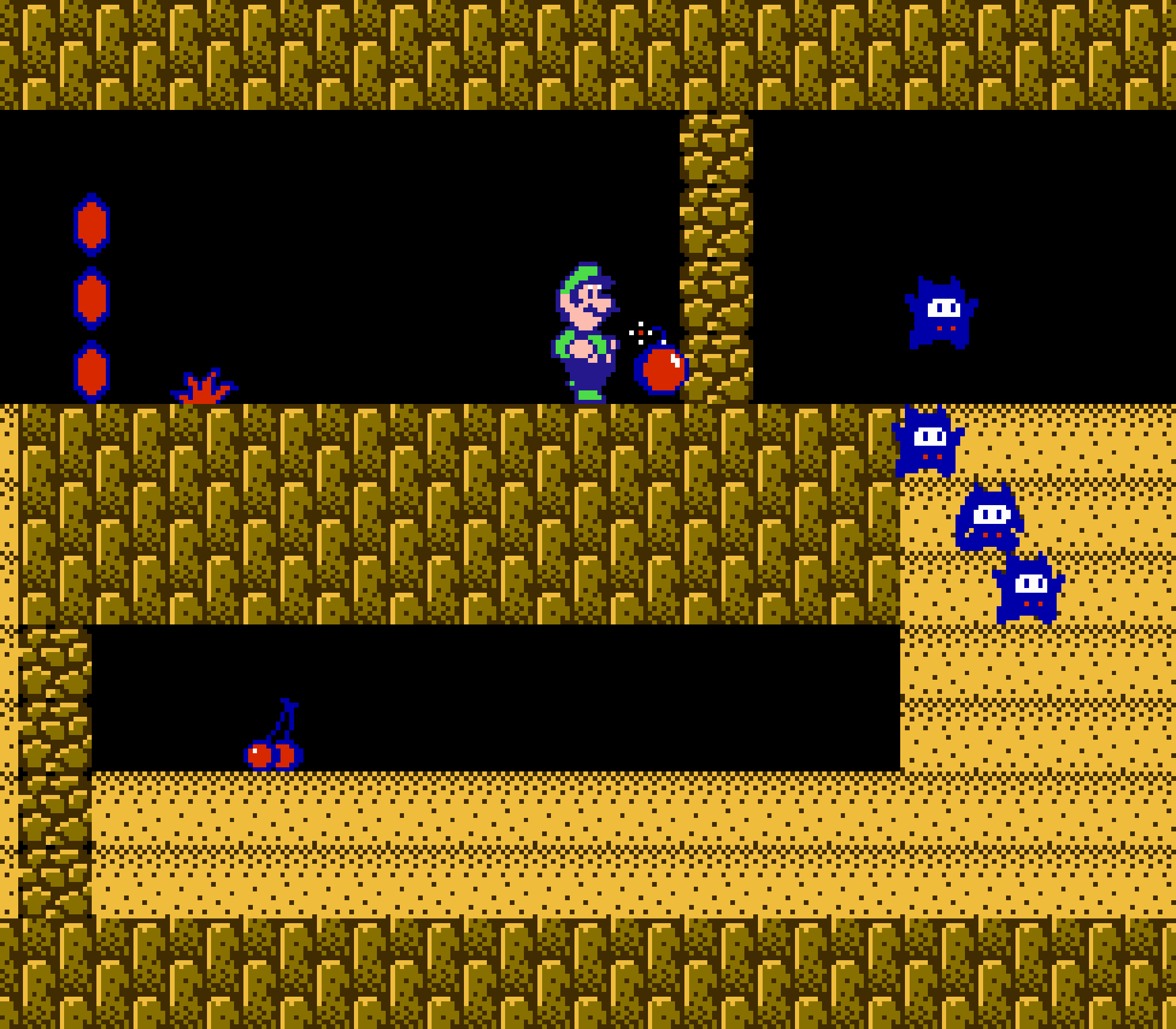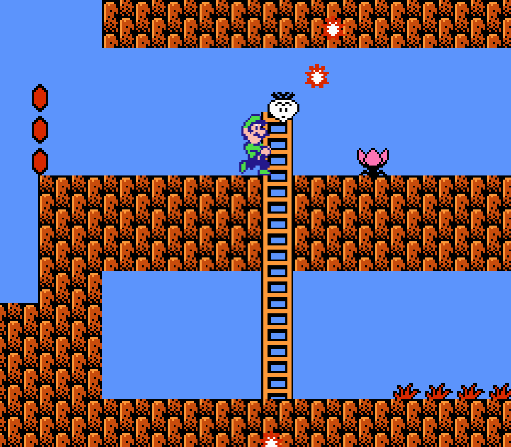 Enfin il y a les warp-zones, fidèles à l'opus précédent et des pseudo-tuyaux (des jarres en fait) où votre perso découvrira en général une nouvelle aire. Voilà pour le gameplay (complètement original) de ce Super Mario Bros 2, mais quand est-il de la partie technique ? Et bien si les jeux réellement "propres" sont rares sur NES, j'avoue que celui-ci est particulièrement réussi. Les sprites sont mignons tout plein, c'est très coloré et hormis en de rares cas, l'animation est toujours fluide. Evidemment le design général, issu de la culture hindou, peut paraitre légèrement dissonant pour un Super Mario, mais on s'y fait très vite. Enfin la bande-son est sympa, avec des thèmes particulièrement raccords avec les graphismes, des musiques alternant de belles mélodies à des ambiances plus sombres. Une belle réussite, signée du maitre en la matière, j'ai nommé Koji Kondo. What else...