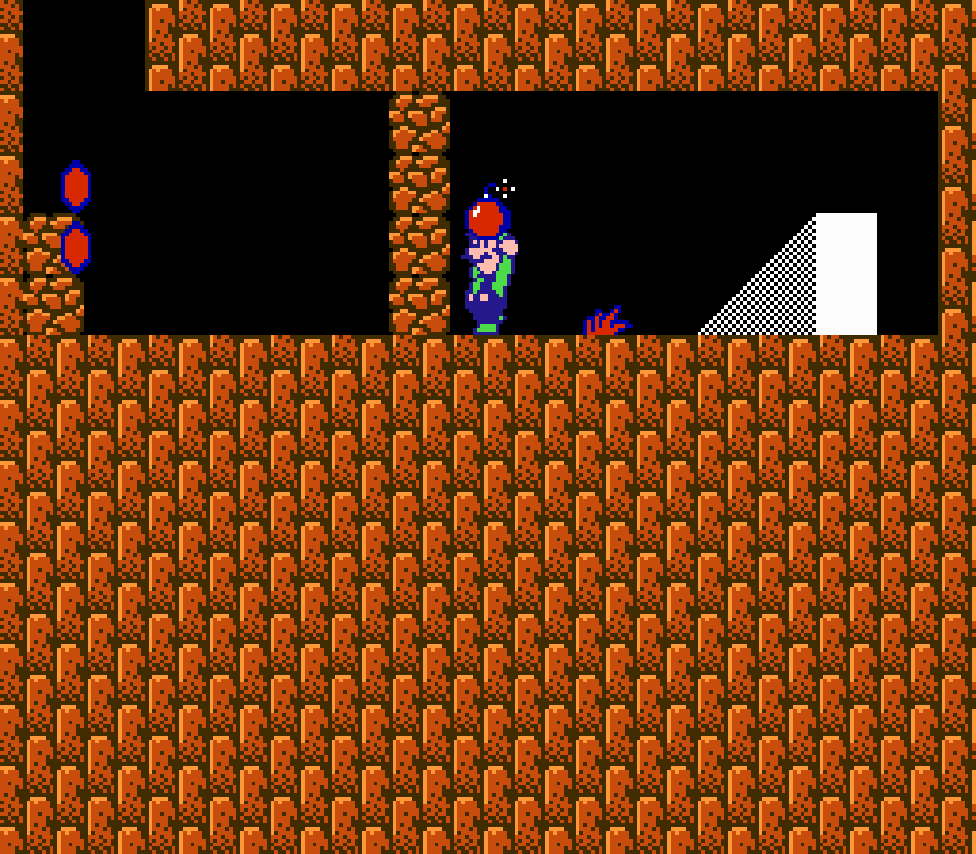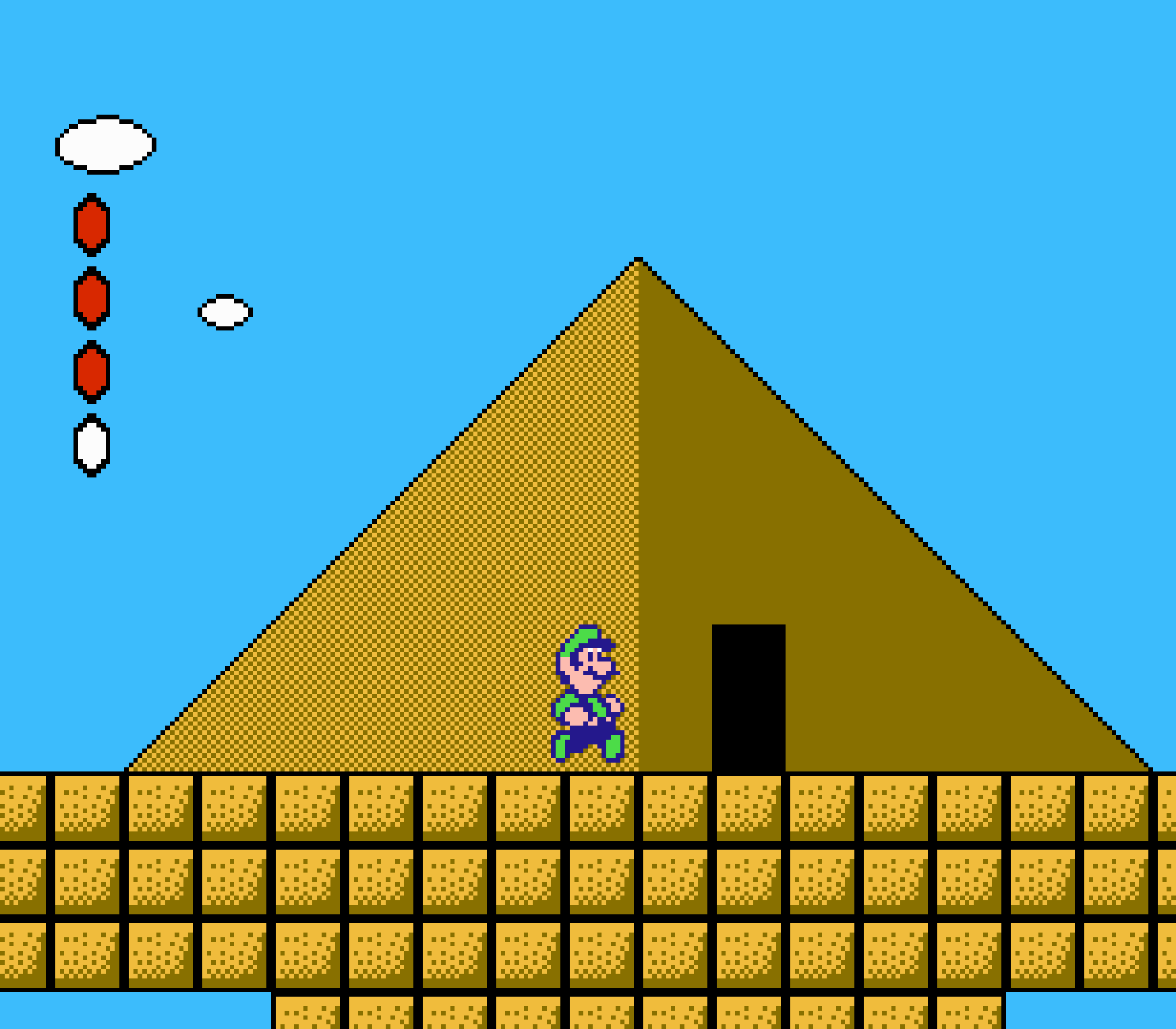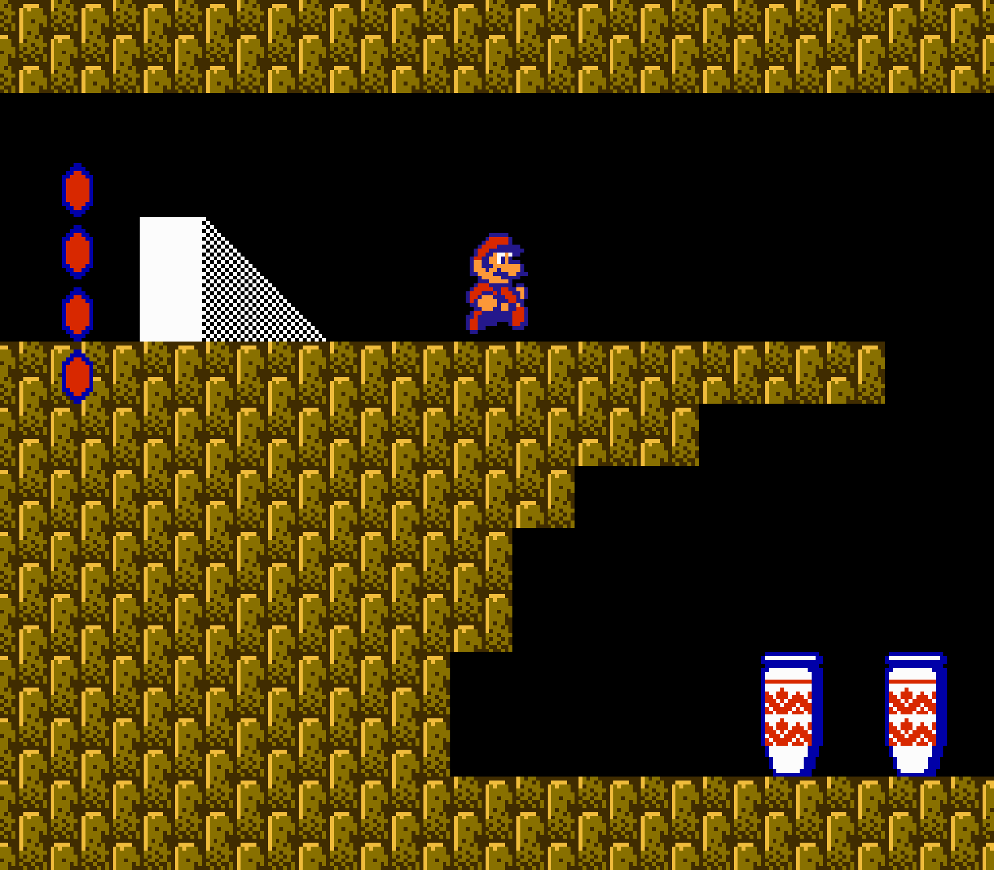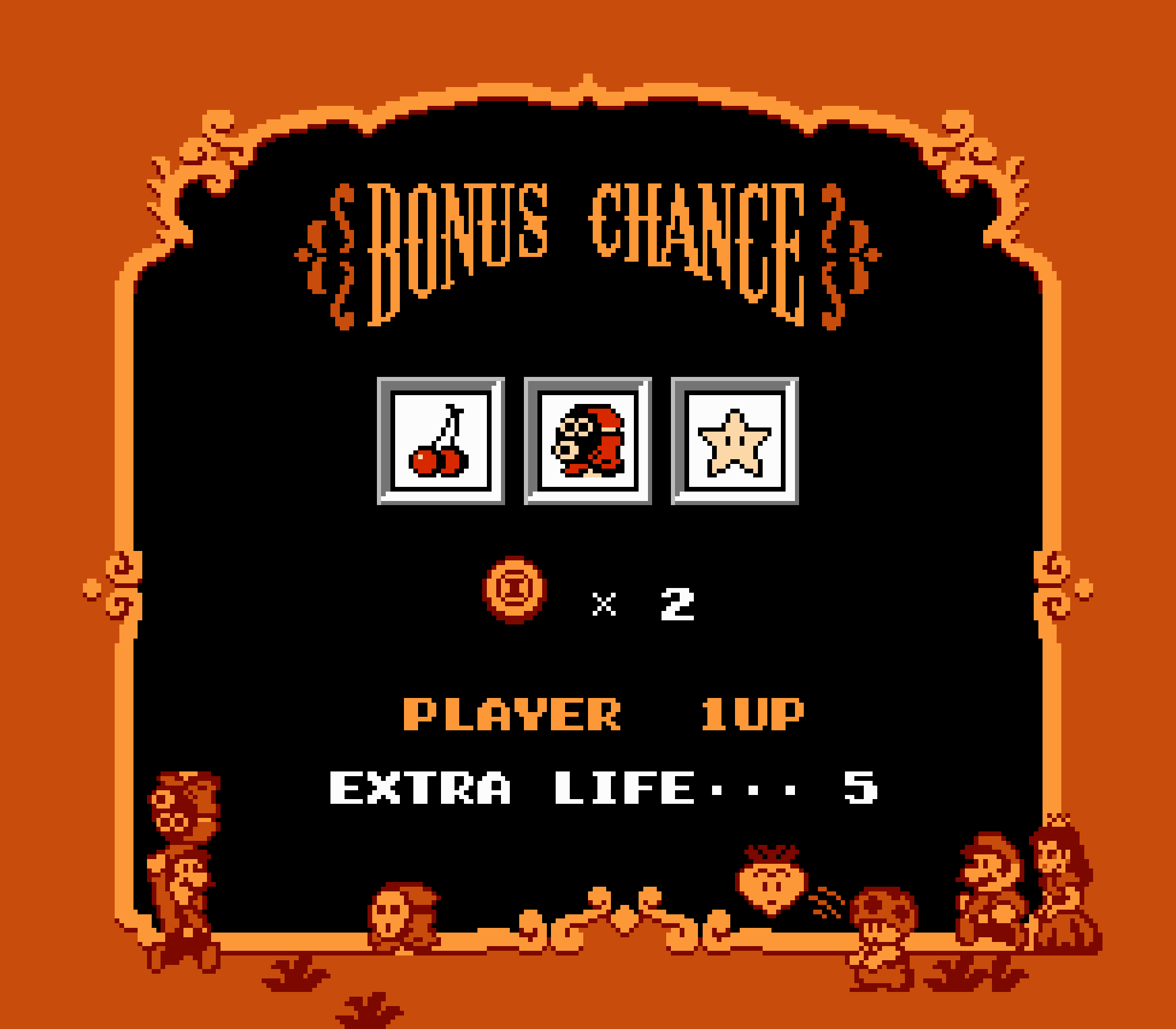 Au cours de votre périple vous trouverez également des fioles qui une fois jetées au sol, vous ouvriront une porte vers le monde parallèle. Dans ce monde temporairement accessible, vous trouverez des pièces et surtout, des champignons. Car pour une fois, notre personnage est muni d'une barre de vie. Si on se fait toucher on "rétrécit" et le champignon nous donne soit une brique de vie en plus si nous étions intact, soit la restitution de notre état "adulte". Vous l'aurez sans doute deviné, le revers de médaille c'est que ce gameplay issu de Yume Kojo, qui n'a plus grand chose à voir avec Super Mario Bros, et donc vous n'aurez jamais accés aux boules de feu (ou tout autre power up). Quand aux pièces, loin de vous donner des vies au bout de la centième, à la fin du level elles vous permettrons de jouer à un jackpot. C'est ce jackpot qui vous donnera des vies si vous faites un beau score.
