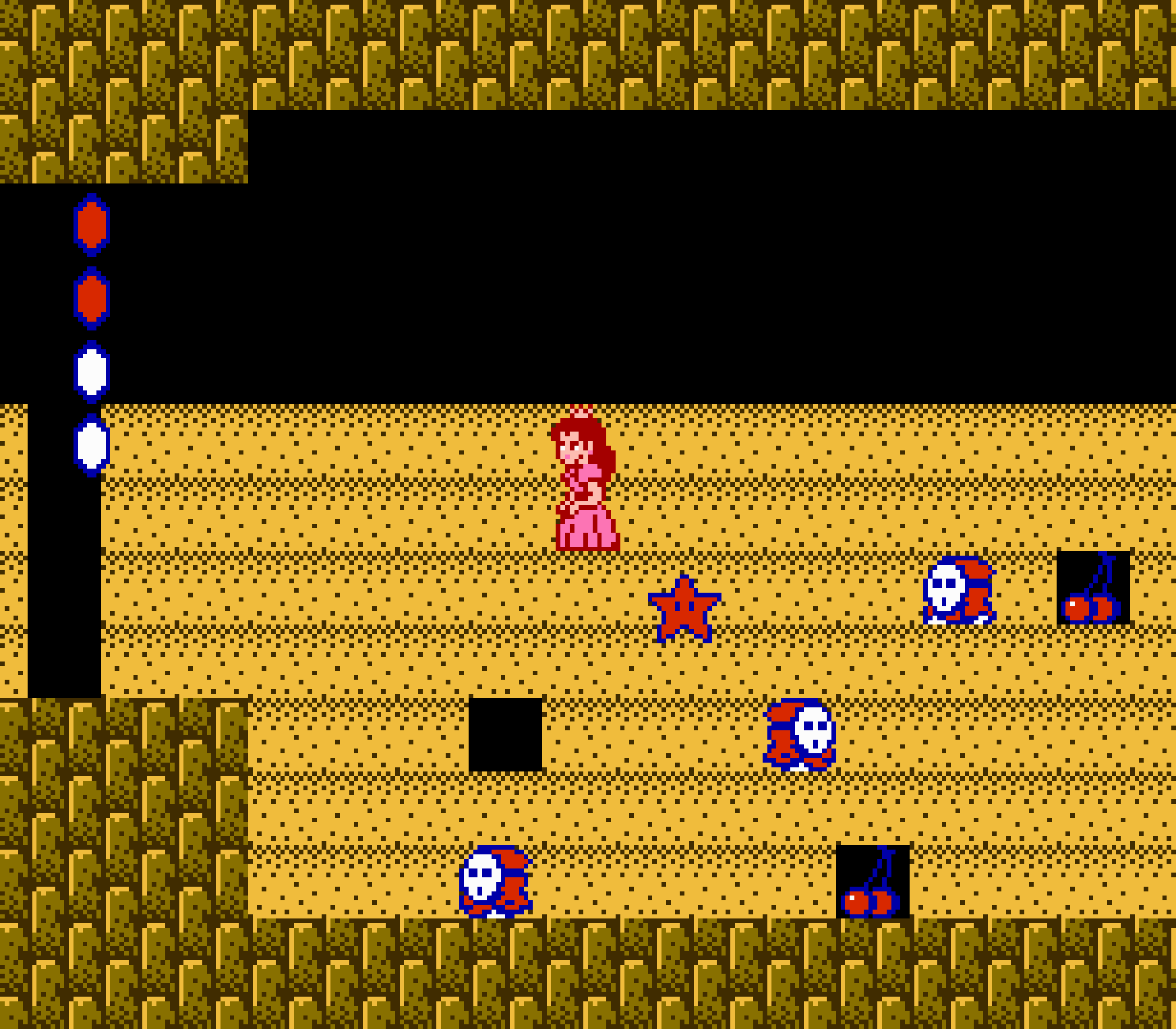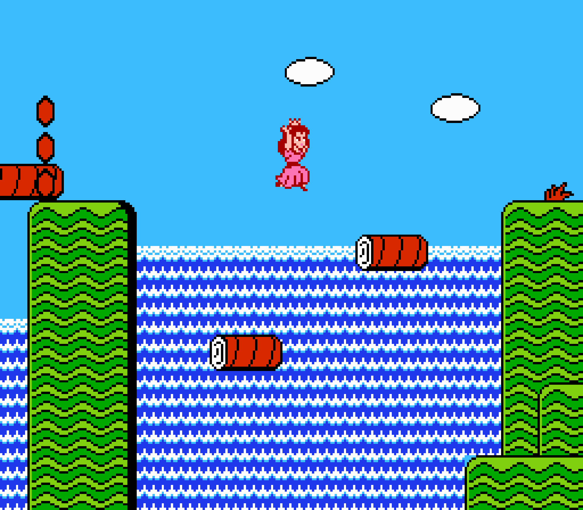 Certes plus lente, la plupart des joueurs préfèrent Peach pour ses facultés de voltige qui seront largement appréciées au cours du jeu. Hormis l'attrapage d'item (carotte, tomate, navet et même un Pow qui tue tous les ennemis à l'écran), il y a quand même un mouvement commun aux 4 : le super saut. En restant baissé pendant 2 secondes, le personnage se "charge" afin d'effectuer un saut qui mettra à votre portée une corniche auparavant trop haute. Et ce n'est pas tout...
