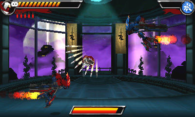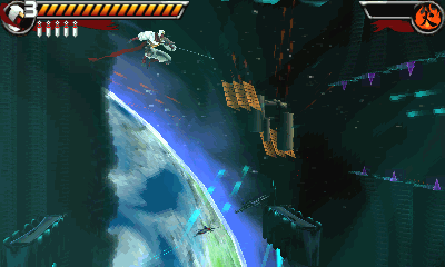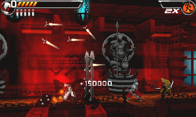 Le double saut sort à la perfection ! Enfin ! Malheureusement on n'en profitra pas longtemps tellement le jeu est duuur ! ça est parfait, mais si Shinobi 3DS n'est jamais devenu le hit qu'il aurait pu être, c'est bien qu'il a lui aussi ses défauts. Et le pire d'entre tous, c'est clairement la difficulté. En "facile" les ennemis font moins de dégâts et surtout le nombre de vies est illimité. Mais même comme ça, finir le jeu est extrêmement difficile. Les 2 premiers niveaux accusent quelques passages franchement rudes, mais avec un minimum d'acharnement, ça finit par passer. Mais arrivé au niveau 3 c'est fini, le jeu est clairement là pour vous pourrir la vie et il le fait à la perfection ! La difficulté devient hardcore, le jeu ne laisse plus rien passer : il faut être rapide et d'une précision démoniaque. Et encore là, c'est en facile ! Imaginez ce que ça donne dans n'importe quel niveau de difficulté supérieur, où en plus les vies sont comptées ! Et c'est bien tout le problème de ce jeu qui compte beaucoup trop sur son système de "parry".