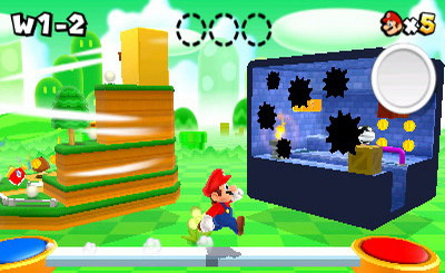 En fait, nous ne sommes jamais posés sur des rails, comme dans les "vrais" opus 2D (New Super Mario Bros compris), on peut toujours se déplacer sur la profondeur donc leur affirmation est totalement fausse, et induit même le potentiel acheteur en erreur. En effet, sans dire qu'on est proche d'un Super Mario Galaxy, il faut reconnaitre que cet épisode impose des plans de caméra très audacieux (afin de mieux apprécier la conception du niveau, ou le design), mais ils ne sont pas toujours pratiques pour le joueur. Bien entendu beaucoup de phases se jouent en simple vue de profil, mais le moteur 3D n'hésite pas à changer (à la volée) de plan. Résultat on est très loin d'un jeu 2,5D comme on dit couramment, on est véritablement sur un pur jeu en 3D, la seule chose qui change réellement, c'est que la caméra n'est pas toujours derrière le dos de Mario.