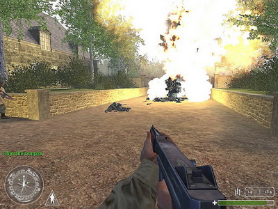 Forcément, avec un jeu qui s'inspire de faits historiques, difficile d'avoir un scénario réellement surprenant suit une sorte de couloir imposé et impossible de faire ce qu'on veut. Tout est fait pour qu'on suive le déroulement de l'aventure comme les développeurs l'entendent. Par exemple on pourrait se dire qu'on va aller de l'avant, passer par dessus une murette et péter la gueule à tout le monde...Et bien non non non, tant que le sergent n'aura pas ouvert le portail (parfois c'est un mur qu'ils font sauter), personne ne passe, tout le monde reste là. Ce n'est qu'une fois qu'on aura réalisé quelque chose (comme tuer tous les mecs qui nous canardent) que le script se déclenche et qu'on pourra passer. Selon le studio, cette direction artistique est justifiée par le fait qu'un jeu scripté est forcément plus dynamique, plus spectaculaire. Mouais, ça dépend. Question gameplay, Call of Duty fait dans le grand conventionnel avec des missions à accomplir et un arsenal somme toute classique : 1 flingue, 2 fusils et des grenades.