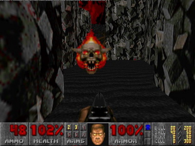 Le scénario se résume à 3 fois rien... même sur la version CD-Rom. C'est vraiment dommage j'ai connu le fabuleux DOOM, c'était en 1997 sur PlayStation. Une superbe version parfaitement adaptée de l'original : graphismes à l'identique, même gameplay, mêmes levels... il ne manquait rien. Et c'est avec ce jeu que j'ai commencé à apprécier les FPS (j'ai ensuite acheté le non-moins hypnotique Alien Trilogy sur la même console). Littéralement, DOOM veut dire "destin funeste" ou "damnation". Il fut développé en 1993 par id Software, une petite société qui a vu son chiffre d'affaire grimper en flèche à la sortie de Wolfenstein 3D, le précurseur des FPS actuels : vue subjective, plusieurs armes, des niveaux fermés et infestés d'ennemis, une belle polémique puisqu'on affronte des nazis... il n'en fallait pas plus pour créer une révolution ! Considérée comme sa suite spirituelle (les 2 jeux n'ayant -scénaristiquement parlant- rien à voir), DOOM a amélioré le concept ainsi que le moteur graphique et proposait en plus, un gameplay plus riche et une jouabilité moins restrictive (je rappelle qu'à l'époque de Wolfenstein 3D et de DOOM, la souris n'était que très peu répandue et donc, on jouait au clavier).