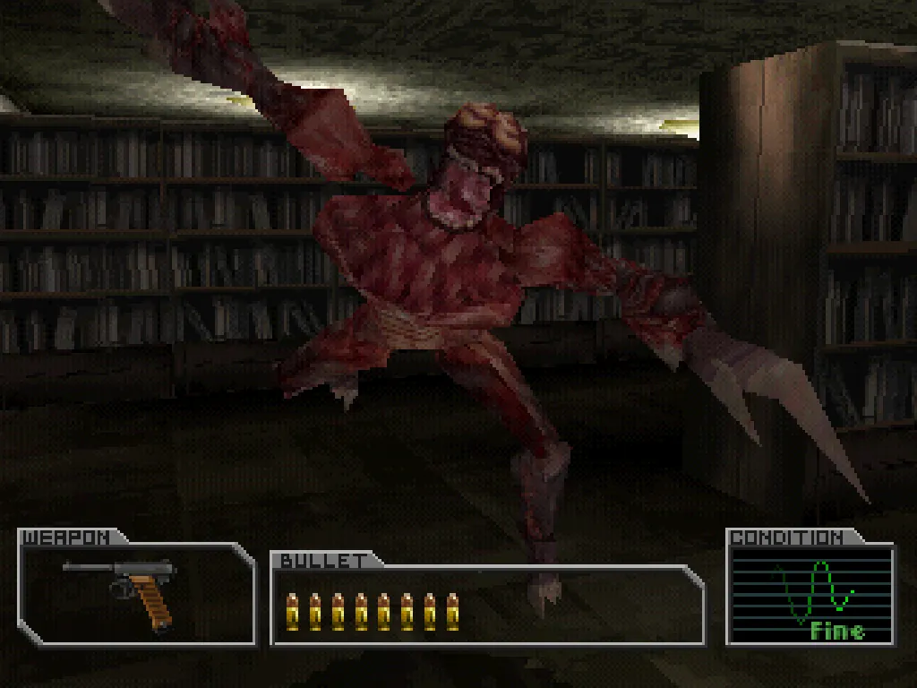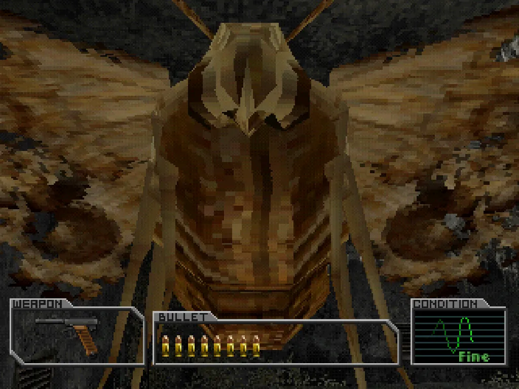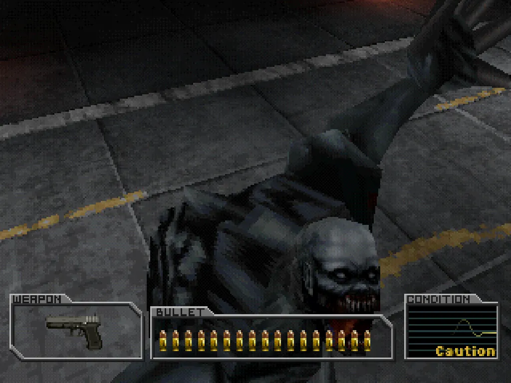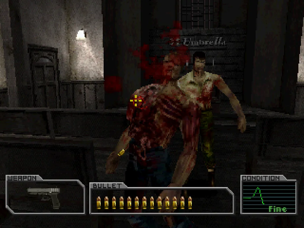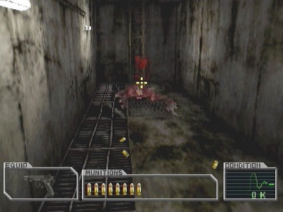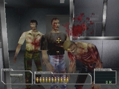 Le mélange FPS / rail shooter aurait pu être sympa mais échoue sur les 2 plans les USA alors ? Et bien sachez que le jeu a été retardé sur le territoire américain (il sortira 5 mois après la version EURO) car le massacre de Columbine (survenu en avril 1999) a retourné le pays (d'ailleurs il résonne encore). Voilà pourquoi Capcom a pris la décision de retarder la sortie du jeu (qui était prévue à peu près au moment de son triste 1er anniversaire) et de supprimer la compatibilité avec le GunCon, le jeu se jouant alors essentiellement à la manette. Vous l'aurez compris, les déplacements sont fastidieux, volontairement léthargiques (sans doute pour essayer de rallonger un peu la durée de vie - et dans ces conditions, il n'est vraiment pas évident d'éviter un Mister X) mais le pire reste sans conteste les combats, avec sa visée bien trop poussive et imprécise. Heureusement, les développeurs ont prévus une petite aide à la visée et même, en pressant L1, notre personnage se mettra à regarder vers les points d'intérêts : ennemis, porte, objets...