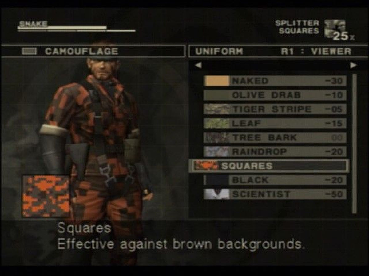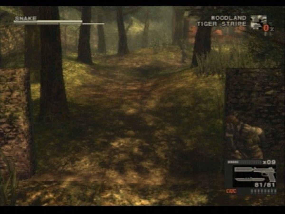 Ces nouveautés se passent via le menu pause, ce qui n'est pas pratique mais ça aurait pu être pire, l'ergonomie n'étant pas si mauvaise. Et c'est dans ce même menu qu'on pourra consulter une carte topographique de la région et surtout changer son camouflage. Troisième nouveauté notable, étant donné qu'on est lâché en pleine forêt, Snake doit rester à couvert et agir dans l'ombre. C'est pourquoi on choisira au mieux une peinture pour le visage ainsi qu'une tenue qui se fondra le plus possible avec le décor. Il y a d'ailleurs un vumètre de furtivité qui nous permet d'apprécier de façon numéraire, l'efficacité de son camouflage.