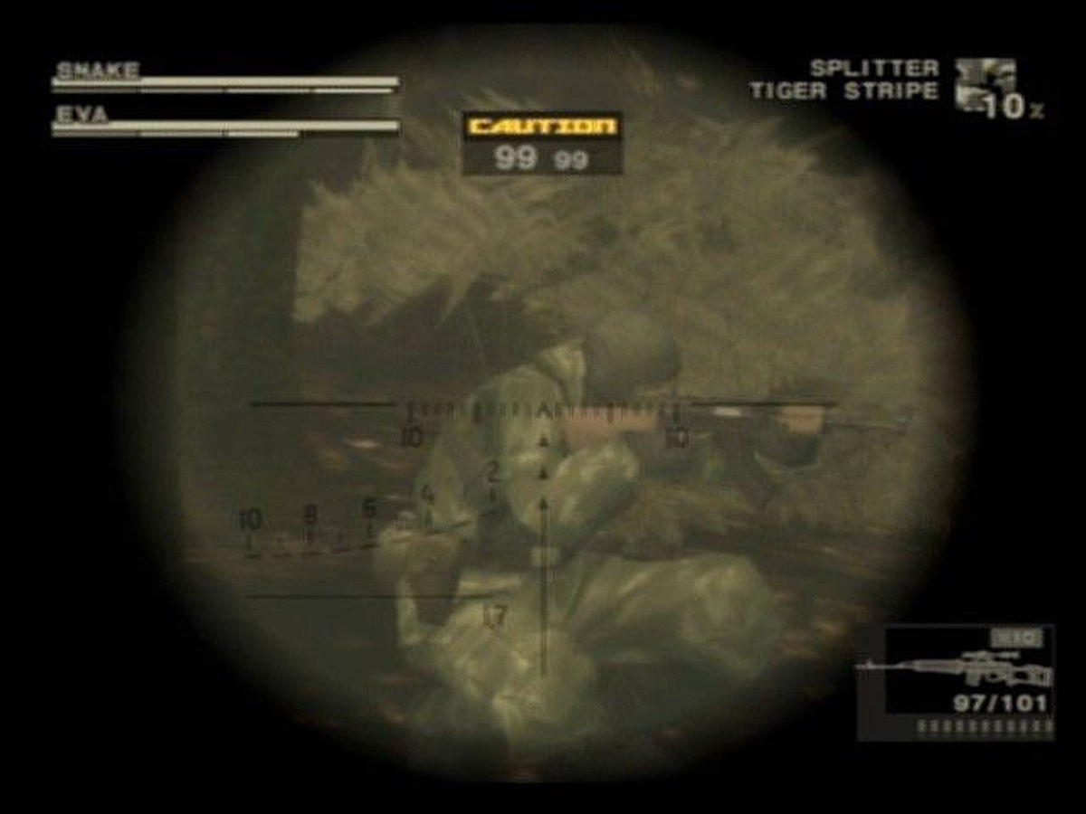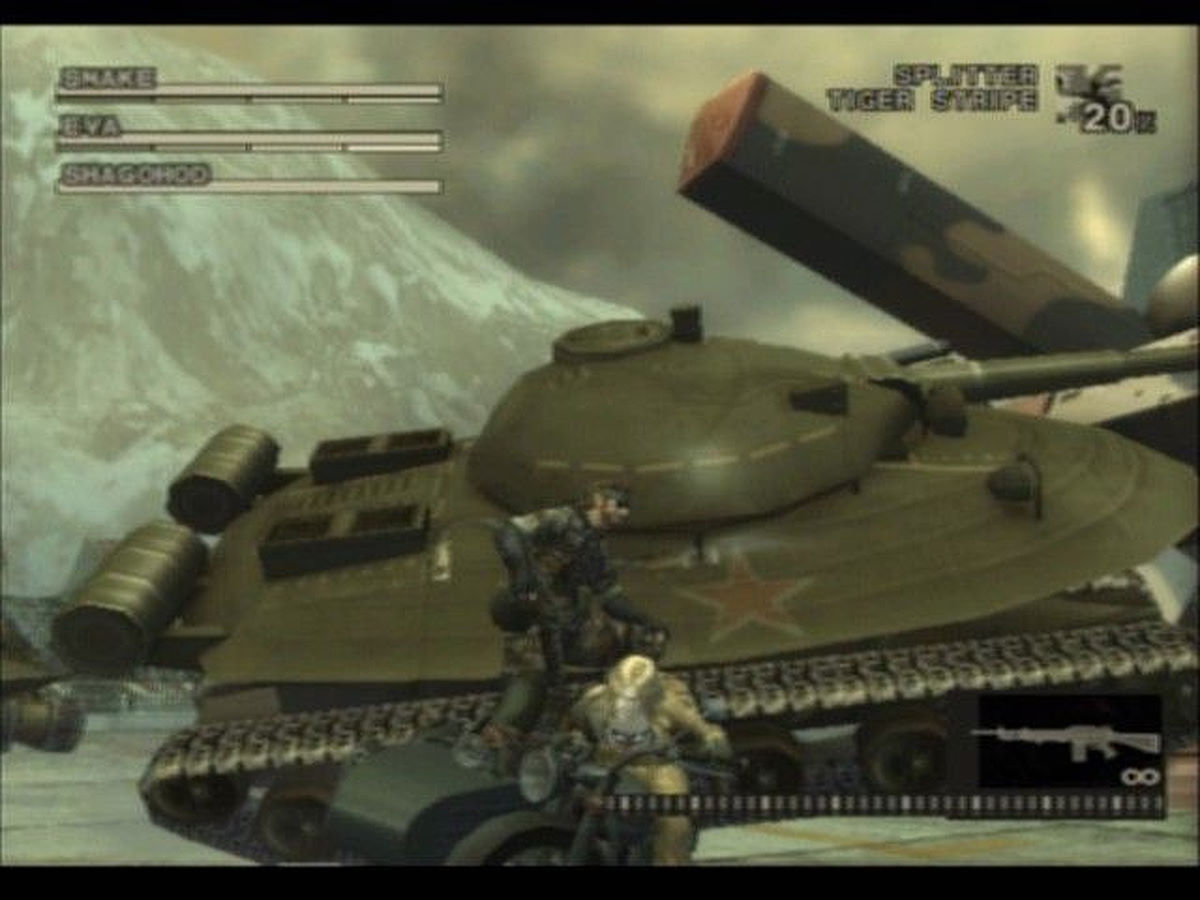 Les cut-scenes sont les plus belles et les plus poignantes que j'ai vu sur PS2 contre Raiden est au centre d'une mission (celui-ci ressemblant à Raikov), où on devra se faire passer pour lui en portant un masque. Et si on est un peu déçu de ne pas (encore) jouer avec le grand Solid Snake (le héros du premier épisode), jouer avec Naked Snake compense bien et évite la frustration de jouer un autre héros. Dans cet épisode les nouveautés sont nombreuses et les changements aussi. Snake Eater, pour la première fois dans la série, ne nous oppose pas à un Metal Gear mais au Shagohod, histoire d'être plus en phase avec son temps (encore que, dans les années '60 la technologie n'était pas si avancée). D'ailleurs, on comprend assez vite que le Shagohod n'est que l'ébauche du Metal Gear REX de Shadow Moses.