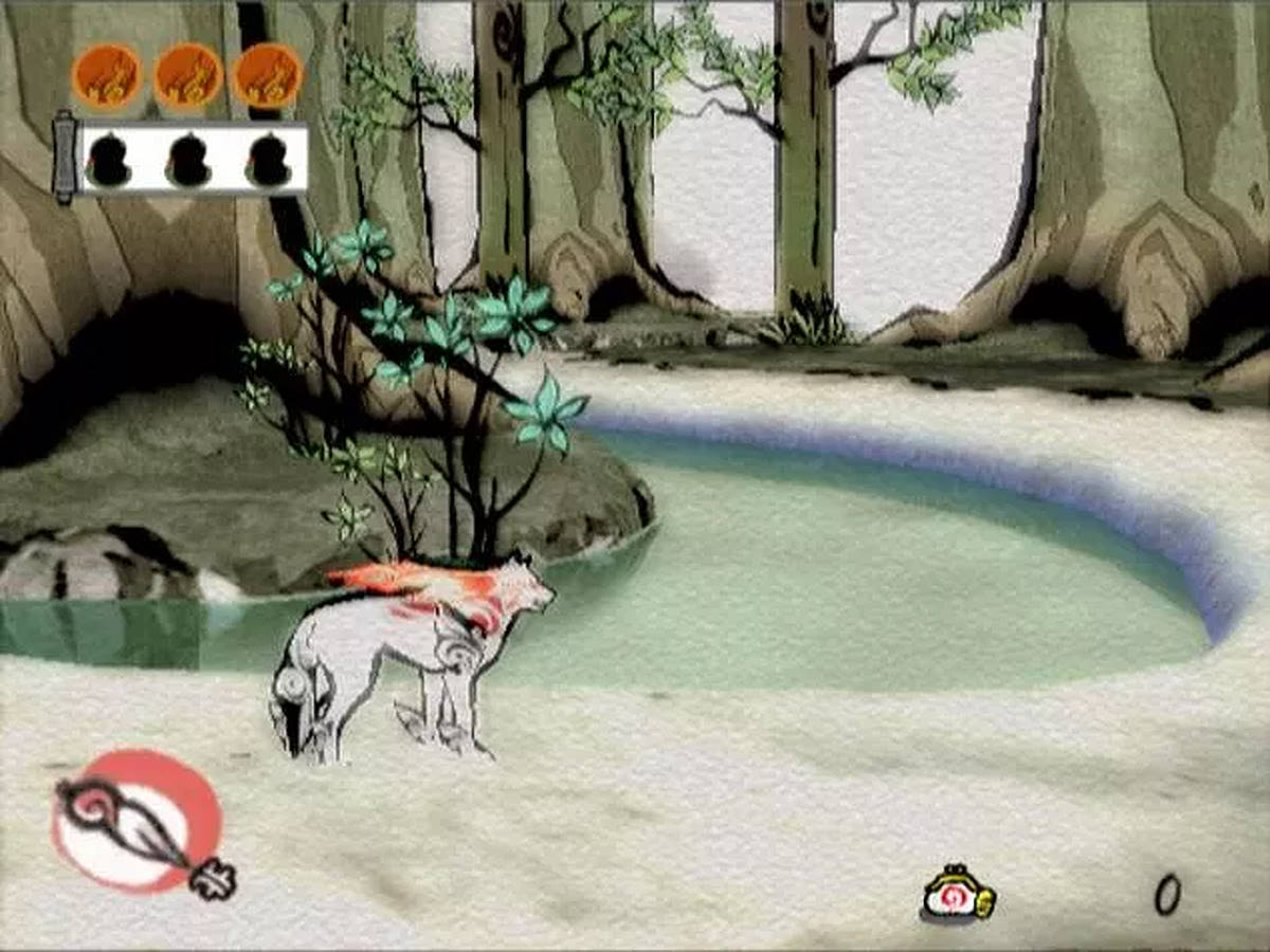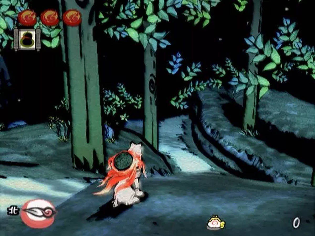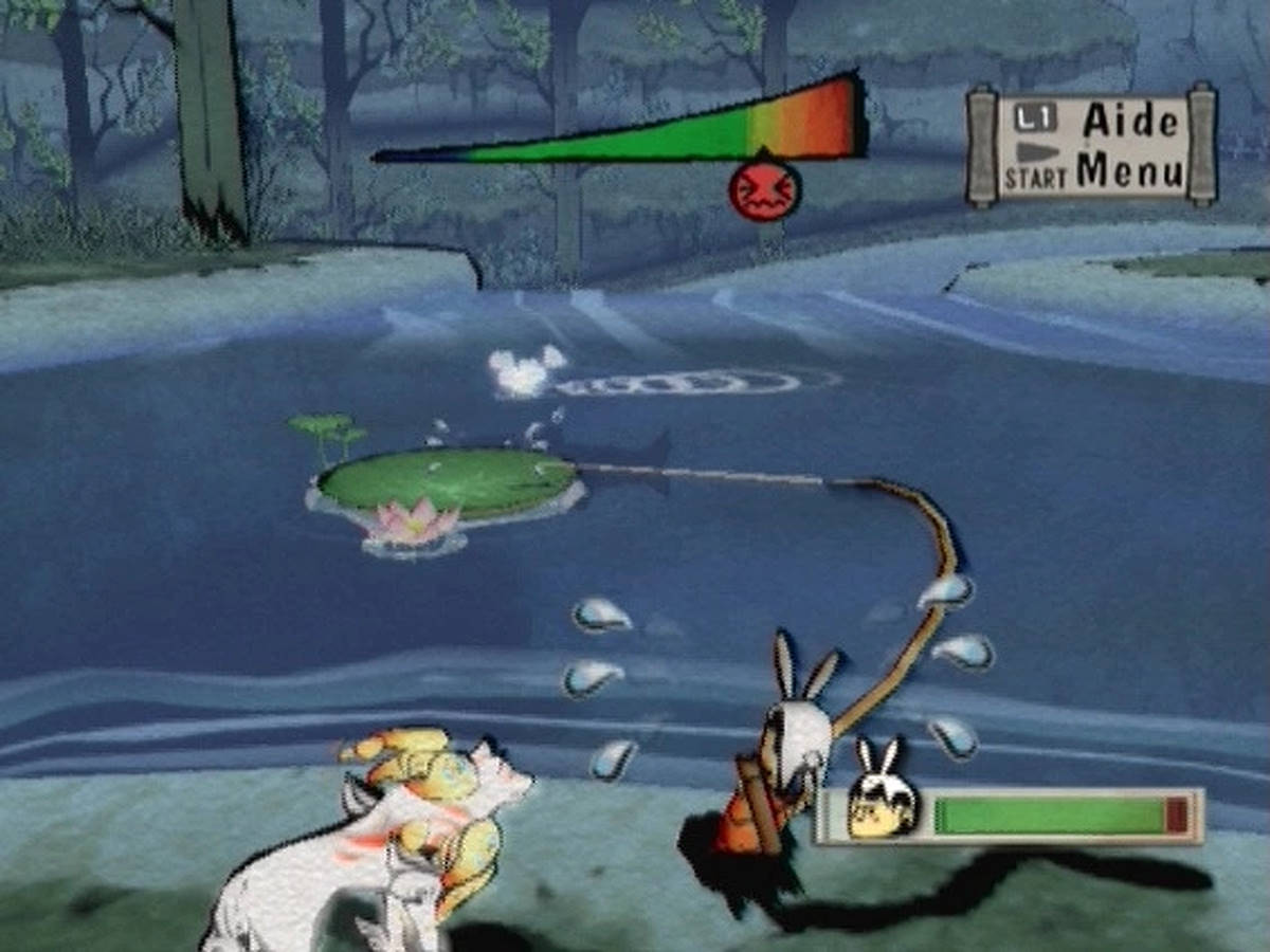 Le pinceau céleste permet d'attaquer et de résoudre des énigmes est une louve, ce qui fera immanquablement penser au loup de Zelda Twilight Princess. D'ailleurs on peut facilement aligner les 2 jeux pour leur approche de l'aventure et même des séances de pêche improvisées. La vue est donc à la 3e personne, on dirige notre personnage avec le stick gauche, le droit servant à la caméra. Et nous allons de suite parler de l'unique véritable défaut du jeu : la caméra justement. Bien souvent trop proche, ce qui nuit à la bonne lisibilité de l'action, on a la possibilité d'éloigner le champ de vision en pressant L1. C'est pratique pour les déplacements mais ça ne marche pas à tous les coups car dès qu'elle en a l'occasion, la caméra se repositionnera de façon classique. Autant le dire, elle est assez pénible car bien souvent elle est mal placée, ce qui nous empêche de bien apprécier nos mouvements. C'est d'autant plus vrai lors des combats.