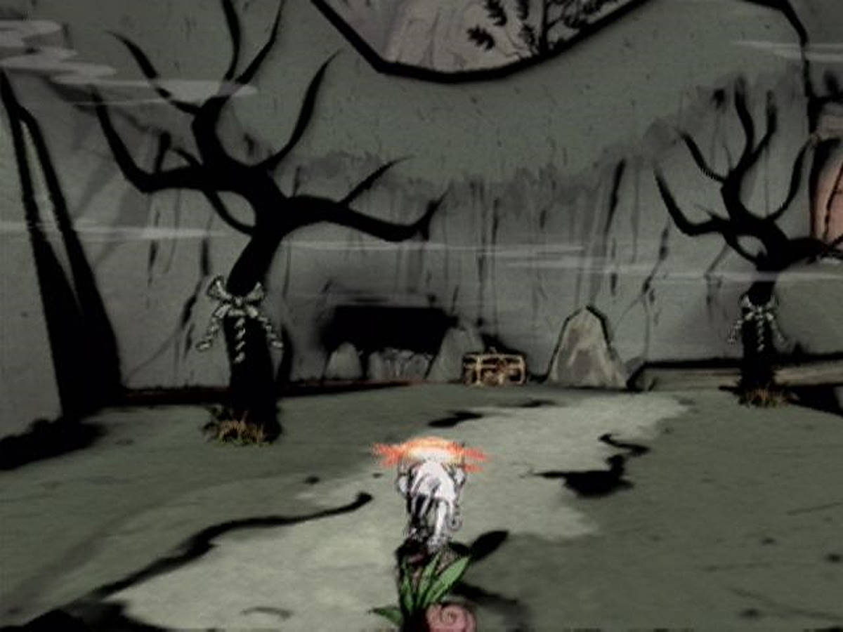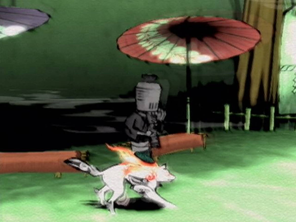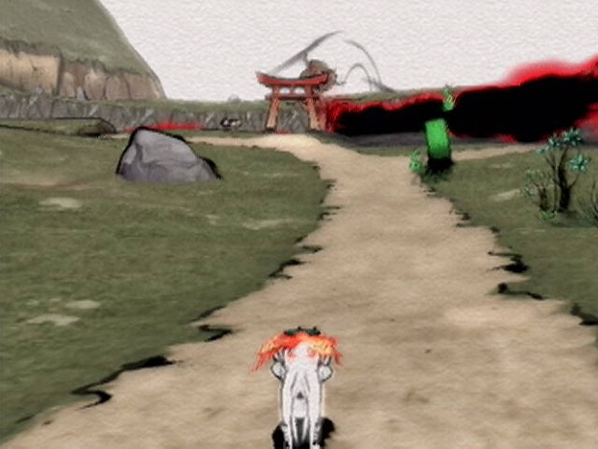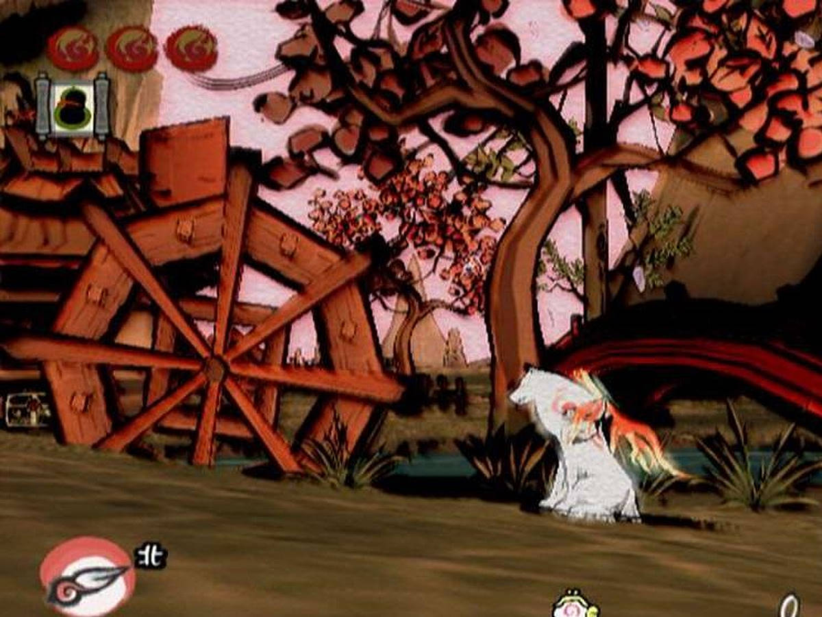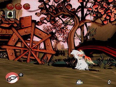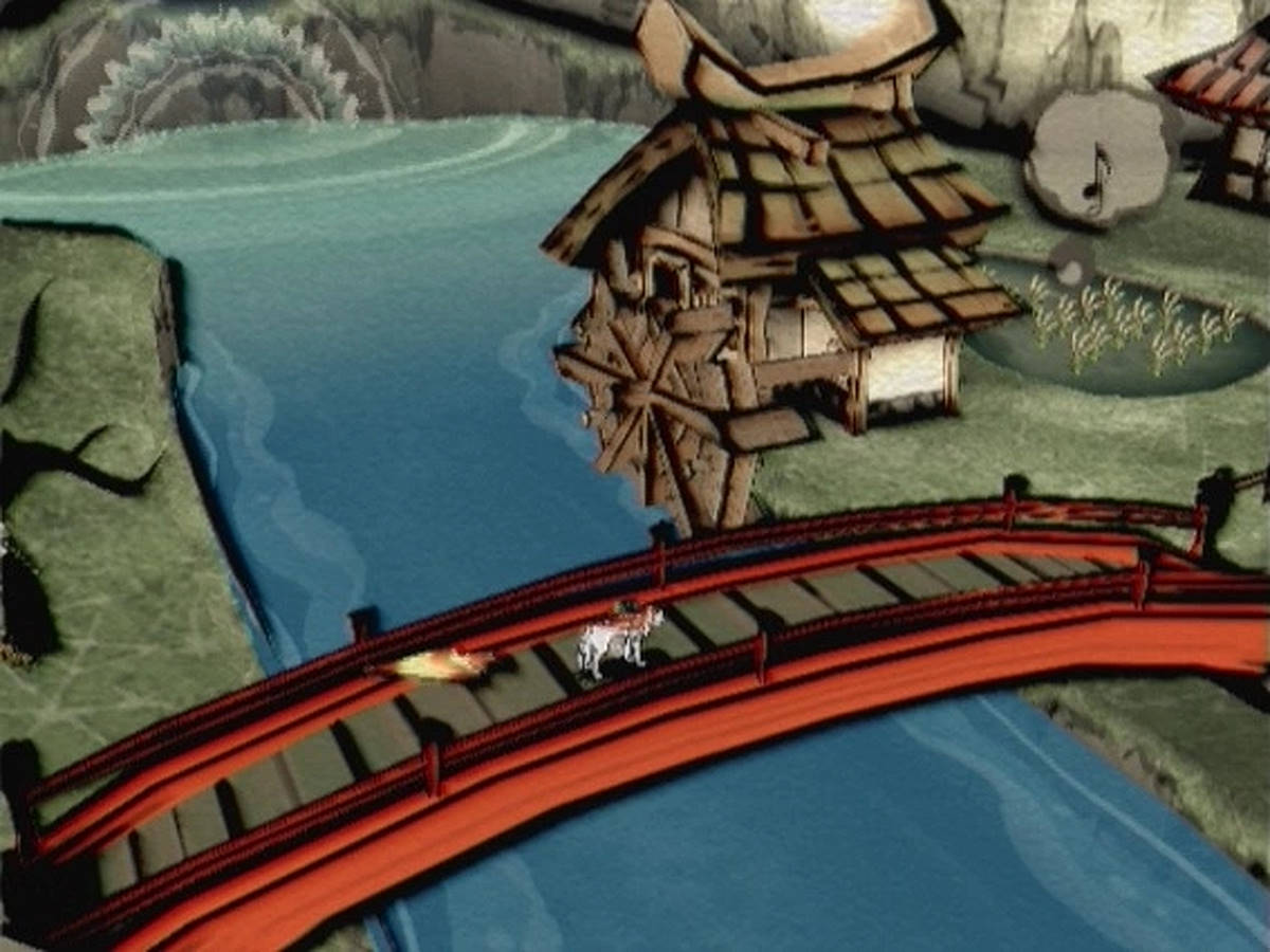 La qualité graphique, tout en cel-shading, est absolument fantastique ! Okami est une véritable poésie animée fonctionne sous le moteur Criware, un middleware performant et très usité mais dont personne ne soupçonne l'existence. N'empêche que ce performant moteur graphique nous offre un jeu exempt de bug et dont le design est véritablement enchanteur. Avec un style graphique en cel-shading hyper prononcé, comment ne pas craquer pour l'esthétique hors-norme du jeu. Lorsqu'Ama redonne des couleurs à une plaine autrefois envahie par le mal, ce sont des milliers de fleurs qui poussent instantanément et recolorent tout le décor. La patte artistique est impressionnante, envoûtante, c'est tantôt inquiétant, tantôt éblouissant de tendresse, c'est si beau qu'on n'a pas besoin de haute-définition pour apprécier tout l'art de ces graphistes de génie. Entièrement détouré, comme si certains contours étaient fait au pinceau (parfois même avec des coulures caractéristiques), il est tout bonnement impossible de ne pas tomber sous le charme de cet univers colorés qui renoue d'anciens liens sacrés entre les Hommes, les animaux et la nature. Les personnages m'ont de suite rappelé le style graphique de PaRappa The Rapper (PSX) puisqu'ils semblent "plats".