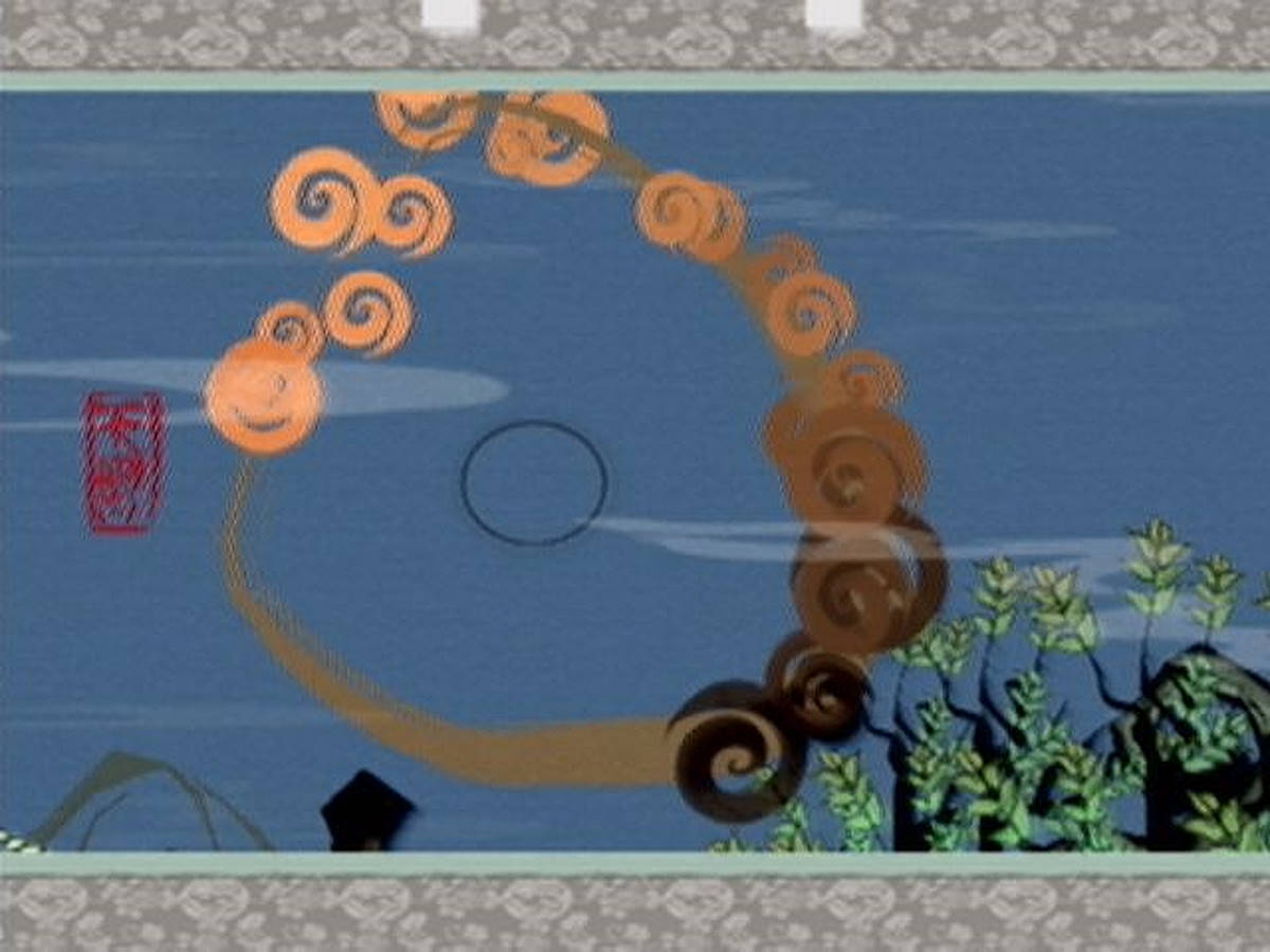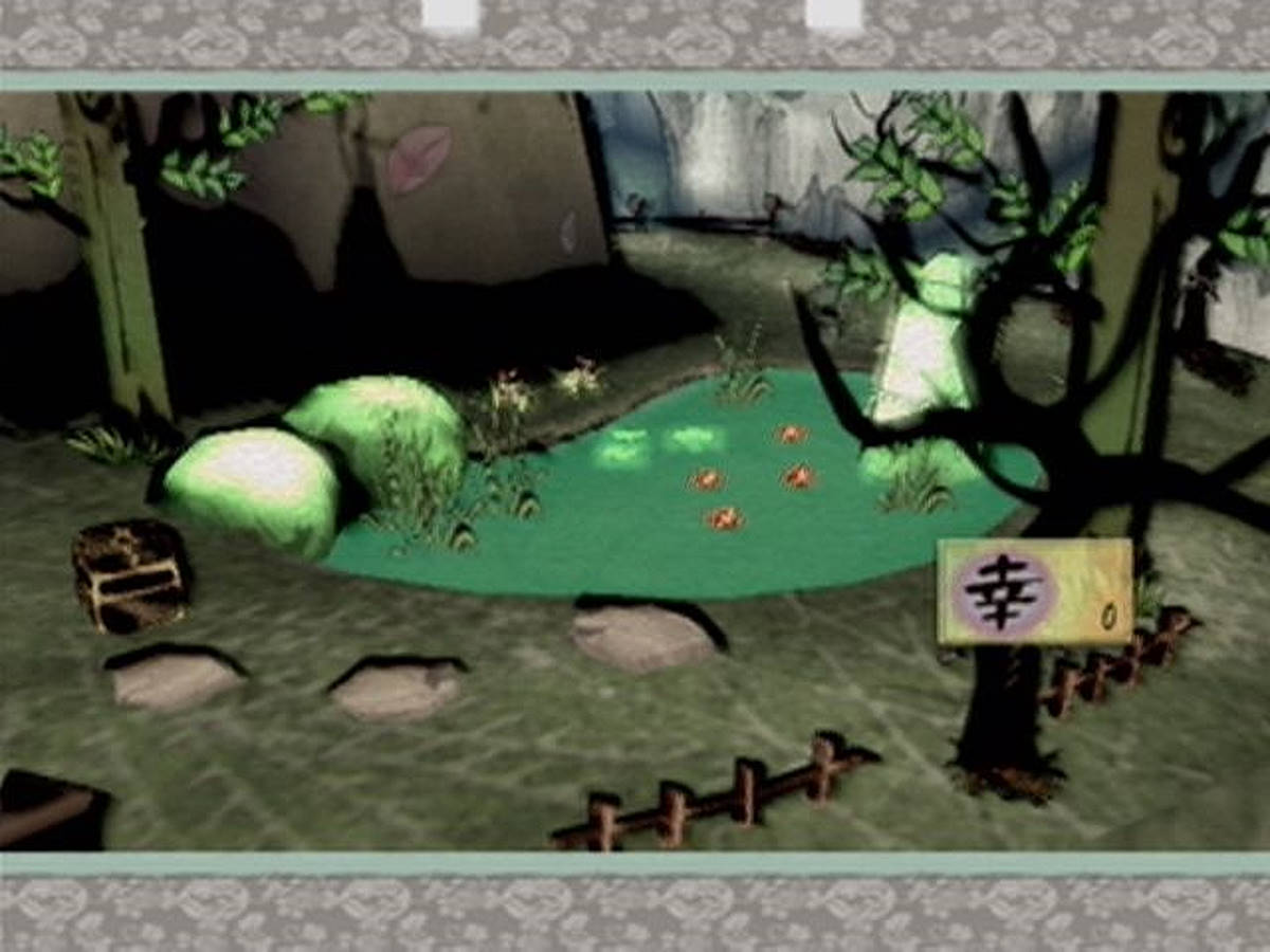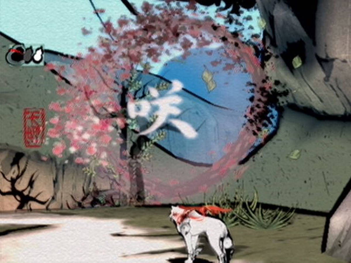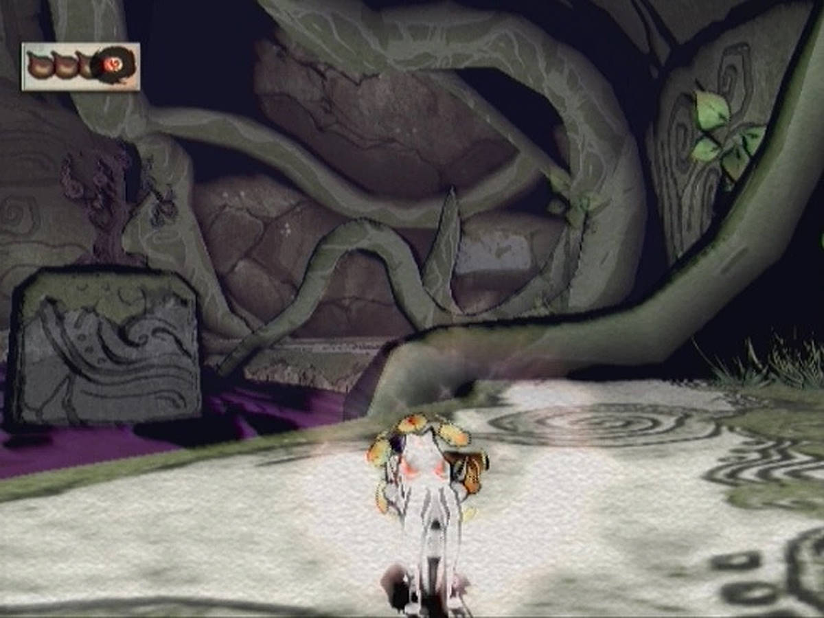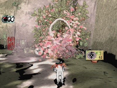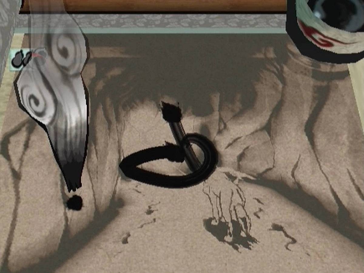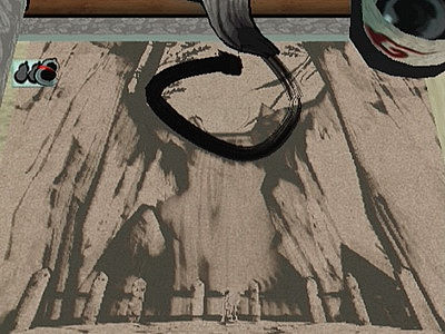 Cet unique point noir est le seul véritable défaut du jeu, pour ainsi dire celui qui empêche Okami d'atteindre la sacro-sainte note finale de 20/20. A part ça, et au cas où vous dormiez depuis le début de ce test, on est en présence d'un très grand jeu d'aventure. Amaterasu est une divinité incarnée en animal (c'est courant au Japon) mais lorsqu'on commence l'aventure, elle n'a presque rien pour elle. C'est alors qu'on découvre le pouvoir du "Pinceau Céleste", énorme nouveauté de ce titre. En pressant R1 on passe en mode calligraphique. L'image se fige, devient monochromatique et avec un pinceau qu'on manie grâce au stick gauche, il est possible de réaliser diverses actions.
