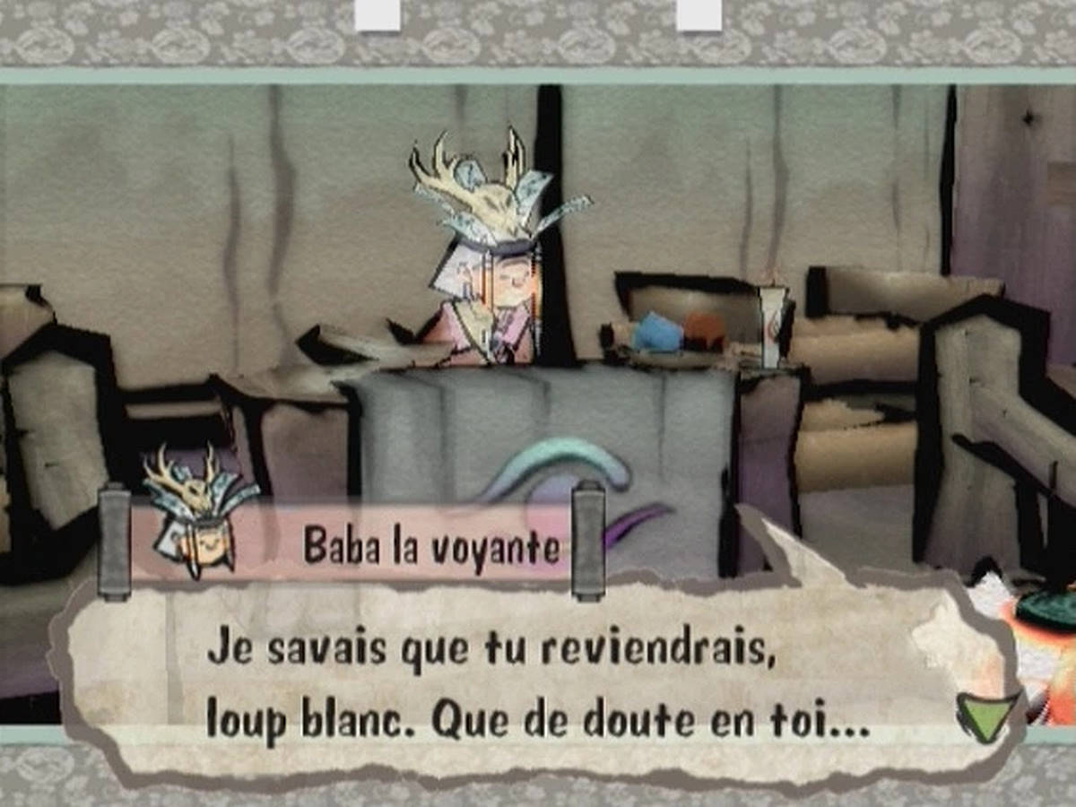 Les musiques ont ce charme envoûtant qu'on ne rencontre que très rarement dans un jeu grands auteurs, ceux qui veulent nous faire vivre quelque chose de différent, l'ont bien compris : il ne faut pas de doublage pour garder toute la féérie de l'univers créé. On l'a bien vu avec ICO ou avec Shadow of the COLOSSUS et une fois encore, il n'y aura pas de jaloux. Cette fois pas de langage inventé pour l'occasion, Okami propose une toute autre approche puisque les dialogues semblent être chuchotés, sans même chercher à être compréhensibles. Et une fois de plus, cette formule unique met tout le monde d'accord. Car si le jeu avait été doublé, du mieux qu'il pouvait, que ce soit en français, en anglais ou même s'il était resté en japonais, l'atmosphère ne serait plus là même. Il n'y aura donc rien à redire pour cette nouvelle prise de position car elle sert plus qu'elle ne dessert l'ambiance. A côté de ça on a un jeu bien traduit, qui incorpore quelques tournures de phrase bien de chez nous (et ce, même s'il subsiste encore quelques fautes d'orthographes pas bien méchantes). On notera aussi qu'Okami ne manque pas d'humour. Le jeu n'est pas spécialement drôle, là n'est pas sa vocation première, mais de temps en temps il nous fera une petite blague au détour d'une cinématique ou d'un dialogue, ce qui prêtera gentiment à sourire.