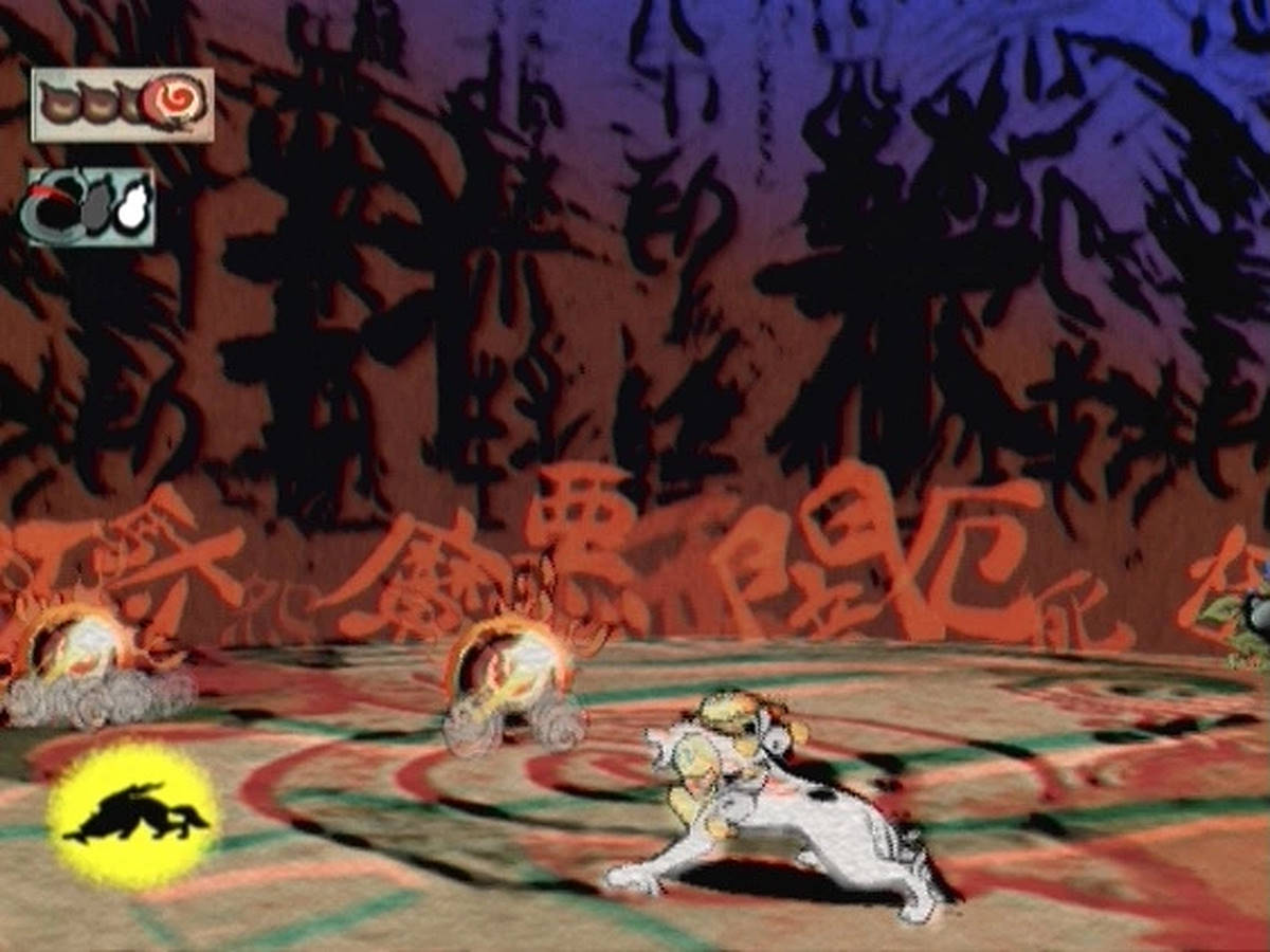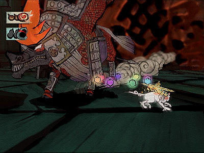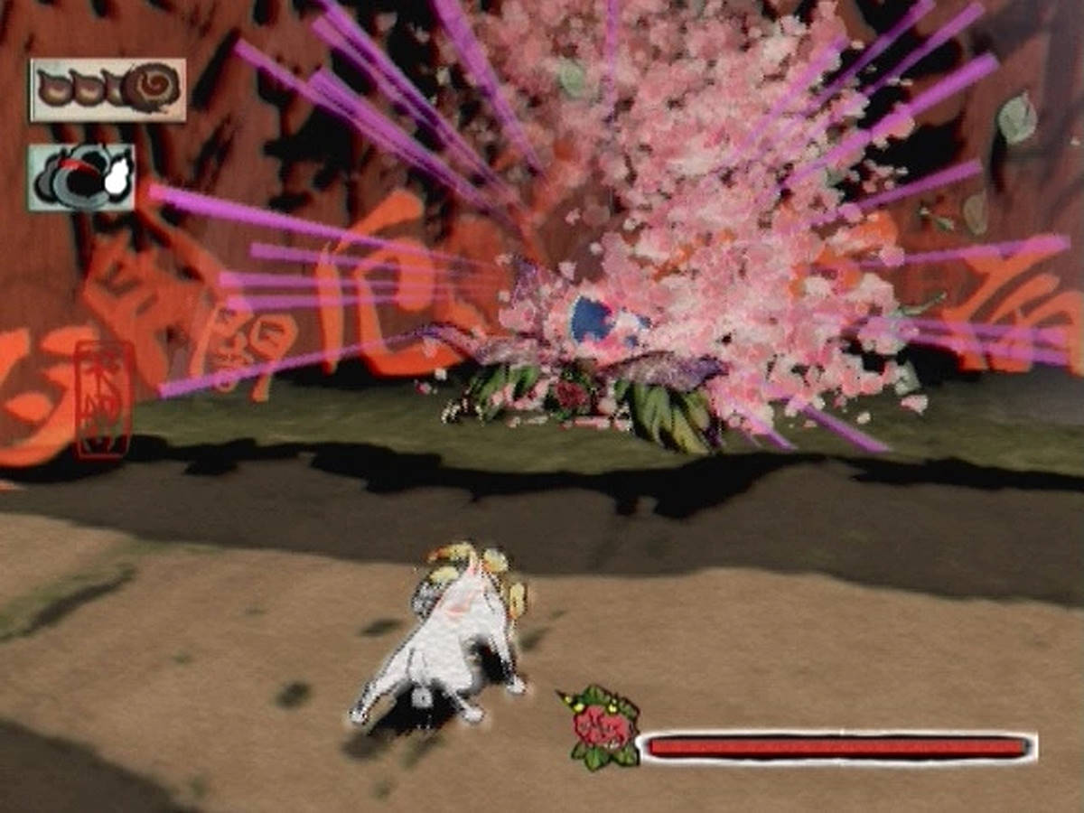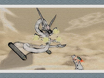 Les combats, proche d'un beat-them-all, sont très dynamiques. Ama passe en mode agressif et se sert alors de ses armes. La zone de combat est délimitée mais ça n'empêche en rien le fait d'avoir des affrontements vigoureux. Pour les niveaux à proprement parler, sorte de donjons faussement maquillés, le principe est le même et la zone se termine toujours par un boss, souvent long à tuer. D'ailleurs il faut signaler que le jeu n'est pas difficile, loin de là. Si on a la bonne technique, qu'on utilise intelligemment le pinceau et qu'on prend son temps, il n'y a aucune raison de perdre puisque la difficulté est parfaitement dosée.