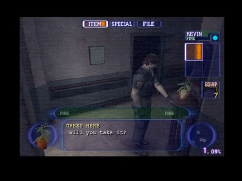 En effet, Outbreak se cale entre Resident Evil 2 et 3, juste avant que Raccon City ne soit rasée de la carte. Notre petit groupe a donc pour but de fuir la ville. Le gameplay, même s'il n'a pas fondamentalement changé, s'essaye à une nouvelle mécanique : le temps ne s'arrête jamais ! Ainsi, si vous lisez un journal ou mixez des herbes pour vous soigner, vous pouvez aussi vous faire attaquer. Ce sentiment d'insécurité permanente est complètement flippant ! S'il y a toujours des machines à écrire pour sauvegarder, il n'y a plus de coffre et il faut ajouter à ça un inventaire ultra restrictif. Chaque personnage ne peut porter que 4 objets (8 pour l'une des filles) ce qui est trop peu et nous force souvent à poser des items. Pire, rien que le fait de respirer l'air nauséabond de la ville, vous infecte peu à peu. Une jauge de virus est donc installée, faisant monter d'un cran une tension déjà presque insupportable. Il est évident que si vous vous faites mordre, le taux grimpe en flèche. Croyez-moi, les herbes bleues sont vos meilleures amies.