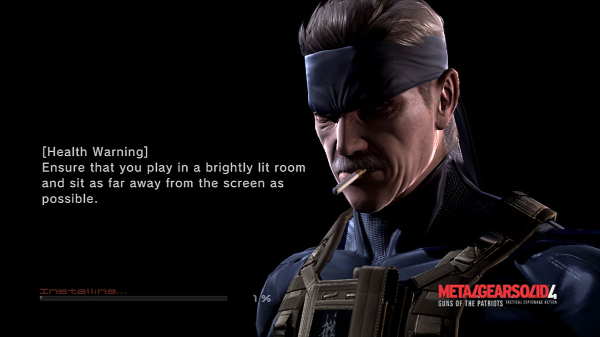 En vue de tester le dernier épisode en date, Metal Gear Solid V pour ne pas le citer, j'ai pris plaisir à rejouer à la série. Et c'est là que mon jeu s'est updaté en version 2.0 (la mise à jour pèse environ 500 Mo), avec ce que ça a apporté de nouveautés. Tout d'abord il faut savoir que les serveurs de Metal Gear Online ont été fermés en juin 2012 (le service n'aura donc duré que 4 ans). A l'heure de cette relecture, nous n'y avons donc plus tout accès. A côté de ça, le mode solo y a beaucoup gagné, avec tout d'abord la possiblité d'installer son jeu en une seule fois ! L'installation fait tout de même 9,1 Go, mais on n'aura plus ces interminables interludes où Snake se craque une clope et ce, 5 fois durant l'aventure (sans parler que si vous repreniez la sauvegarde d'un autre chapitre, il fallait d'abord l'installer pour pouvoir y jouer). Le plus gros déboire de Metal Gear Solid 4 est donc derrière nous.