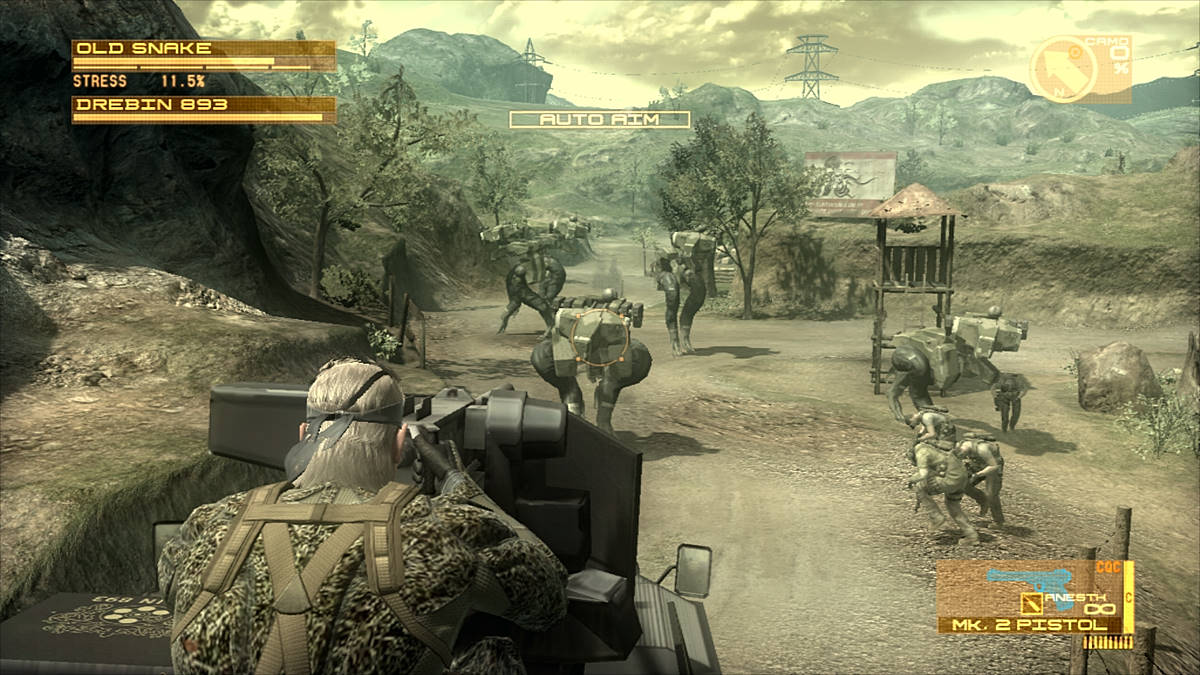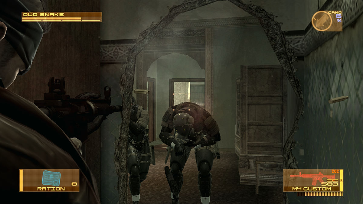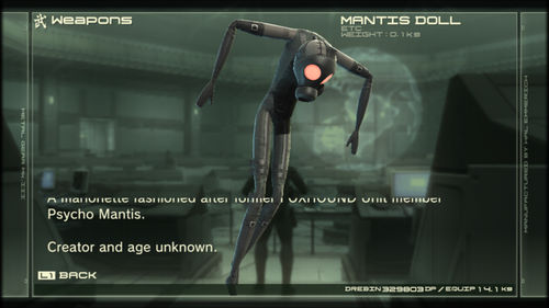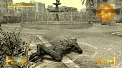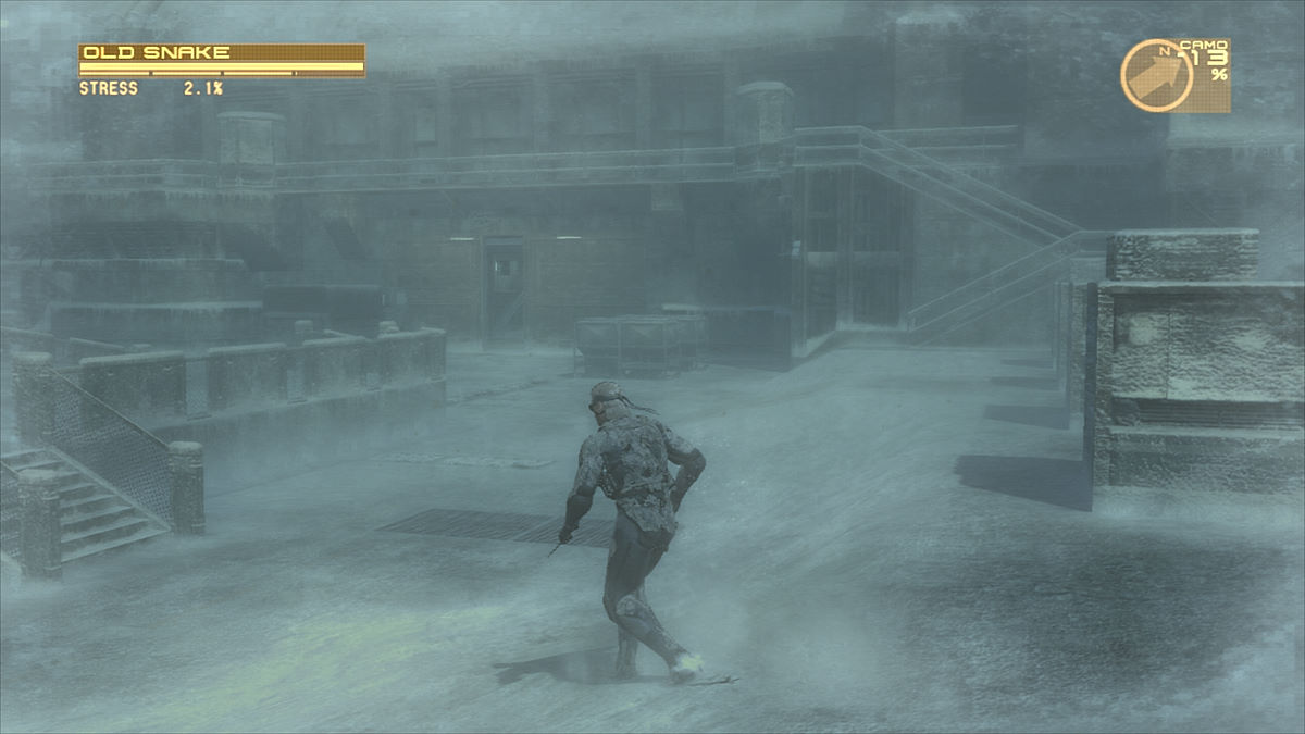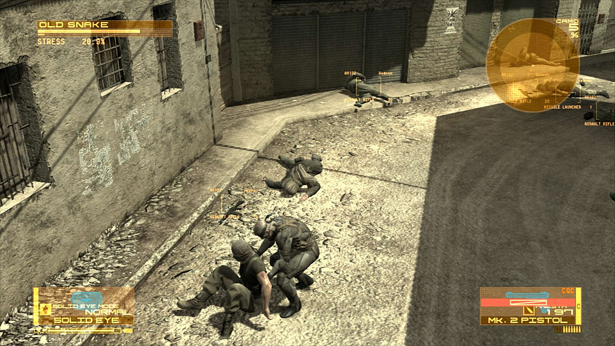 Le Mk. II n'est qu'un gadget mais il permet d'avoir une approche subtile des lieux l'aspect survie de Metal Gear Solid 3, il n'y a plus de recherche de nourriture, ni de système de guérison. C'est un peu dommage mais on a d'autres avantages, car le jeu est cette fois divisé en 5 chapitres. Finies les aventures qui se déroulent dans un seul et même endroit, désormais on visitera 5 lieux différents. Et pour la variété, ce n'est pas un mal. Par contre, on garde plusieurs facettes du précédent opus, comme le sac à dos. Toujours aussi peu réaliste, Snake porte une besace où sont entassés des dizaines de fusils, un lance-roquettes, un bazooka portatif, des armes de poings et tout ce qu'il faut pour se restaurer. Toujours aussi balèze le mec... En ouvrant le menu principal via le bouton Start, on devra choisir parmi tout cet attirail : 5 objets et 5 armes à "utilisation rapide". Là déjà, c'est un peu plus crédible. Point non négligeable du réalisme, nos ennemis laissent leur armes en mourrant et on pourra enfin les ramasser (il était temps). Comme chaque arme possède une "ID", certaines seront lockées, d'autres seront utilisables de suite. Et c'est là que Drebin entre en jeu.