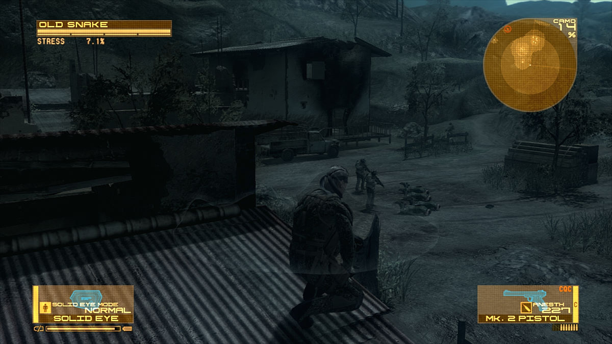 Tout d'abord l'anneau de menace (lorsqu'on est assis ou couché) est un gadget totalement inutile (je me demande même pourquoi ils ont inclus ça) puisqu'il est trop petit pour apporter une quelconque alerte de proximité. Globalement, le jeu est plutôt facile. Le mode "easy" porte bien son nom et avec lui, il sera laborieux de perdre, même une seule fois. Pour les habitués, préférez au moins le mode "normal", les ennemis y sont un peu moins débiles et aveugles. Et pour finir, Snake possède 2 nouvelles jauges : le taux stress et la jauge psychologique. Le stress grimpe au fil des combats, de la chaleur ou du froid. La jauge psychologique est l'endurance mentale de Snake. Le psychisme affecte aussi ses capacités et sa précision de tir. Le niveau de stress détermine la vitesse à laquelle la jauge diminue. Pour l'améliorer (et aussi remonter sa jauge de vie sans prendre de ration), il faut se cacher et prendre du repos.