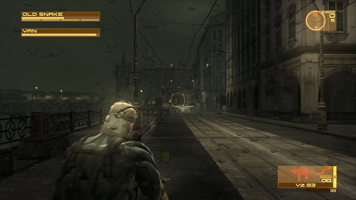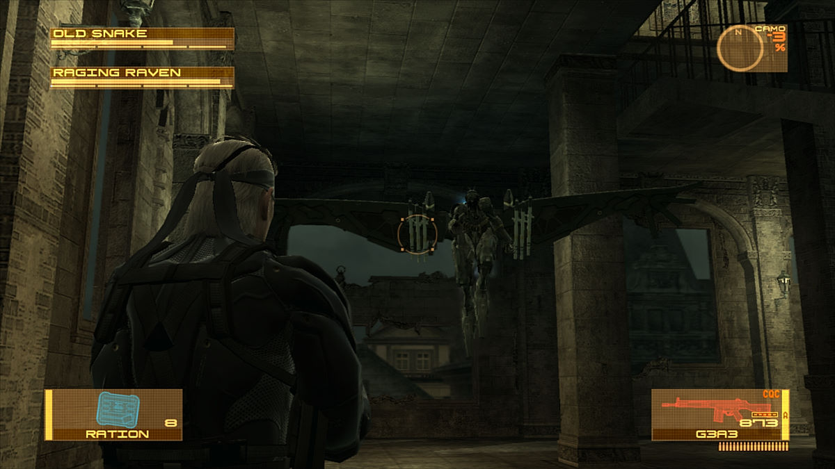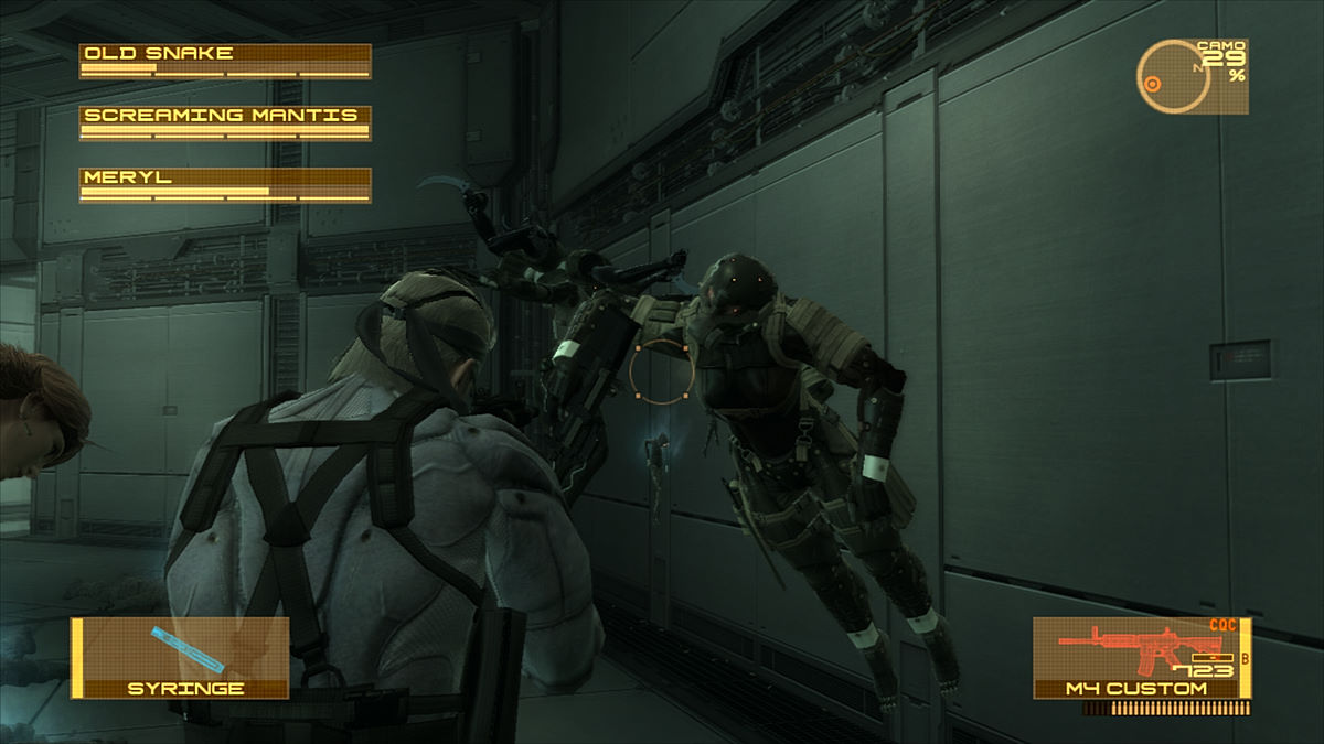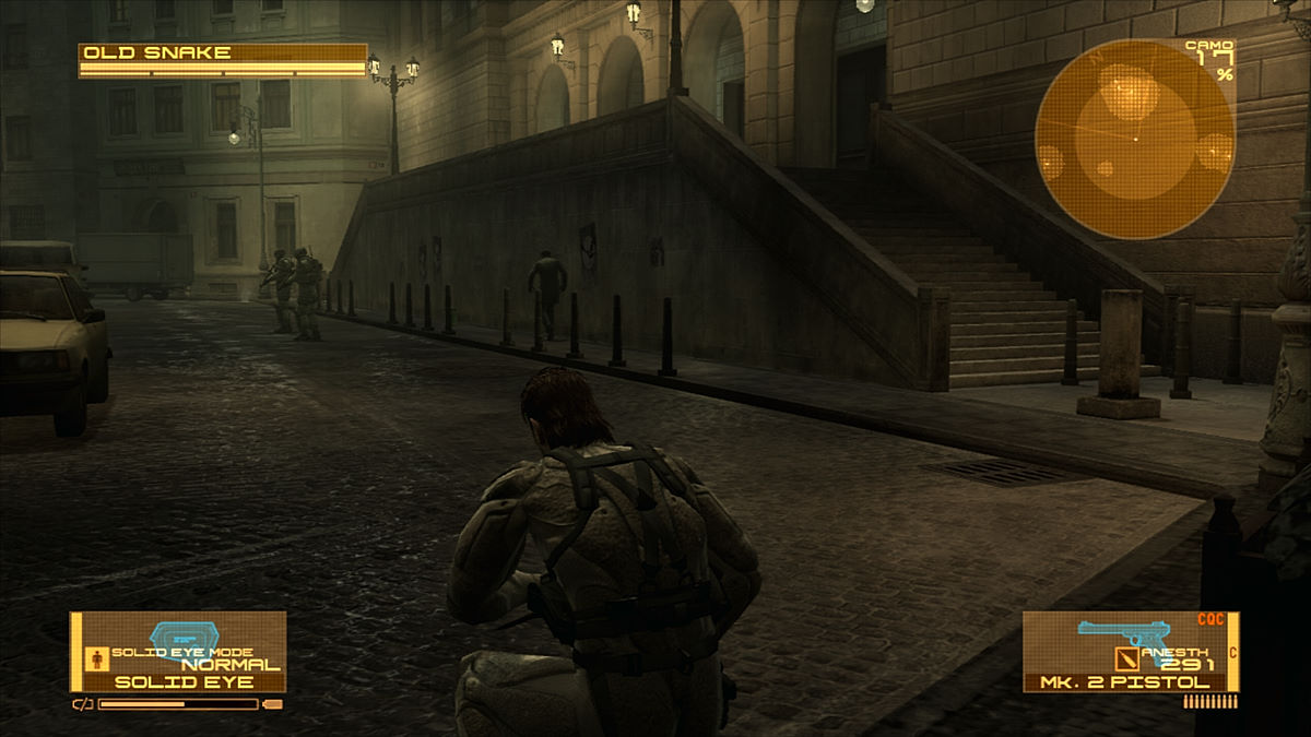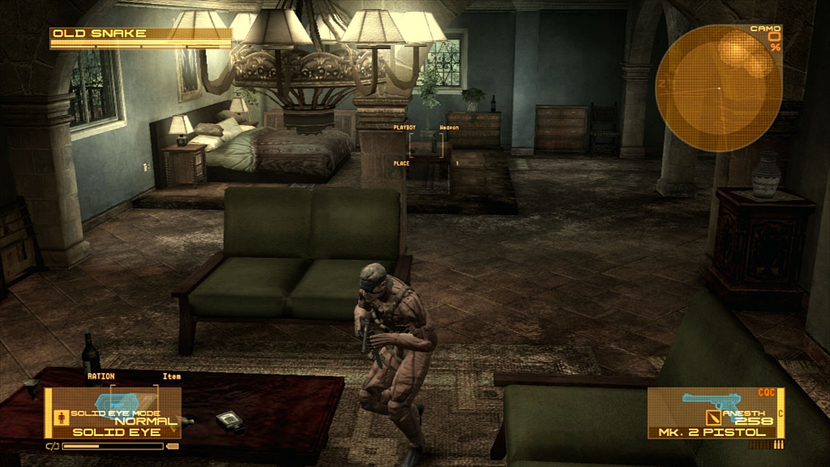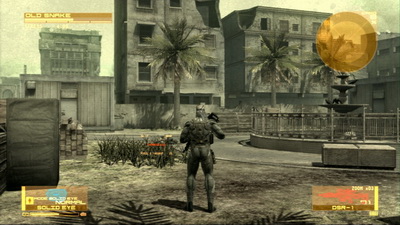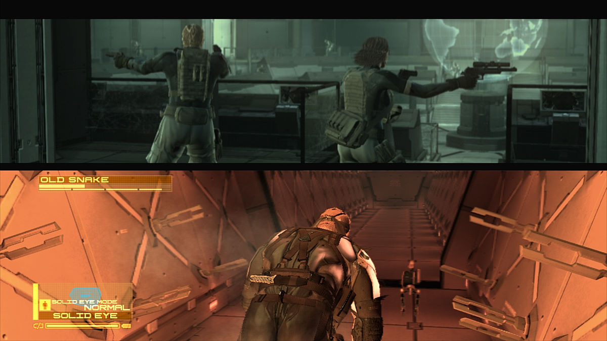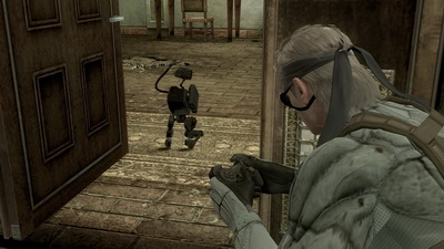 Si on regrette toujours que la jouabilité ne soit pas progressive (avec seulement 2 vitesses de déplacement), le Solid Eye se présente aussi comme un gadget de choix. Son autonomie n'est pas infinie, il faudra donc le laisser de côté de temps en temps pour qu'il se recharge mais il servira souvent. En effet, il permet d'avoir un puissant zoom, la vision nocturne/infra-rouges (dans un mixage des 2 techniques) et fera office de remplaçant du Soliton (le fameux radar, même s'il ne s'avère pas aussi efficace que ce dernier dans cette fonction). Kojima aime toujours autant jouer avec ses fans. Par exemple, le magasin de Drebin offre 20% de réduction si on joue les mercredi et dimanche. A Shadow Moses, à l'endroit même où on devait à l'époque changer de disque, Otacon nous demandera de changer de Blu-Ray... avant de s'apercevoir qu'il n'y en a pas besoin.
