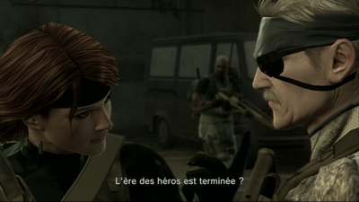 L'écran titre s'ouvre sur cette scène, un tableau qui nous dépeint dans un vague souvenir (la fin de MGS3 avec les pétales qui volent), un héros au pied d'une tombe, un héros à bout et qui veut en finir. Mais il est encore trop tôt, Snake doit avant ça récolter les graines du chaos qu'il a semé. Et une fois encore, la moitié de l'intérêt du jeu réside dans sa narration extrême. On passe presque 50% de l'aventure devant ces films à acteurs virtuels, des films où la mise en scène est tout simplement fantastique. Grâce à la motion-capture, il sera désormais difficile d'égaler la perfection dont témoigne chaque scène du jeu. Il est vrai qu'il subsiste encore quelques longueurs, des passages aux dialogues pas toujours intéressants et qui rendent, forcément, le dynamisme plus mou. Mais c'est dans ces interludes qu'on pourra vraiment apprécier la qualité des modélisations, le réalisme poussé à l'extrême de chaque scène.