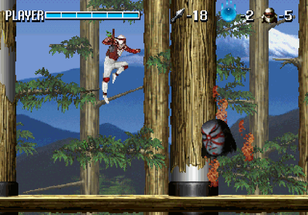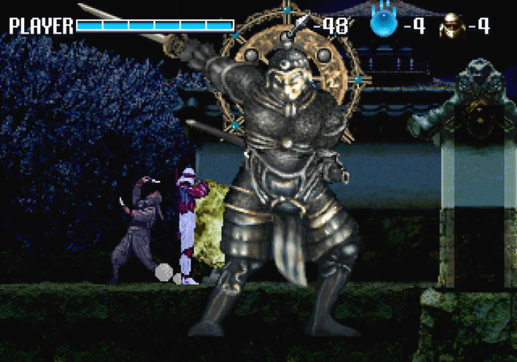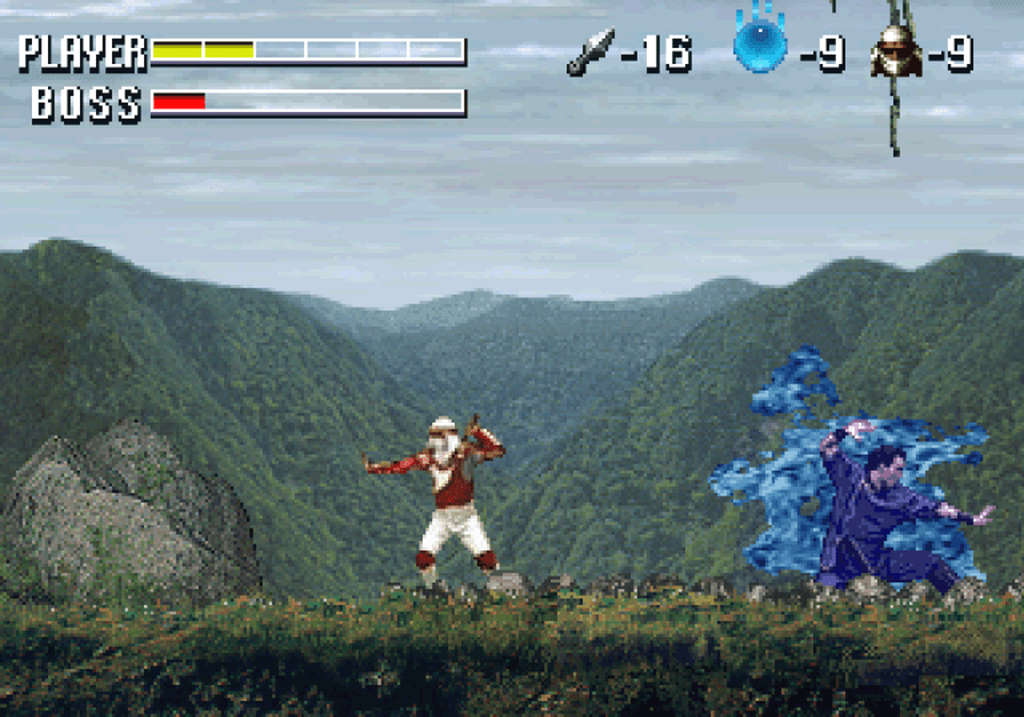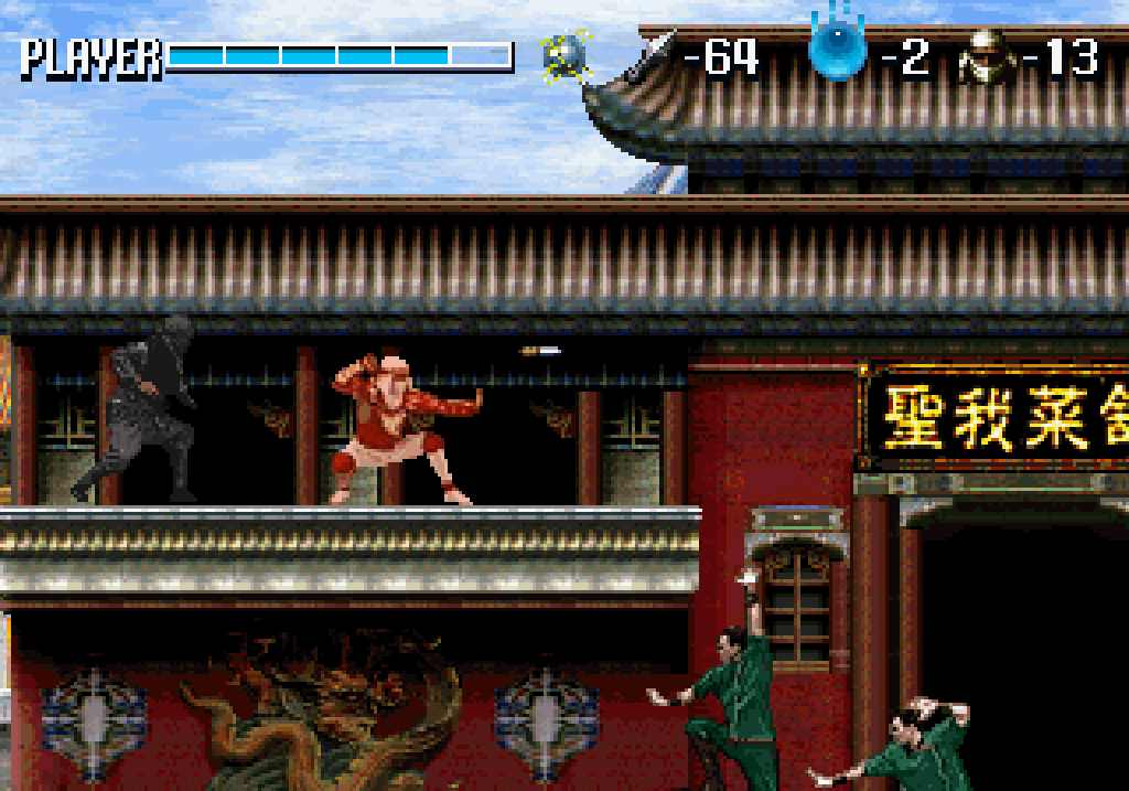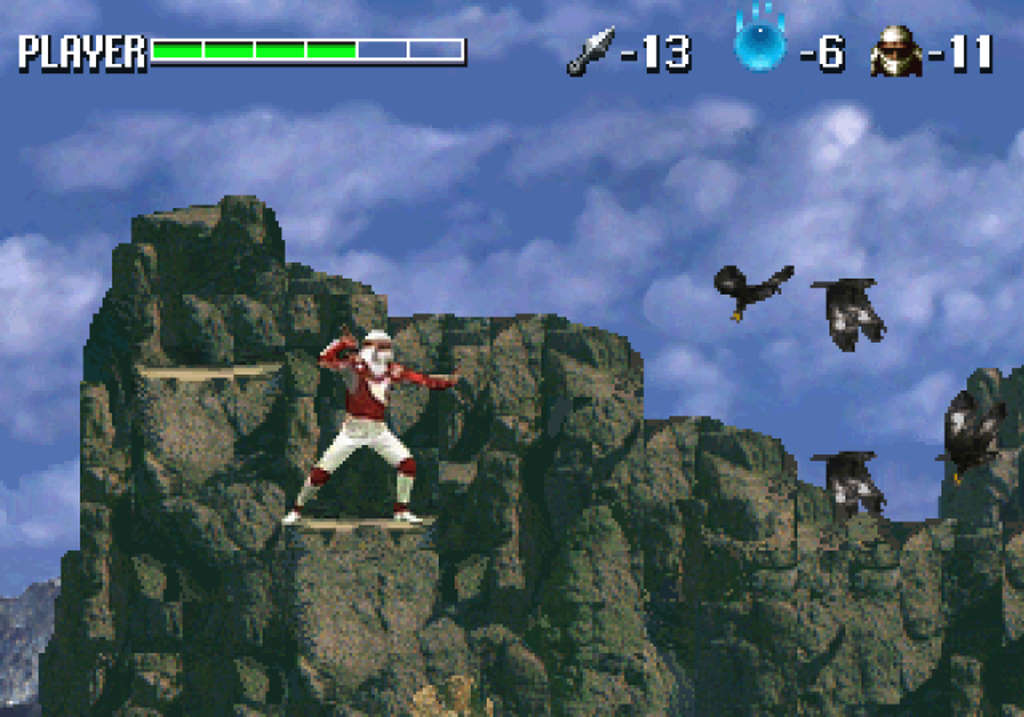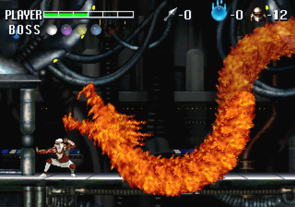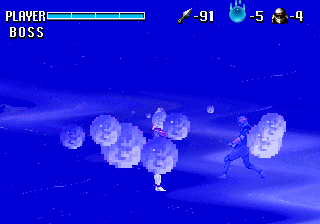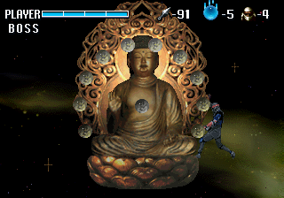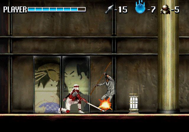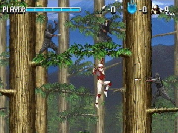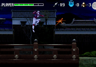 La jouabilité n'est pas précise, et le jeu table sur de vieilles ficelles qui n'ont plus lieu d'être sur une console 32-bits n'est autre que le "dragon de tonnerre" qui, celui-ci, est à activer manuellement durant le stage en cours, via la touche X. Ce pouvoir détruit tous les ennemis à l'écran dans un joli effet graphique, mais si vous ne l'utilisez pas avant la fin du stage, il disparait. Au final le meilleur ninjutsu du jeu, c'est le boss final qui l'a ! Il envoie des dragons de feu qui ondulent et traversent l'écran, c'est super classe... mais pas pour nous. Voilà, on a fait le tour des ninjutsus et si vous connaissez la trilogie sur Mega Drive, déjà vous vous dites qu'on a fait un sacré bond en arrière. Mais vous allez le voir, ce n'est pas fini.