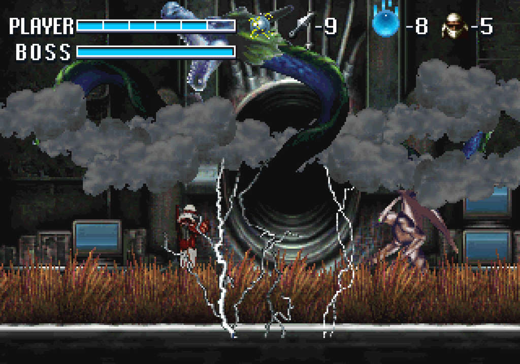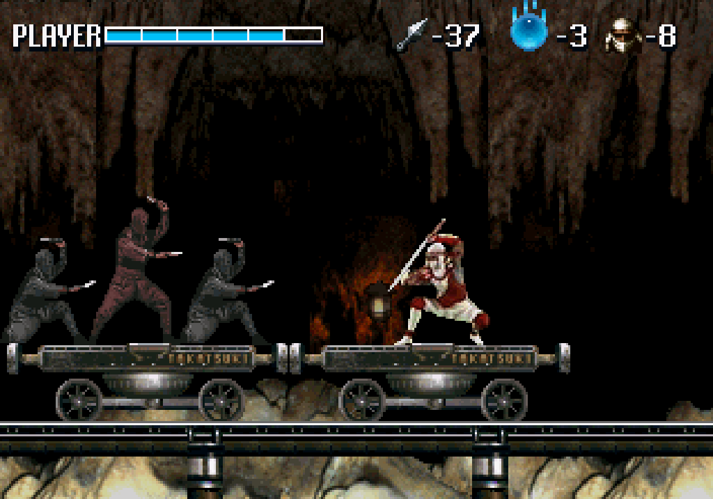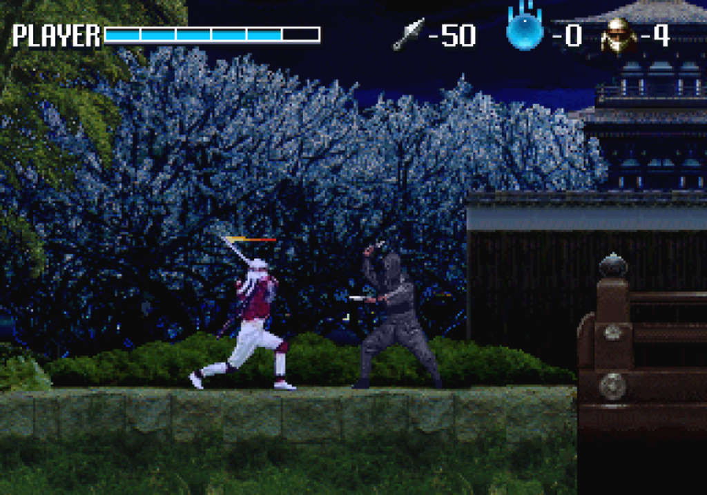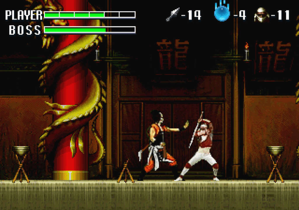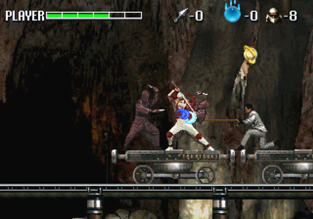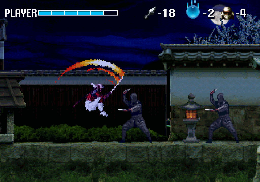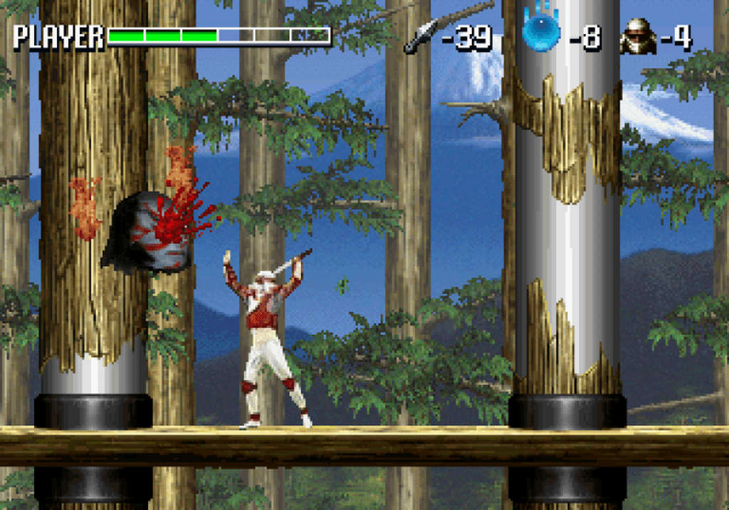 La jouabilité n'est pas précise, et le jeu table sur de vieilles ficelles qui n'ont plus lieu d'être sur une console 32-bits n'est autre que le "dragon de tonnerre" qui, celui-ci, est à activer manuellement durant le stage en cours, via la touche X. Ce pouvoir détruit tous les ennemis à l'écran dans un joli effet graphique, mais si vous ne l'utilisez pas avant la fin du stage, il disparait. Au final le meilleur ninjutsu du jeu, c'est le boss final qui l'a ! Il envoie des dragons de feu qui ondulent et traversent l'écran, c'est super classe... mais pas pour nous. Voilà, on a fait le tour des ninjutsus et si vous connaissez la trilogie sur Mega Drive, déjà vous vous dites qu'on a fait un sacré bond en arrière. Mais vous allez le voir, ce n'est pas fini.