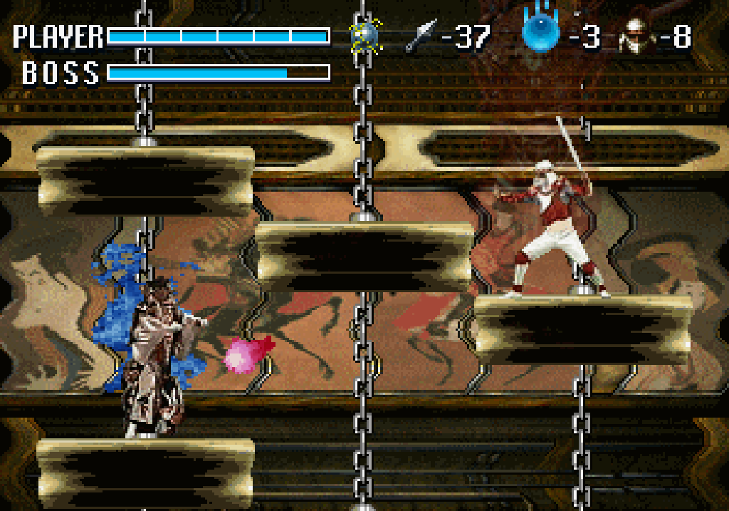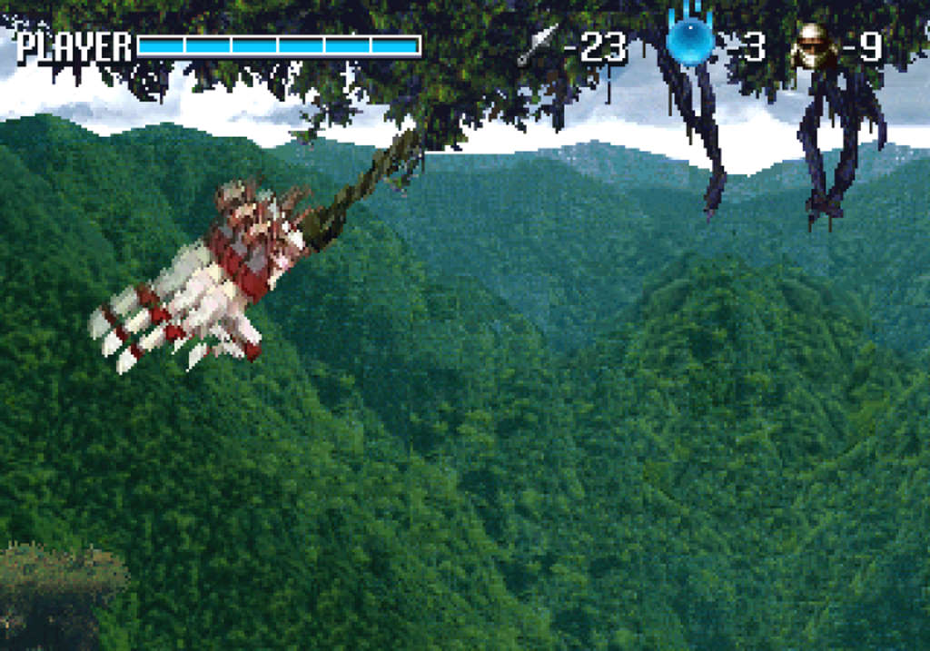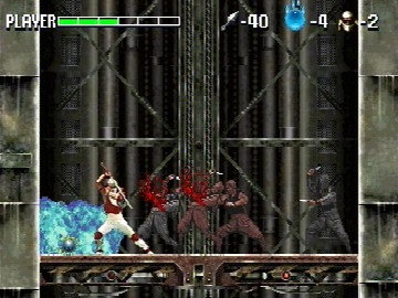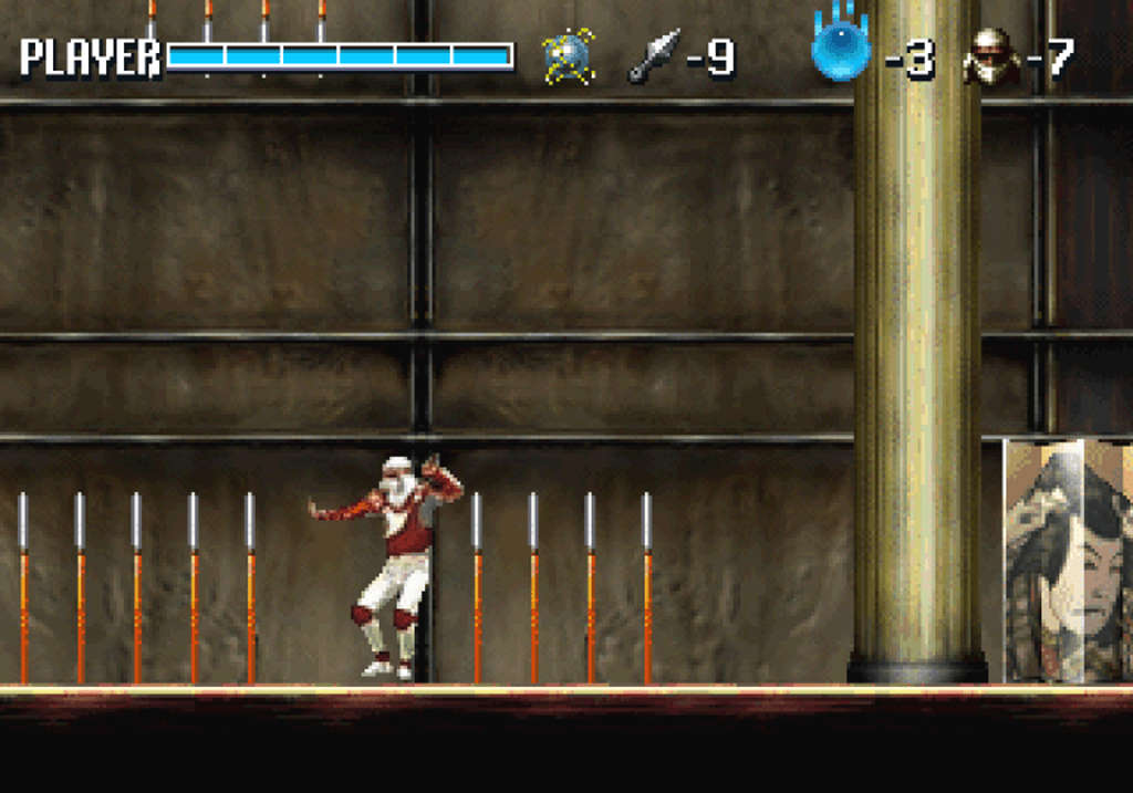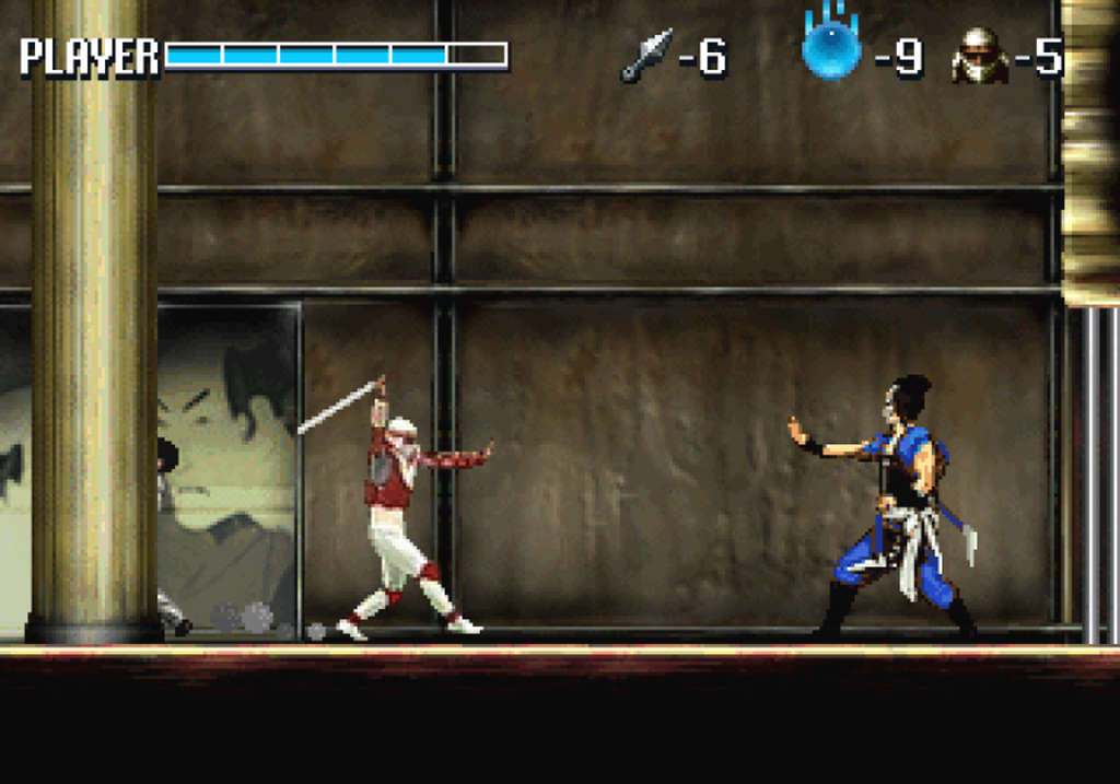 C'est à croire que les développeurs n'ont jamais joué aux anciens épisodes car certaines modifications sont incompréhensibles retrouve les items classiques comme de quoi remonter sa santé, renflouer sa réserve de kunais (le plus gros n'en redonne que 5 le radin) et on collecte aussi d'étranges orbes bleues. Bien avant que ça deviennent une monnaie d'échange dans Devil May Cry ou Onimusha, en collecter 10 donne une vie (mais les trouver vous demandera de fouiller un peu... vraiment un tout petit peu). Le jeu est donc plus rapide, plus incisif mais aussi moins "tactique" qu'autrefois. En jouant, on remarque également que Shinobi X n'est pas censuré (du moins dans mes 2 versions occidentales) puisqu'il arrive qu'on coupe son adversaire en 2, dans une jolie effusion de sang (bon, c'est pas du Samuraï Shodown non plus). Maintenant il va falloir être un peu plus critique, car jusqu'ici j'ai trouvé certaines excuses pour certains défauts, mais il va falloir passer à la vitesse supérieure.