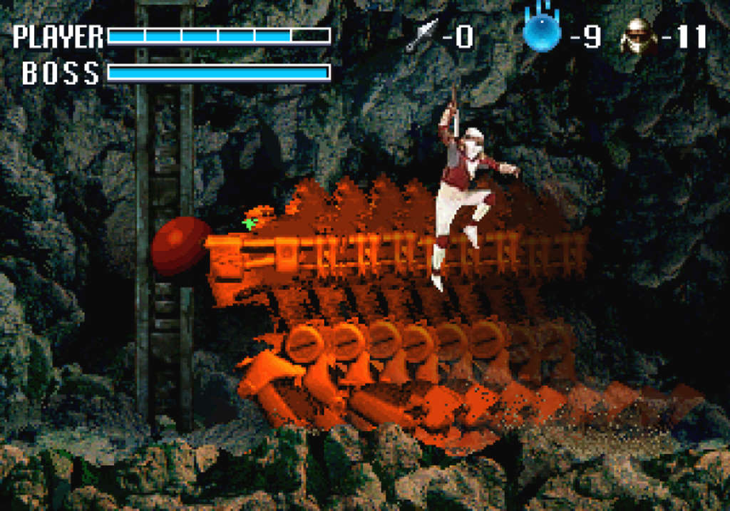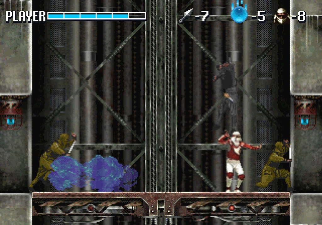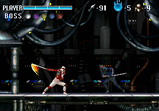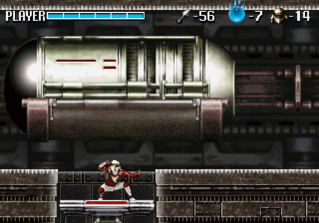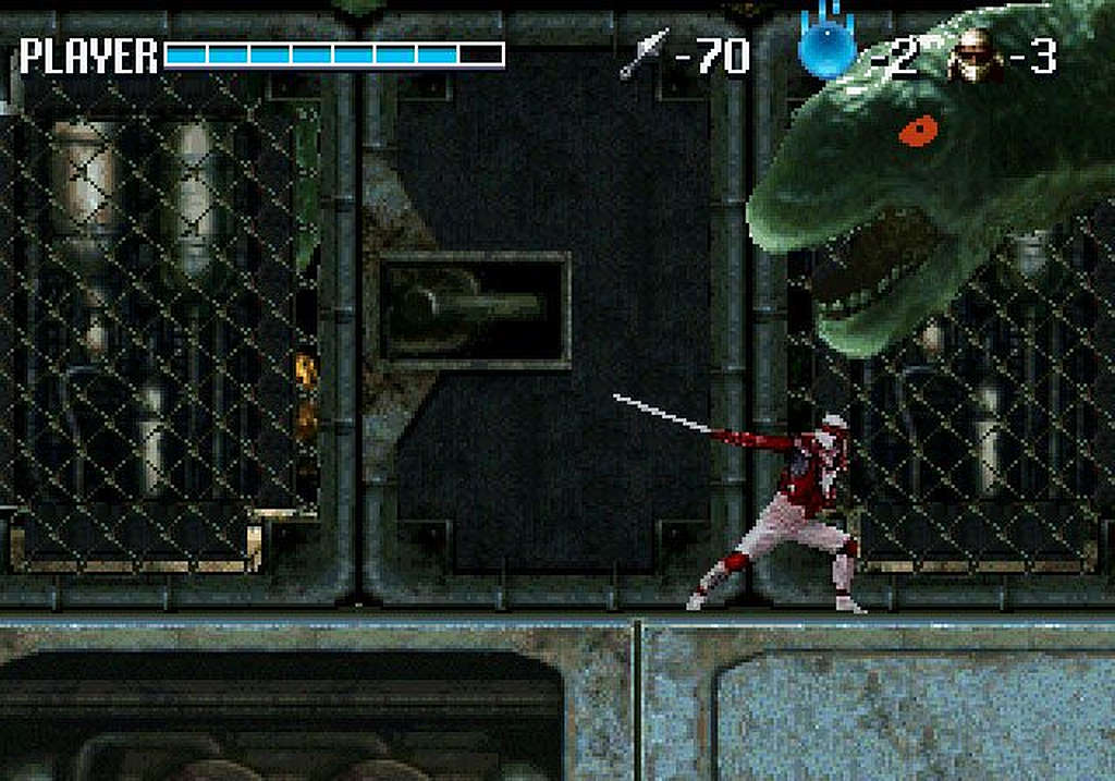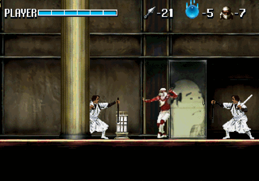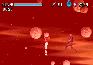 OK et celui du labo avec des bestioles qui attendent sagement dans des incubateurs, ça ne vous rappelle rien ? Ou encore cette usine de missiles où il faut absolument éviter les-dit missiles et ce, 30 fois d'affilé ? Un dernier avec ce port chinois (enfin je suppose) où il faut sauter de bateau en bateau, parce que si on tombe dans l'eau on meurt ! Et oui, vous ne le saviez peut-être pas mais l'eau ça tue... Vous l'aurez compris, la difficulté est très élevée, le plus souvent à cause d'une jouabilité assez pourrie. Car le fin du fin, la cerise sur le gâteau, c'est encore et toujours cette merde de double-saut. Le niveau 1-2 est tout en verticalité et chuter vous fait tout reprendre depuis le début ! Donner des coups de sabre, Sho avance de 2 pas et c'est la chute. Lorsqu'il se fait toucher, il fait un incontrôlable bond en arrière, et c'est la chute. Au passage, bien évidemment, tous les ennemis reviennent. Ce level représente tout ce que je déteste dans un jeu d'action...