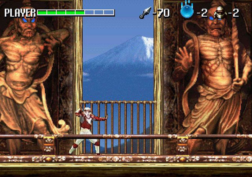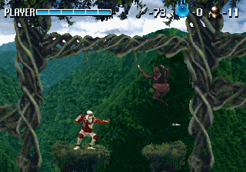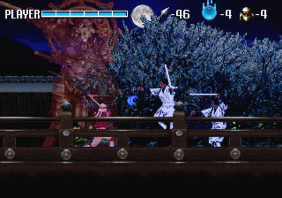 Le jeu est tout en 2D et la plupart des sprites et des décors ont été digitalisés... avec plus ou moins de goût c'était avant que je finisse le jeu. En effet, les animations sont toujours d'excellente facture. Quelque soit la taille du sprite, c'est toujours bien animé (notamment le masque de kabuki en tant que premier boss du jeu). Sho, notre personnage, a beau avoir été "mortal-kombatisé", il reste plutôt class' et ses postures donnent bien le change. Mais alors, qu'est-ce qui ne va pas ? Et bien à peu près tout le reste. Déjà au sein d'un même niveau, vous n'aurez que 2 à 3 ennemis différents. Ils varient pas mal entre les niveaux mais à l'intérieur de ceux-ci, à cause d'une RAM limitée à 2 Mo, ils n'ont pas eu d'autres choix.