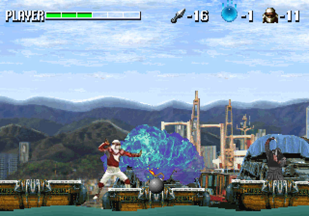 Oui les vidéos "Live Action" sont kitch mais perso je les trouve pas si mal, tout à fait dans leur époque so '90 besoin d'épiloguer sur la teneur du scénario ? Ultra classique, nous avons le méchant déjà fort qui veut devenir encore plus fort (et qui se sacrifiera au dernier moment pour sa rédemption), nous avons la jolie princesse à sauver (dont le héros est sûrement amoureux en secret) et puis nous avons le guerrier, celui qui va sauver le monde et la princesse, car il faut bien un monde en paix pour profiter de son idylle amoureuse. Qu'est-il arrivé à Joe Musashi, son fils Hayate et son chien Yamato ? Nul ne le sait car personne n'en parle. En passant sur une nouvelle console, visiblement on tire un trait sur le passif de la série. L'aventure se déroule malgré tout dans un monde moderne, à minima parce qu'il y a des bâtiments en béton et des charpentes en acier, sans parler de la scène finale avec... heu... je sais pas trop ce que c'est, une usine, un vaisseau spatial, bref un truc hi-tech avec plein de lumières qui clignotent.