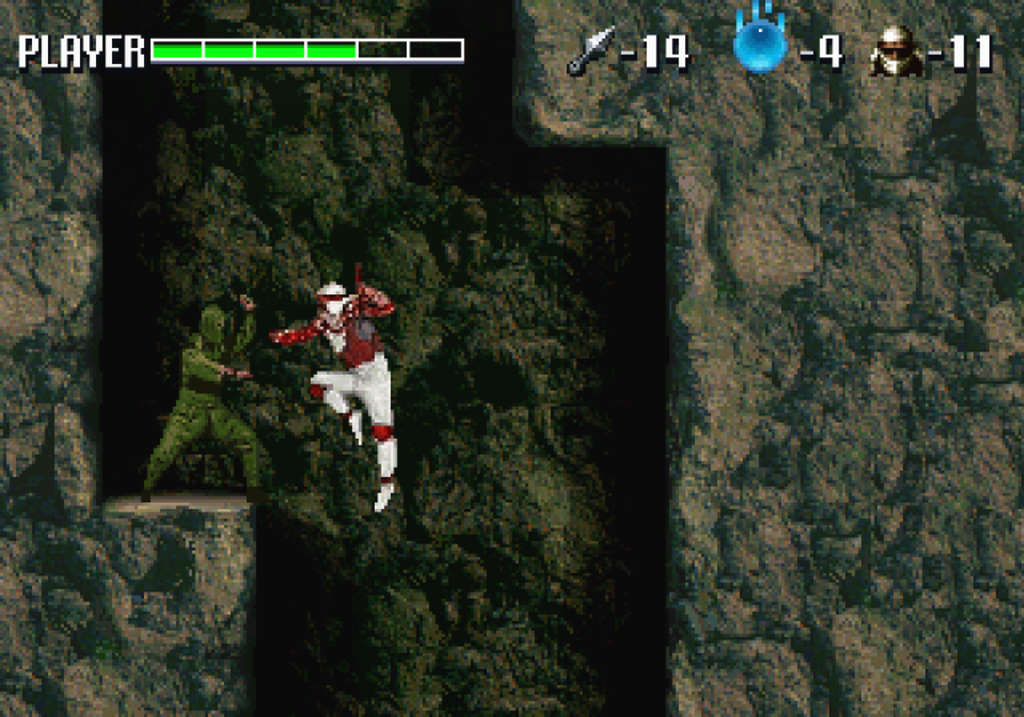 J'ai fini Shinobi X en version Euro et croyez-moi, je me suis arraché les cheveux de la tête ! Et vous voulez connaitre le pire dans tout ça ? Et bien c'est que la version américaine en NTSC est très différente de ce côté-là. Alors attention, la jouabilité est toujours aussi pourrie, imprécise, le jeu est aussi dur (malgré ses 2 points de vie supplémentaires) mais, allez savoir comment ça se fait, le double-saut passe mieux... Vous avez bien lu, en NTSC le double-saut marche presque à chaque fois. On peut même le réaliser sans être à la cime de son saut initial (ce qu'on ne peut pas faire en version Euro). Vous me rétorquerez que c'est grâce au 60hz (contre 50hz chez nous) mais à ce compte là, tous les jeux sortis en Europe seraient injouables alors ! Non, il y a clairement une différence entre les 2 versions... même si ça n'enlève pas TOUS LES AUTRES DEFAUTS !