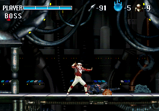 Une fois l'intro passée, on tombe sur le menu principal. Alors autant vous prévenir, Shinobi X n'utilise pas de système de sauvegarde, ni de passwords. La durée de vie étant d'environ 2 heures, SEGA a estimé que vous pouviez le finir d'une traite. On a quand même un joli menu d'options où on peut configurer les touches de sa manette (mais seulement les 3 principales, ce qui est idiot, j'y reviendrai après), la difficulté sur 3 niveaux et on retrouve un classique Sound Test. Ah oui j'oubliais, il y a aussi le nombre de kunais qu'on veut emporter, entre 0 et 100 (ça aussi je vais y revenir). On lance sa partie et très vite on retrouve les bases : briser des objets pour récupérer des items, double-saut avec lequel on peut lancer 8 kunais en quart de cercle, rebond sur une paroi, certains ennemis qui laissent des bombes en mourant, jauge de santé, pouvoir courir en pressant 2x avant et réaliser un coup de sabre... Super, tout est là ! En réalité, pas tout à fait.