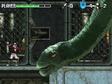 Et bien malheureusement, si le tout premier niveau est plutôt flatteur, ce sera tragiquement l'un des rares "jolis" niveaux. Pour preuve, le niveau 1-2 (cette purge tout en verticalité qui m'a fait péter un plomb) est d'une laideur sans borne. Sérieux quoi, c'est quoi ce décor ? L'AM7 et TOSE se sont encore cru sur Mega Drive ou quoi ? Le niveau suivant (le labo) est vide et de plus en plus fort, on se fait attaquer par une tête de brachiosaure. Alors je sais, nous sommes en 1995, l'aura de Jurassic Park résonne encore, les dinosaures ont un regain de popularité et même mieux, bien souvent dans les Shinobi on affronte des ennemis un peu étranges ou décalés, comme Godzilla pour ne citer que lui. Seulement là, on se demande bien ce qu'il fout ici, et puis c'est totalement hors de propos. C'est à croire qu'un stagiaire était tout fier d'avoir designé son dino alors le staff a voulu lui faire plaisir en l'implantant dans le jeu (le stagiaire en question devait être le neveu du producteur, ceci explique cela).