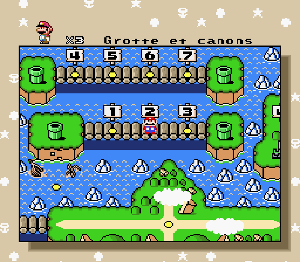 Overworld : changement de l'option "échanger les vies à l'écran de game over"... inutile puisque le mode 2 joueurs a disparu et suppression de 2 "picots" inutiles au sud du lac de Yoshi (bis) dans les rocheuses.