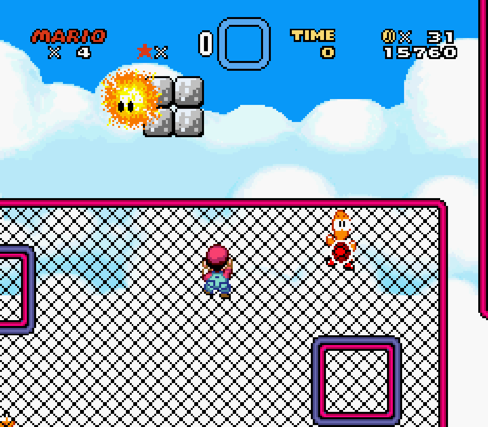 Cloud Gaming (monde 1) : mise en place d'un grillage pour évincer Yoshi car ce niveau se déroule à bord d'un nuage et Yoshi n'y a pas sa place.