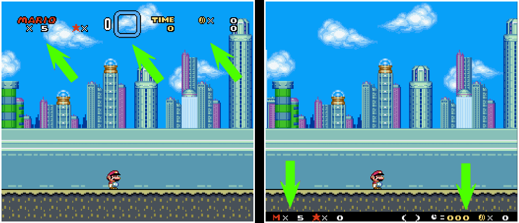 Le HUD est devenu minimaliste. Je trouve ça tellement plus pratique et ça permet de mieux apprécier les graphismes, plutôt que ce HUD assez énorme qui mange une partie de l'image. De plus, il arrive (selon mon level design) que Mario se retrouve tout en haut de l'écran, caché justement derrière cette interface... Là il n'y a plus de problème et au passage, ça a supprimé le score, ce vieil adage qui n'a plus de raison d'être aujourd'hui...