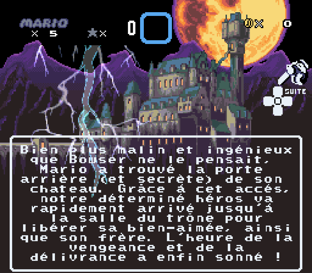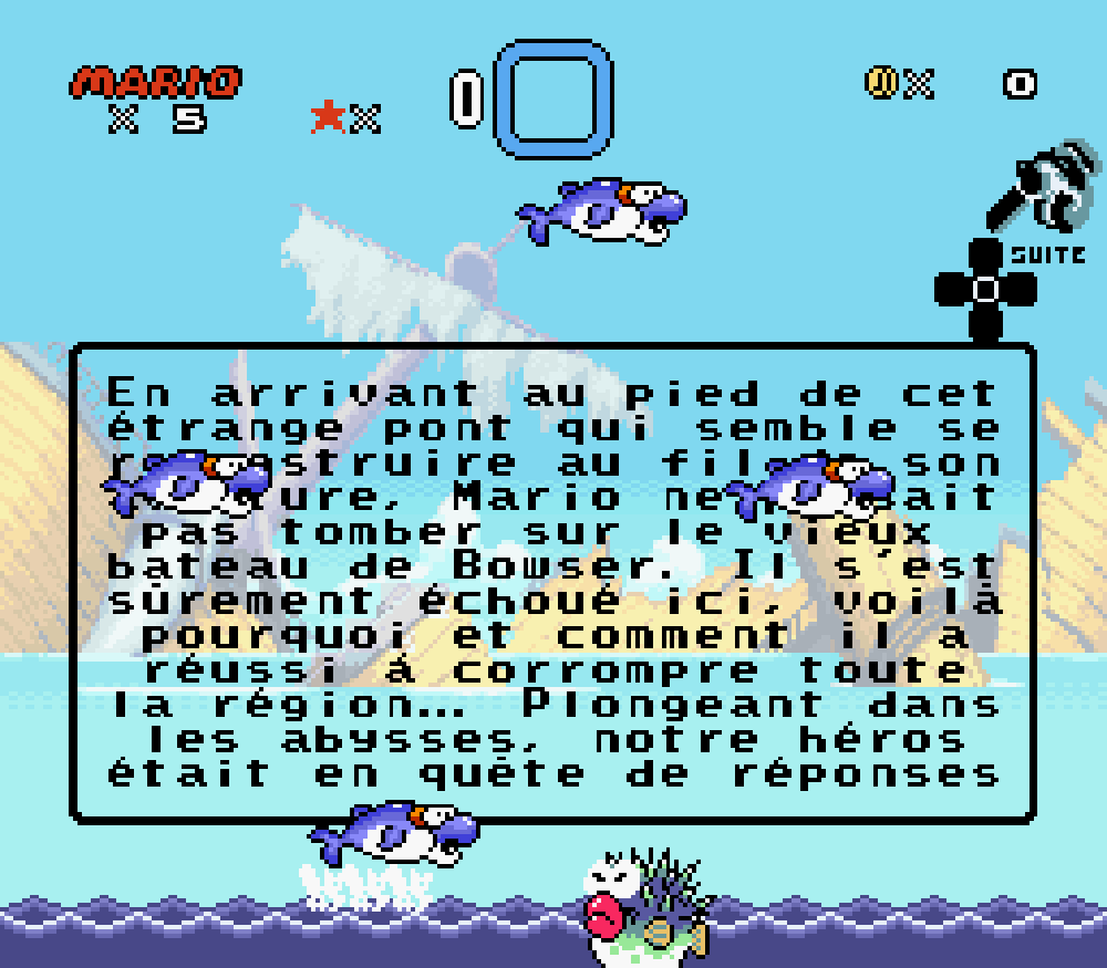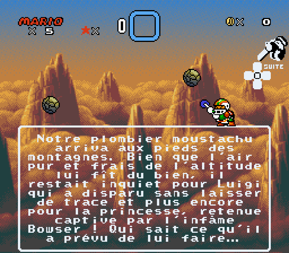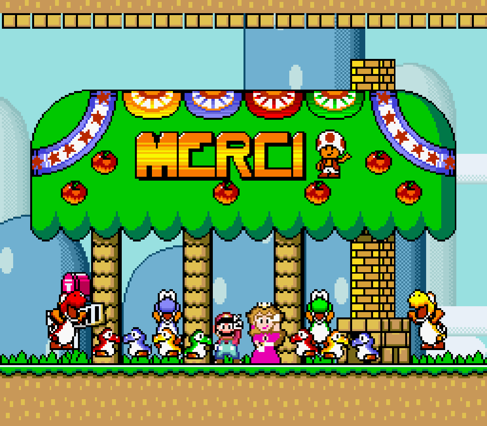 Nous avons traduit un maximum de textes en français tel que le "thank you" des oeufs de Yoshi à la fin de chaque boss, idem pour la bannière lors de l'épilogue ou le message de Peach encore prisonnière de son ravisseur