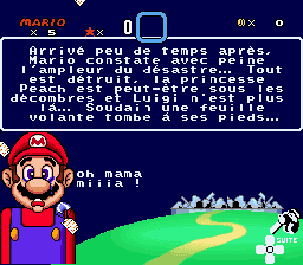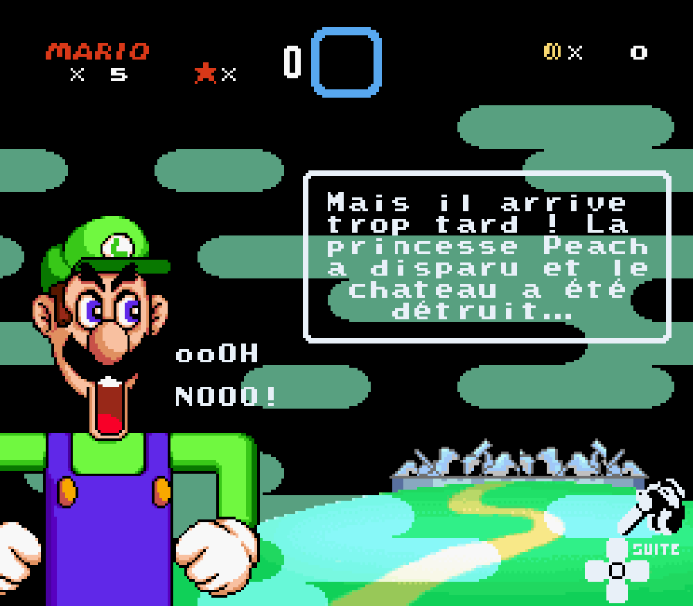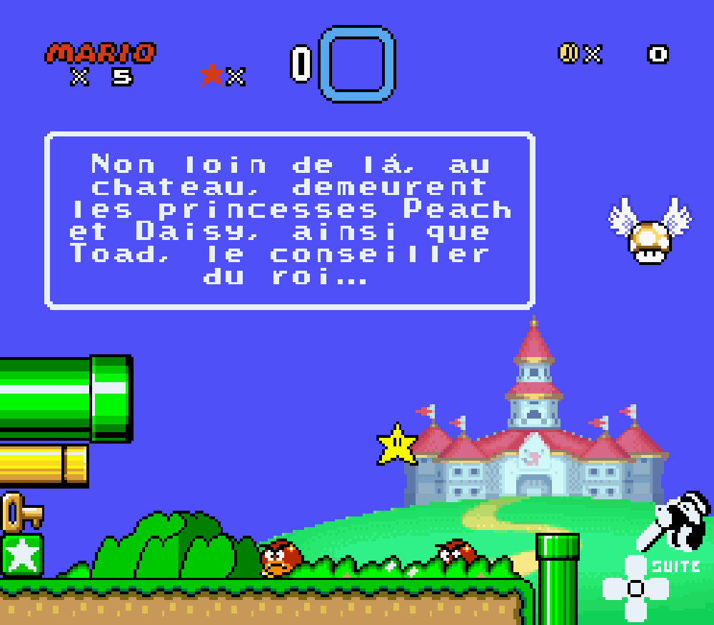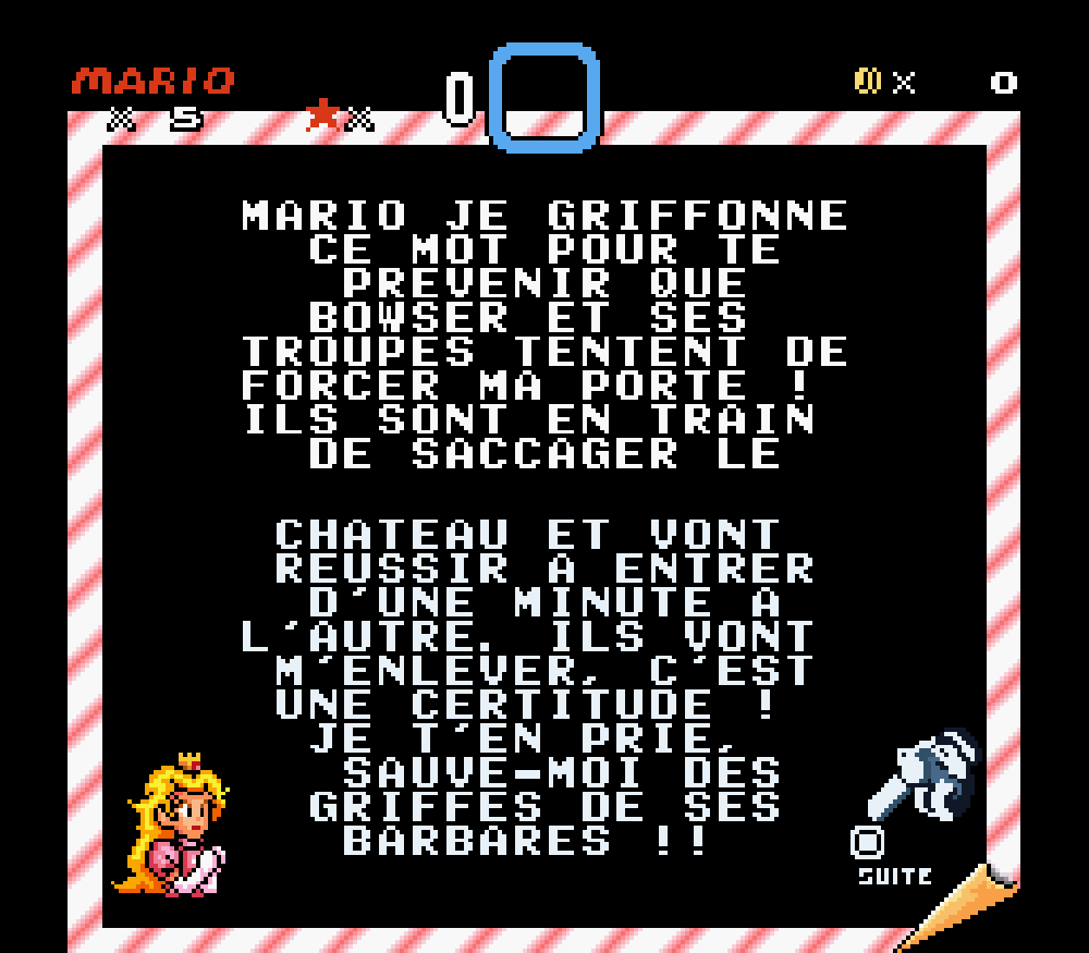 Nous avons traduit un maximum de textes en français tel que le "thank you" des oeufs de Yoshi à la fin de chaque boss, idem pour la bannière lors de l'épilogue ou le message de Peach encore prisonnière de son ravisseur
