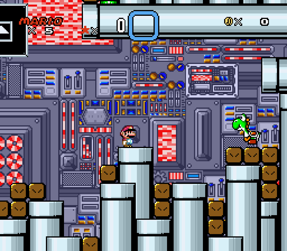Pour ce qui est des niveaux, tous ceux qui avaient un décor "de base" (issu du jeu d'origine) ont reçus un nouveau "background". On a fignolé chaque parcelle de décor, quitte même à modifier à la main les "tilesets" correspondants. Entre autre, j'ai modifié le tout premier niveau, qui jusqu'ici ne me satisfaisait pas entièrement (il faut dire que ce fut mon tout premier, je me suis fait la main dessus en 2008), et plusieurs niveaux ont également subis de lourdes modifications, à l'image du niveau "Gravitor Box" (oui, c'est un hommage à notre propre site ^_^), du Lac de Yoshis (où il y a désormais des algues) ou encore des Switch Palace, dont le décor et le level design a été retravaillé. Il en va de même pour tous les niveaux du jeu...