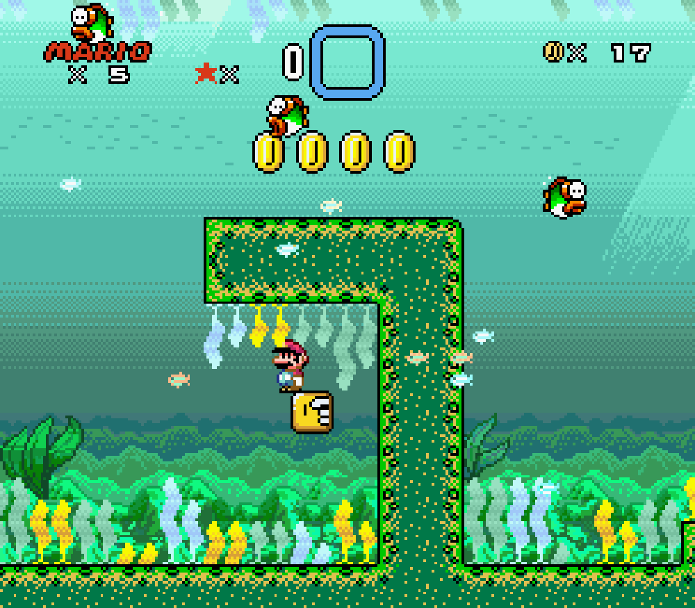 Mise en jambes (premier level du monde 1) : très légère modification du décor car l'algue qui ondulait autour du POW, dépassait du rebord.
